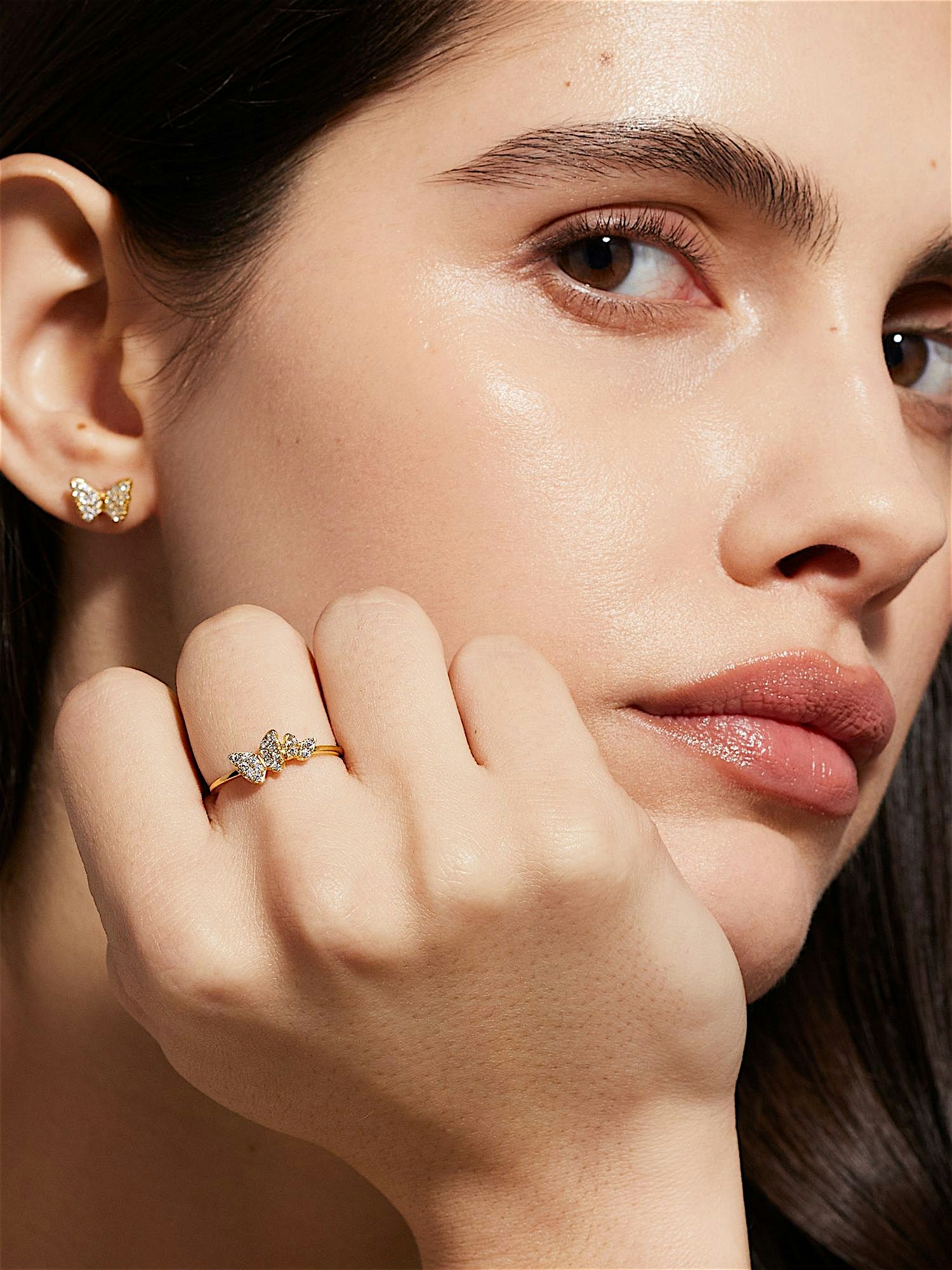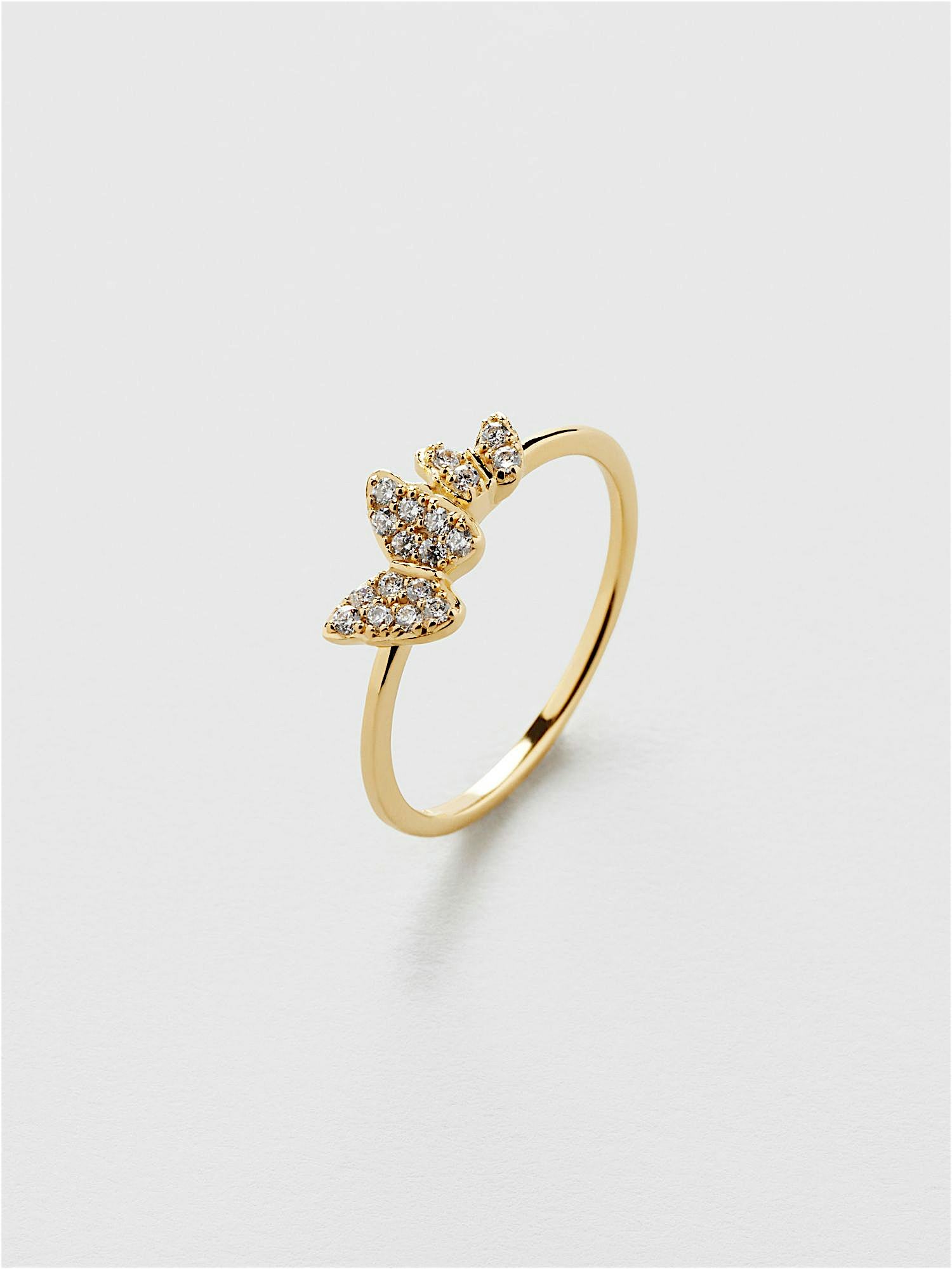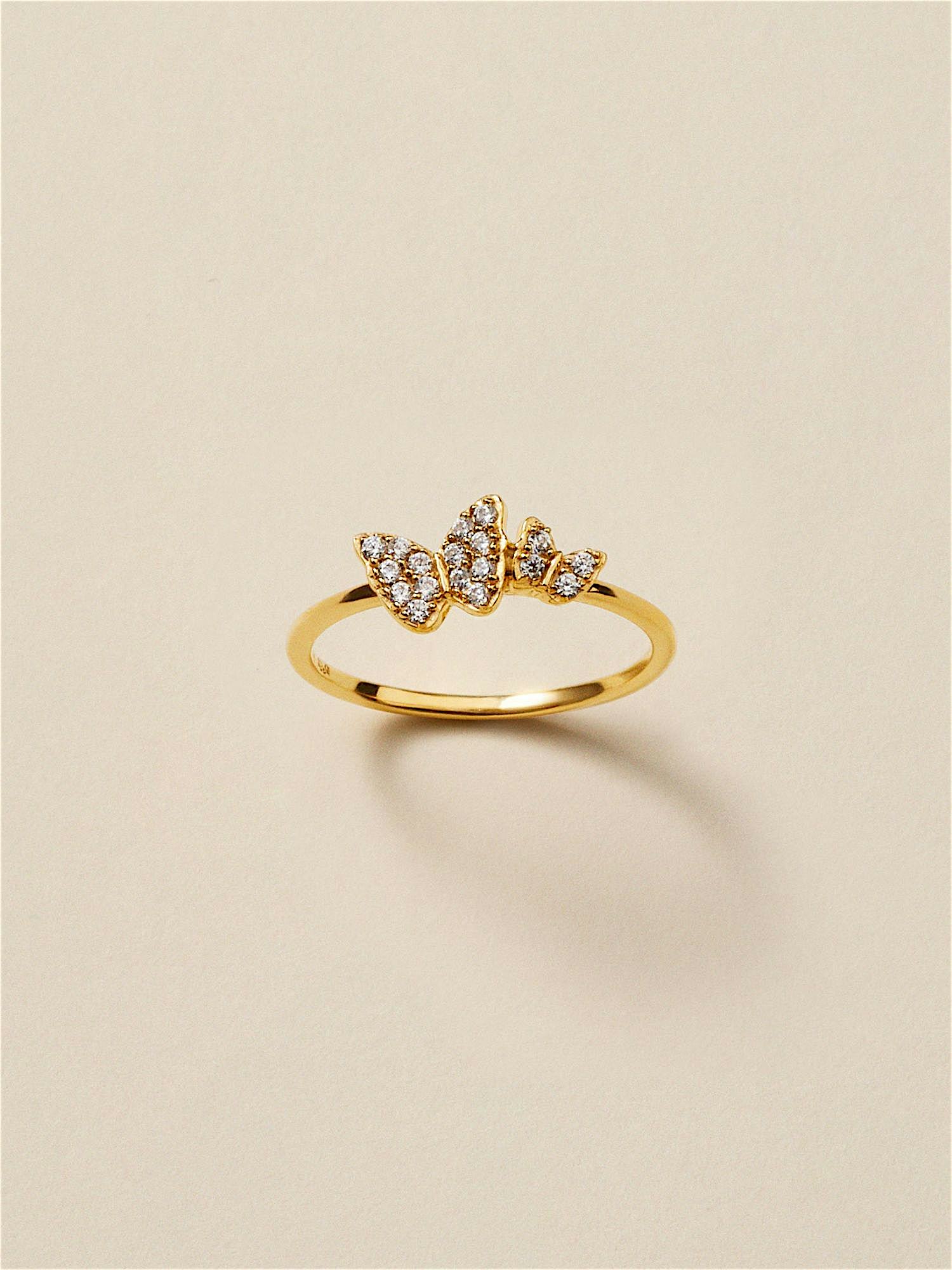 Ring with butterflies in genuine 925 sterling silver, decorated with clear Cubic Zirconia stones. The gold ring is plated with genuine 24K gold and has a core of genuine 925 sterling silver. This product is made from 100% recycled silver.