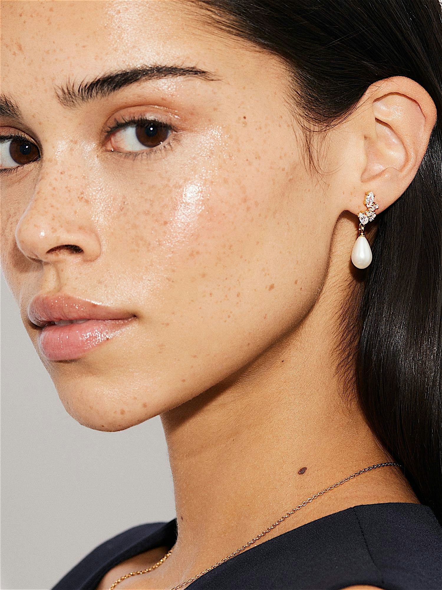 Perlenohrringe aus echtem 925er Sterlingsilber, mit klaren Cubic-Zirkonia-Steinen und echten Süßwasserperlen. Die Goldohrringe sind mit echtem 24K Gold vergoldet und haben einen Kern aus echtem 925er Sterlingsilber. Dieses Produkt ist aus 100 % recyceltem Silber hergestellt.