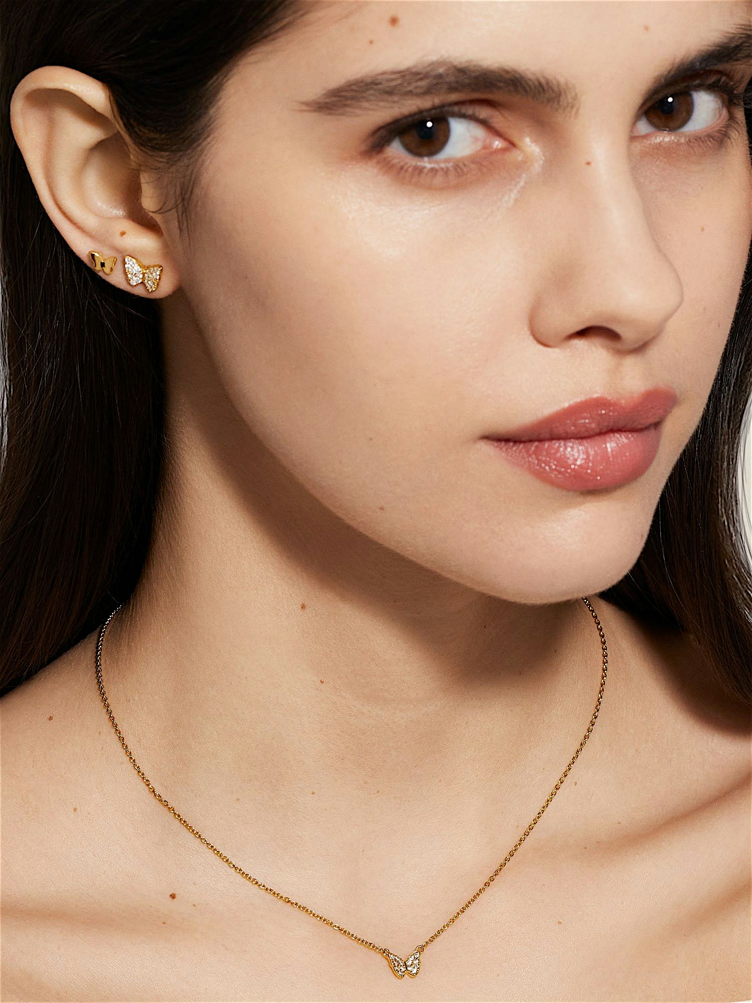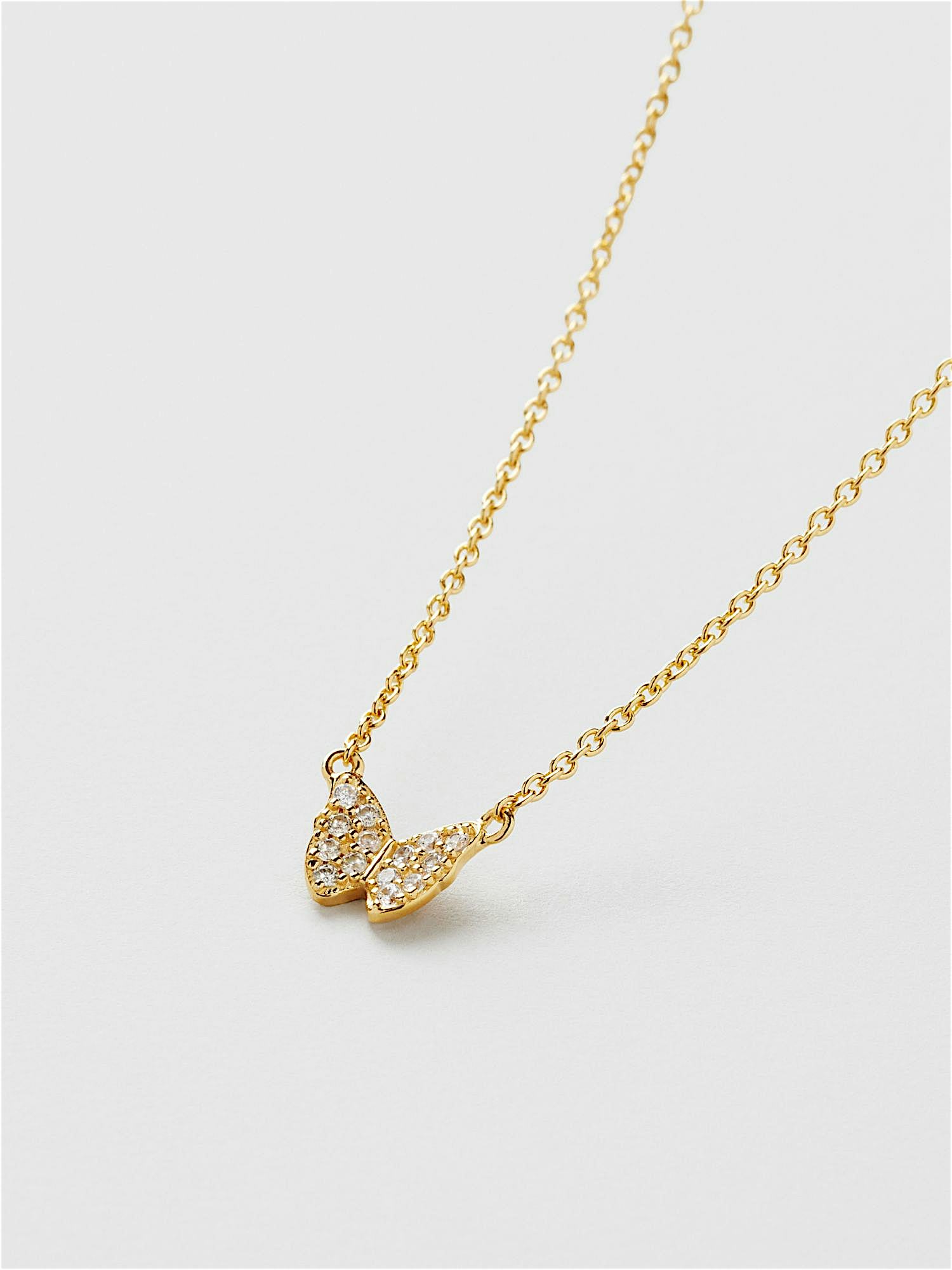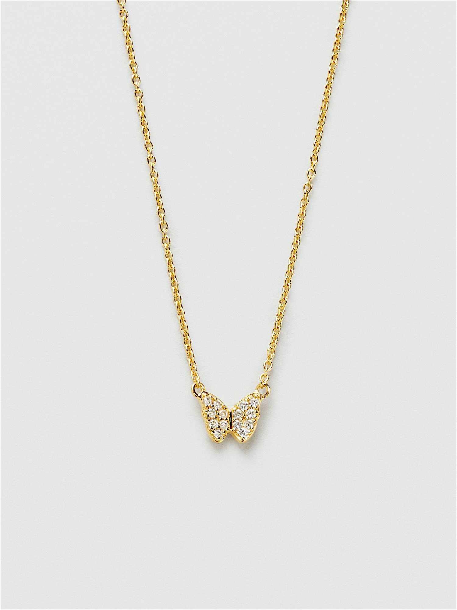 Halskette mit einem Schmetterling aus echtem 925er Sterlingsilber, verziert mit klaren Cubic Zirconia-Steinen. Die goldene Halskette ist mit echtem 18K-Gold vergoldet und hat einen Kern aus echtem 925er Sterlingsilber. Dieses Produkt besteht zu 100 % aus recyceltem Silber.