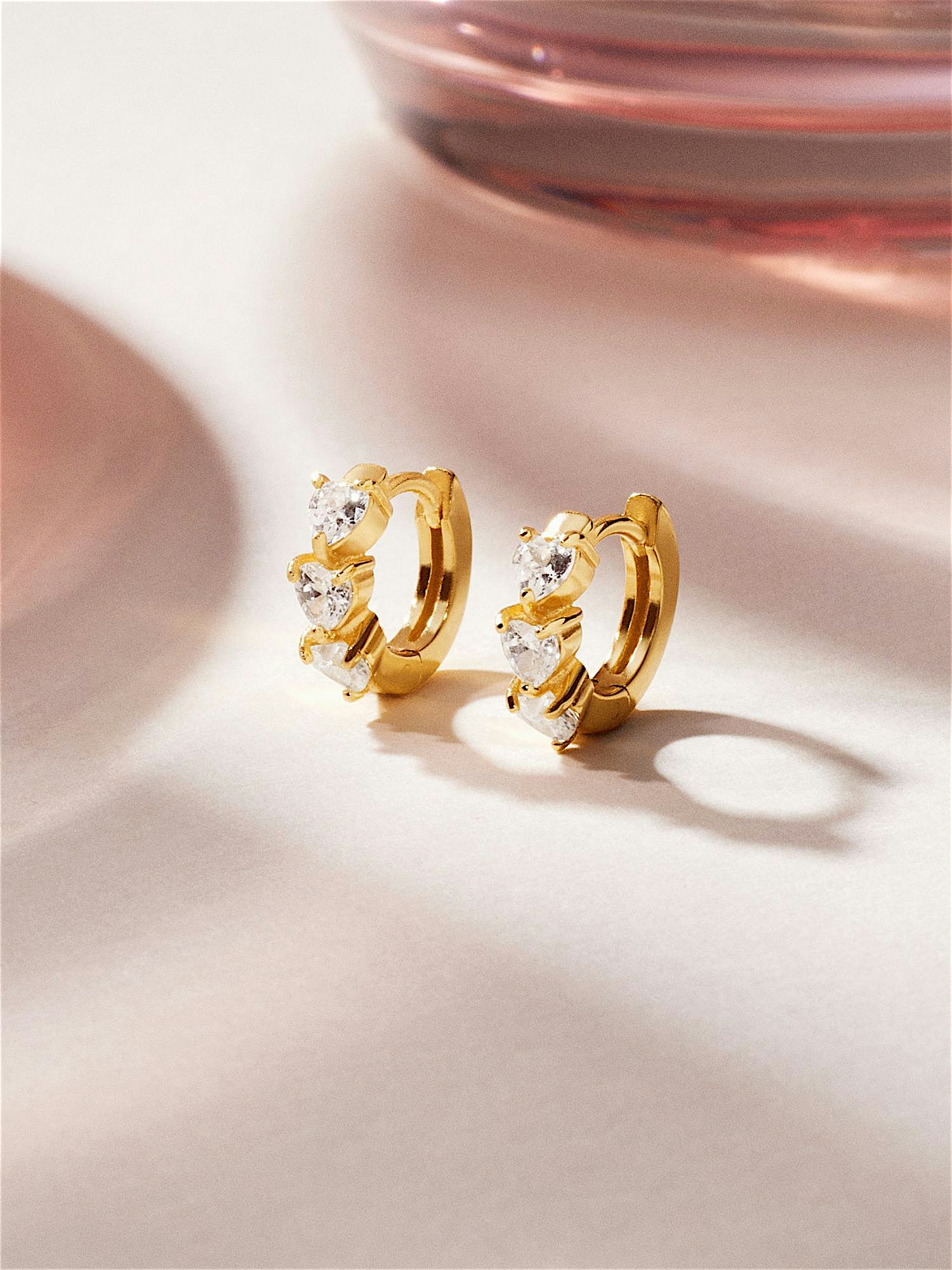 Huggie-Creolen aus echtem 925er Sterlingsilber, verziert mit klaren herzförmigen Cubic-Zirkonia-Steinen. Die Goldohrringe sind mit echtem 18K-Gold vergoldet und haben einen Kern aus echtem 925er Sterlingsilber. Dieses Produkt besteht aus 100 % recyceltem Silber.