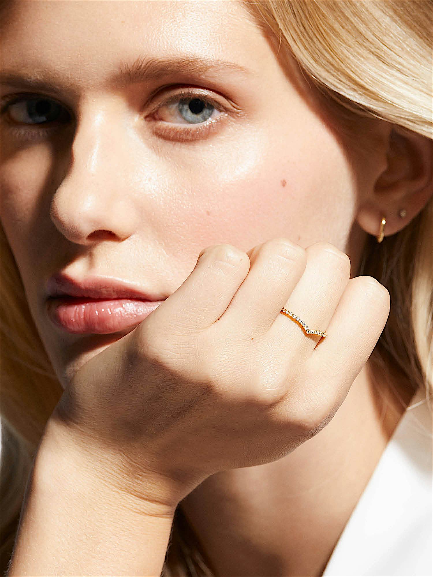 V-förmiger Ring, dekoriert mit insgesamt 0,12 ct Lab grown Diamanten in echtem 14K Weißgold oder echtem 14K Gelbgold. Das Produkt ist in Schweden entworfen und handgefertigt in Cordoba, Spanien. Alle unsere Fine Jewellery Schmuckstücke werden in einer exklusiven Geschenkbox geliefert.