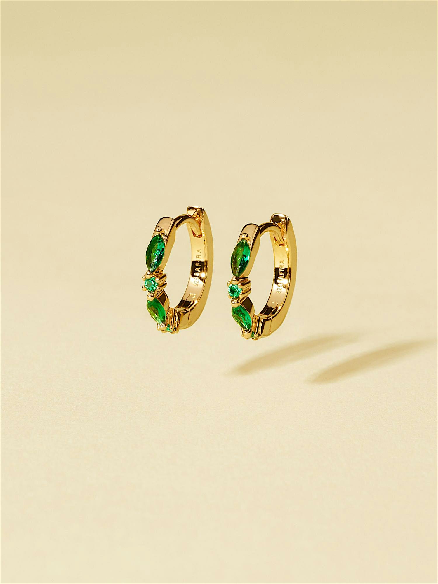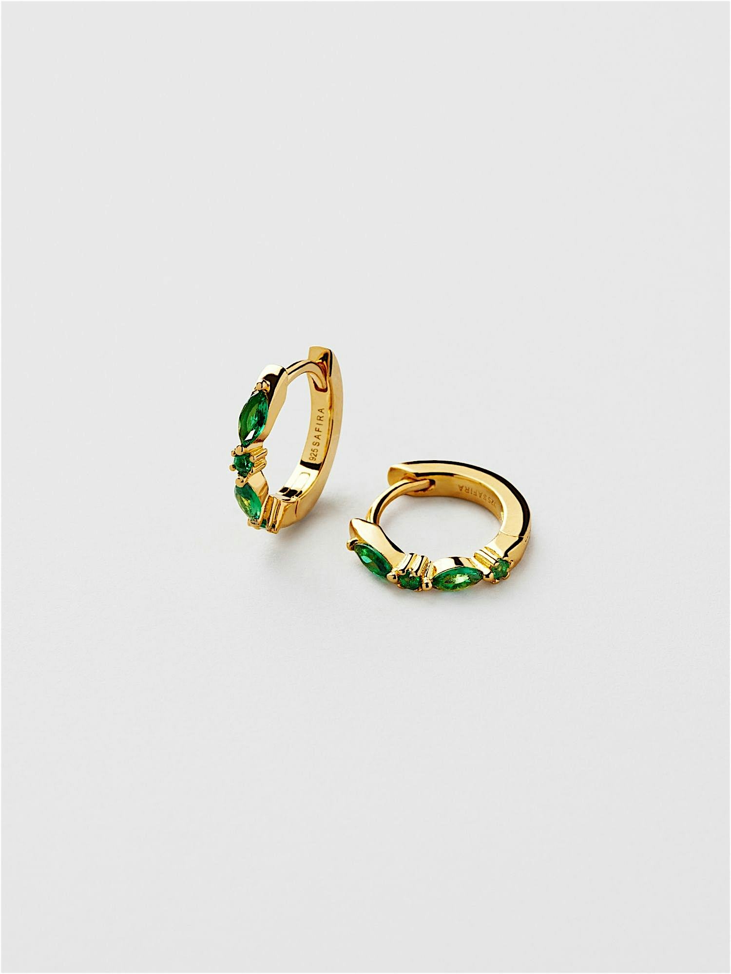 Creolen aus echtem 925er Sterlingsilber, verziert mit grünen Cubic Zirconia-Steinen. Die goldenen Ohrringe sind mit echtem 18K-Gold vergoldet und haben einen Kern aus echtem 925er Sterlingsilber. Dieses Produkt besteht zu 100 % aus recyceltem Silber.