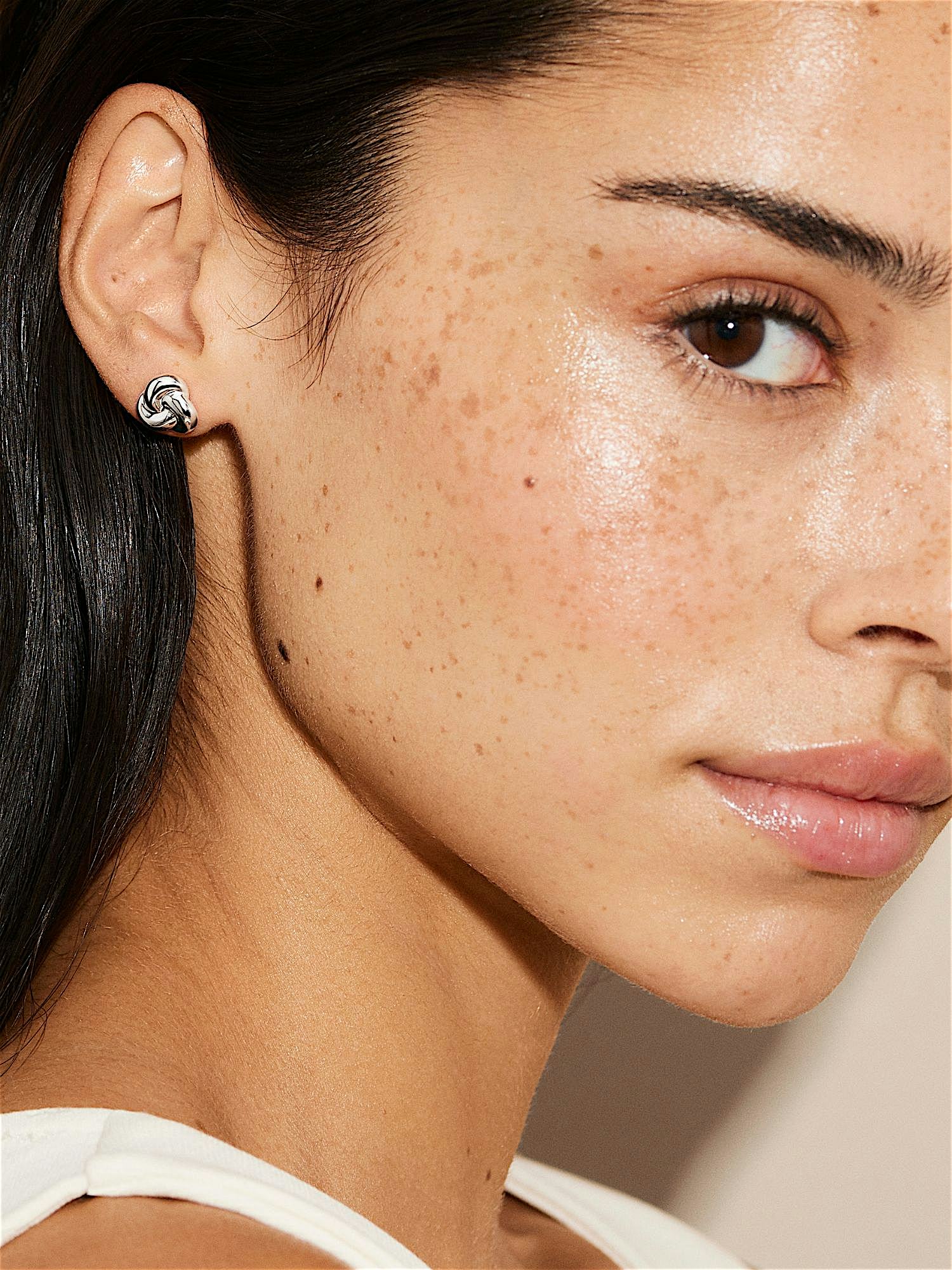 Knotenohrringe aus echtem 925er Sterlingsilber. Die goldenen Ohrringe sind mit echtem 24K Gold vergoldet und haben einen Kern aus echtem 925er Sterlingsilber. Dieses Produkt besteht aus 100 % recyceltem Silber.