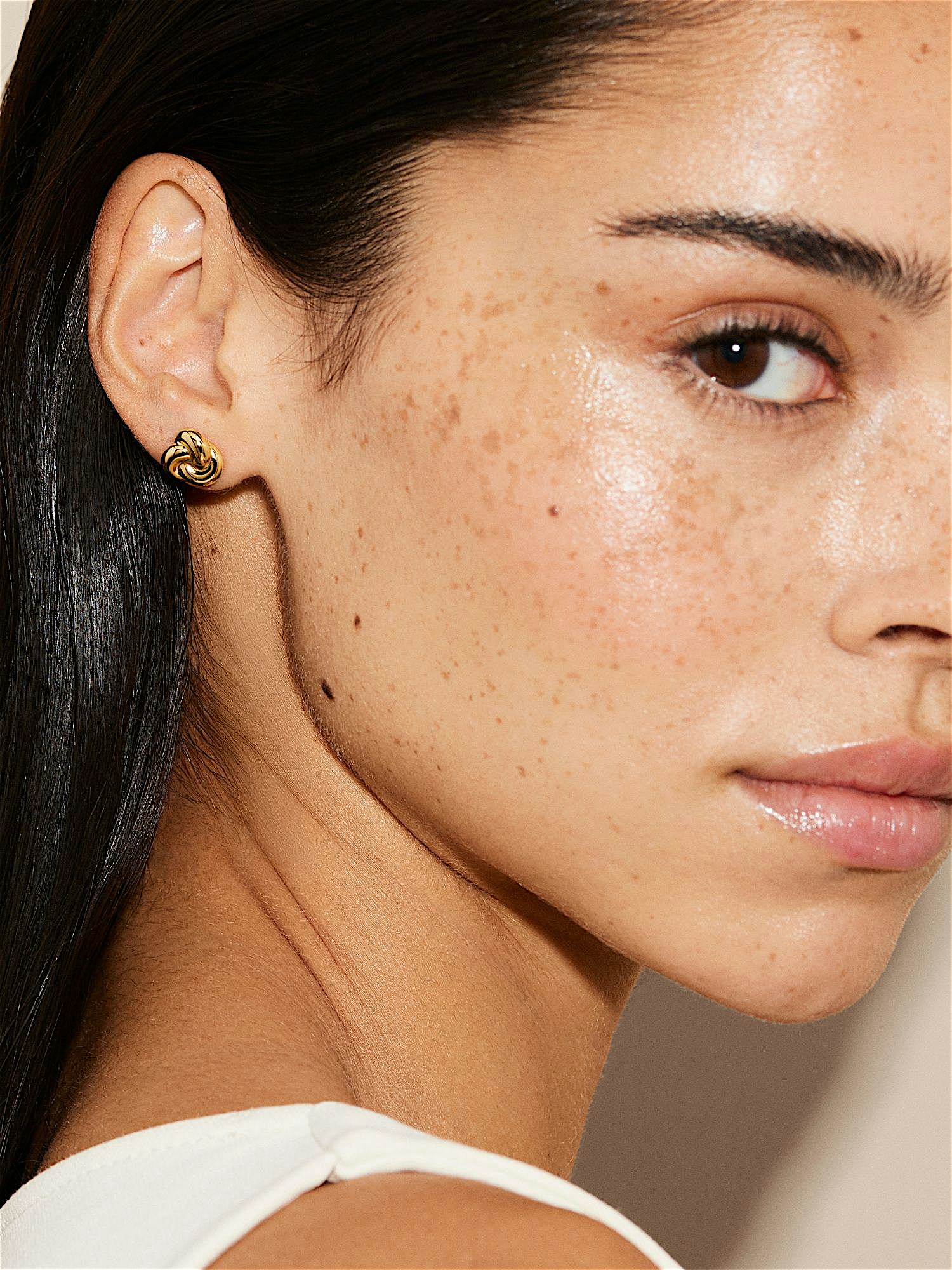 Knotenohrringe aus echtem 925er Sterlingsilber. Die goldenen Ohrringe sind mit echtem 24K Gold vergoldet und haben einen Kern aus echtem 925er Sterlingsilber. Dieses Produkt besteht aus 100 % recyceltem Silber.