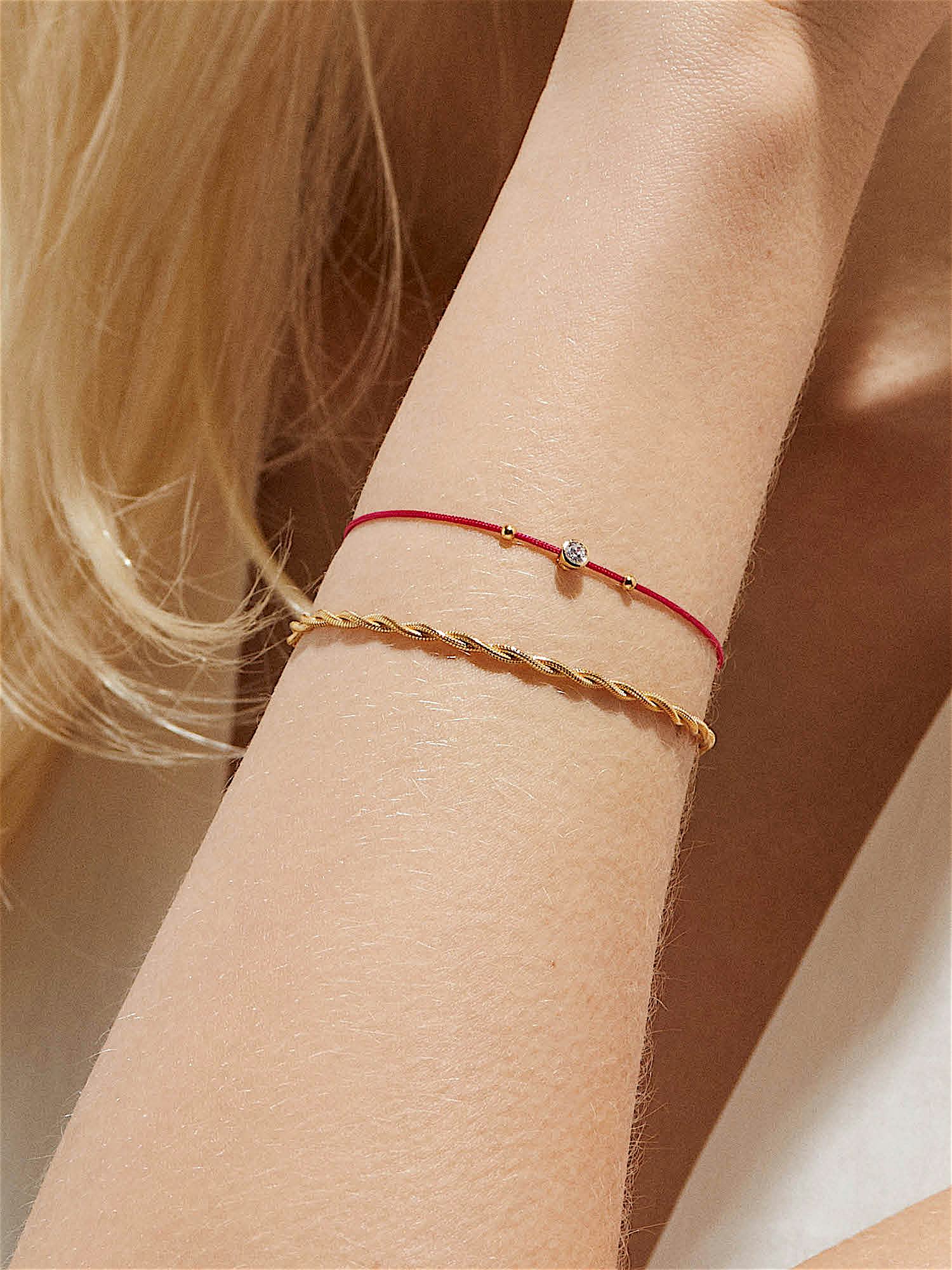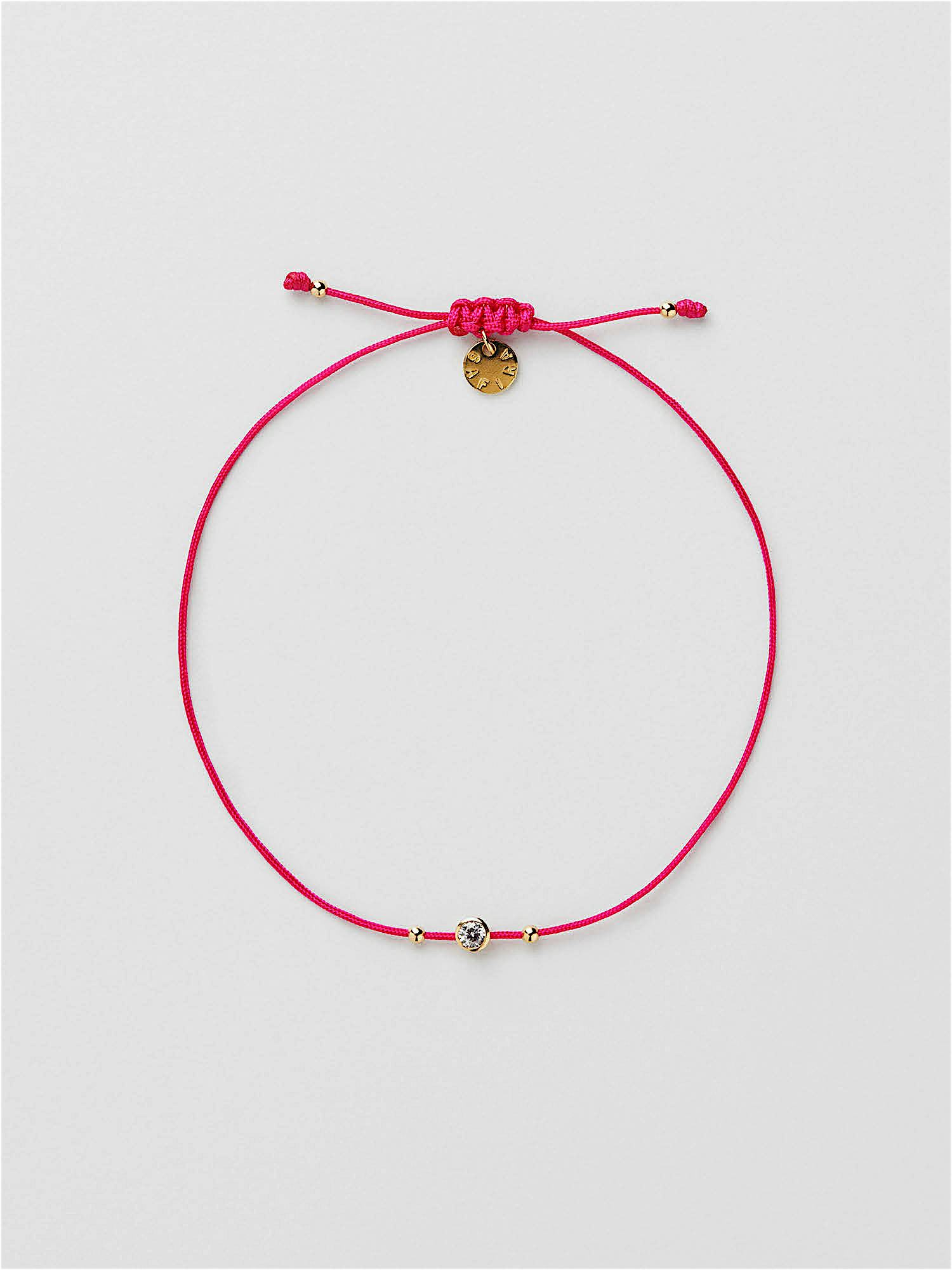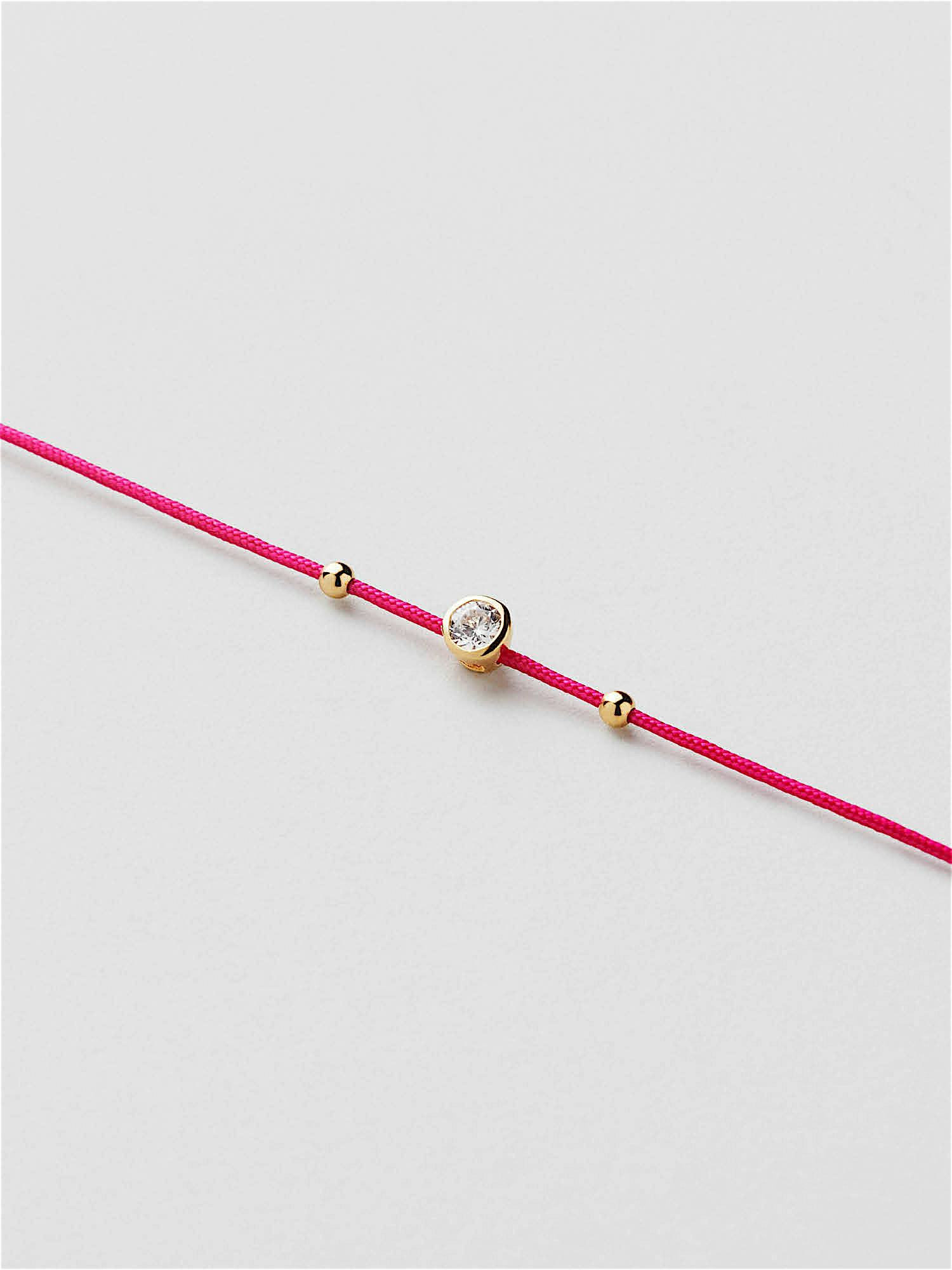 Dünnes rosa Fadenarmband mit einem klaren Cubic Zirkonia-Stein in einer Zargenfassung, vergoldet mit echtem 18K Gold. Das Armband ist verziert mit kleinen runden Perlen, vergoldet mit echtem 18K Gold und hat einen Kern aus echtem 925 Sterlingsilber. Dieses Produkt ist aus 100% recyceltem Silber hergestellt. Das Armband ist verstellbar.