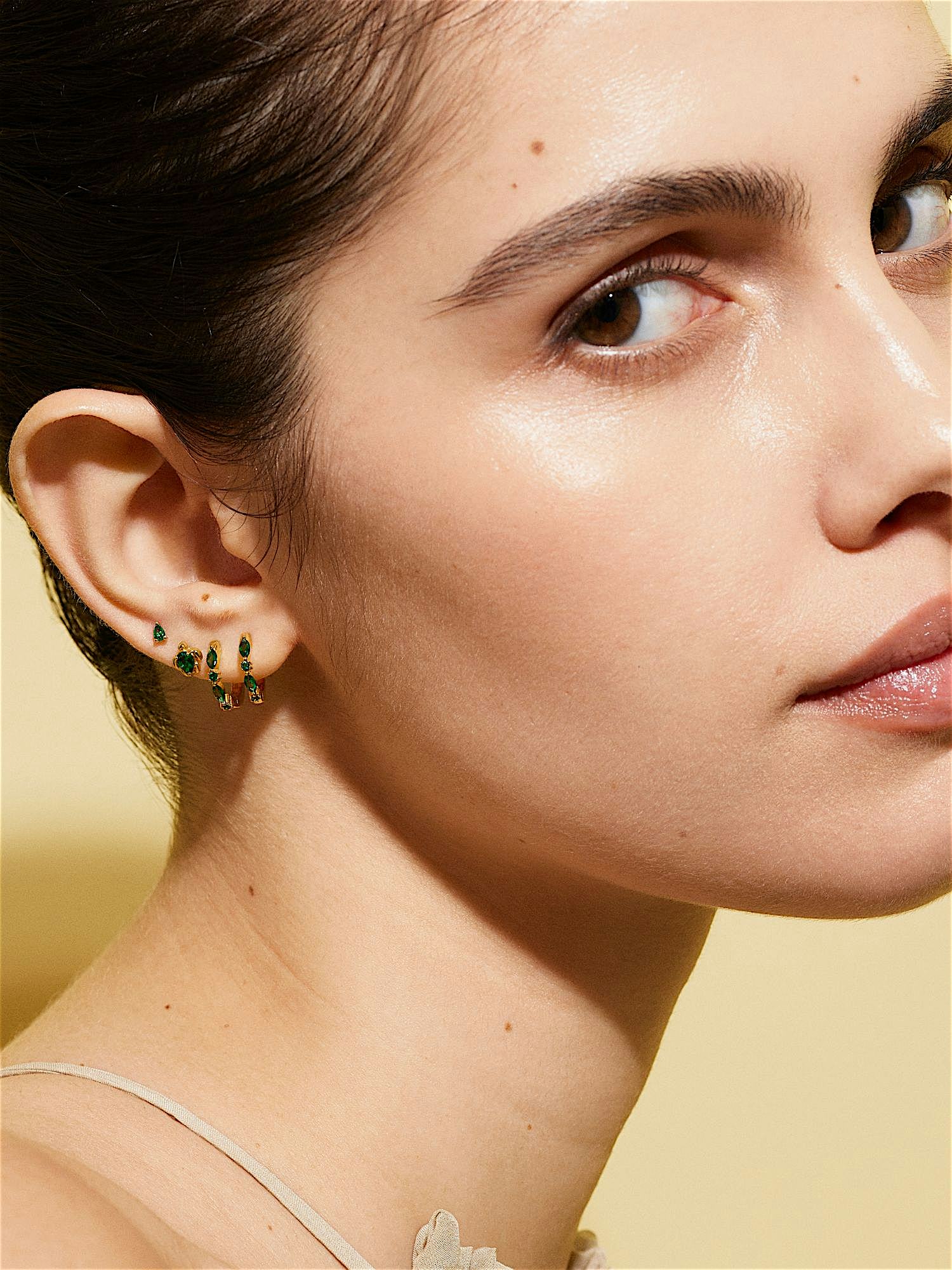 Piercing in Form einer Schildkröte aus echtem 925er Sterlingsilber, verziert mit einem grünen Cubic Zirconia-Stein. Das Goldschmuckstück ist mit echtem 18K-Gold vergoldet und hat einen Kern aus echtem 925er Sterlingsilber. Der Stab ist aus echtem 925er Sterlingsilber gefertigt. Dieses Produkt besteht zu 100 % aus recyceltem Silber. Führen Sie den hinteren Teil des Piercings von hinten durch das Ohr und schrauben Sie ihn mit dem vorderen Teil des Piercings fest.