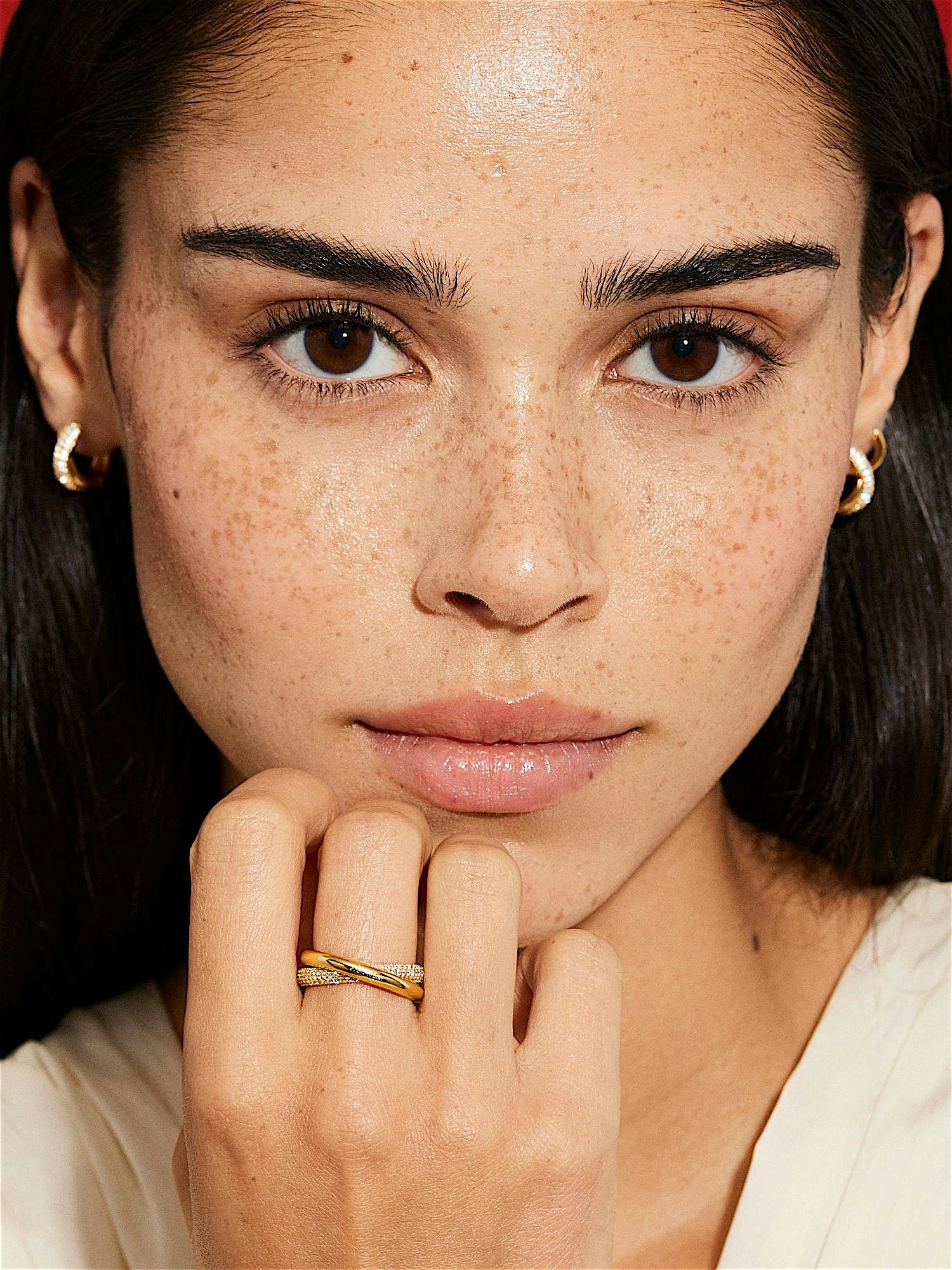 Two interlinked rings in genuine 925 sterling silver – one engravable and one decorated with clear Cubic Zirconia stones. The gold rings are plated with genuine 24K gold and have a core of genuine 925 sterling silver. This product is made from 100% recycled silver.