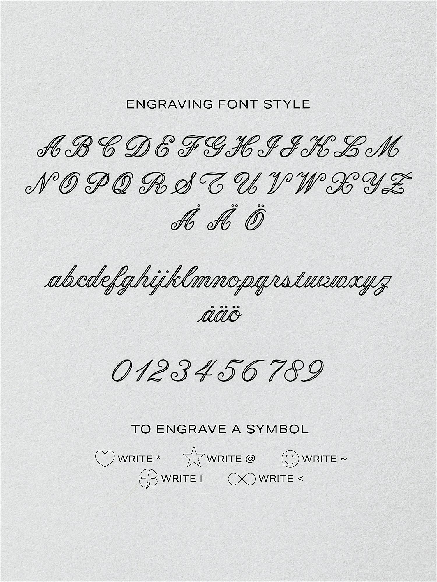 This jewelry is available with or without engraving, according to your preferences. The font we offer for the selected product is shown in the product image.