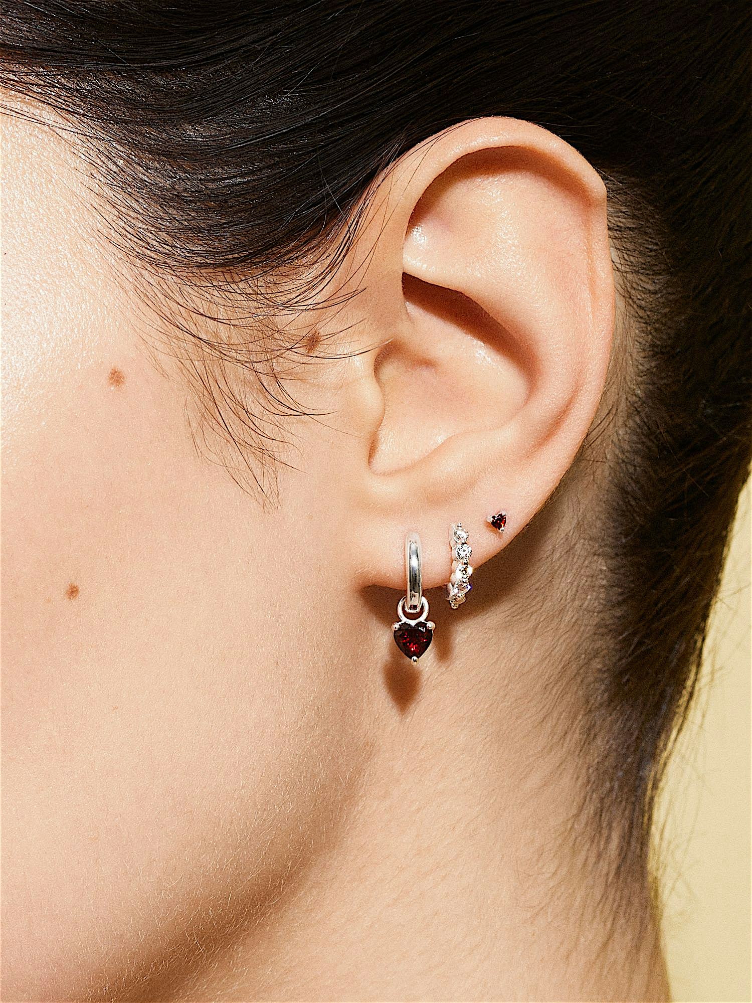 Hoop earrings in genuine 925 sterling silver, decorated with red heart shaped Cubic Zirconia stones. The gold earrings are plated with genuine 18K gold and have a core of genuine 925 sterling silver. This product is made from 100% recycled silver.