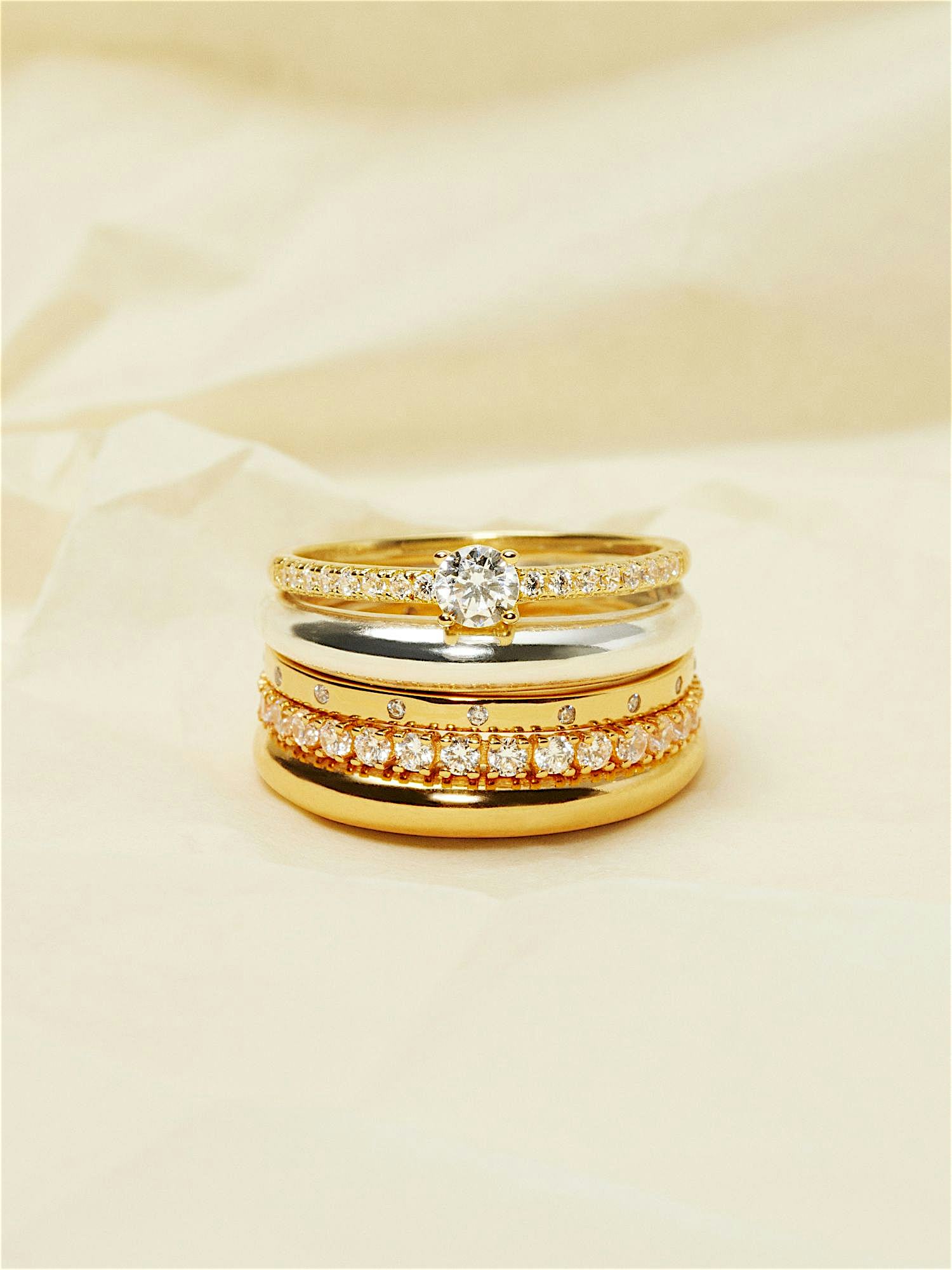 Solitaire ring with clear Cubic Zirconia stones in genuine 925 sterling silver. The gold ring is gilded with genuine 18K gold and has a core of genuine 925 sterling silver. This product is made from 100% recycled silver.