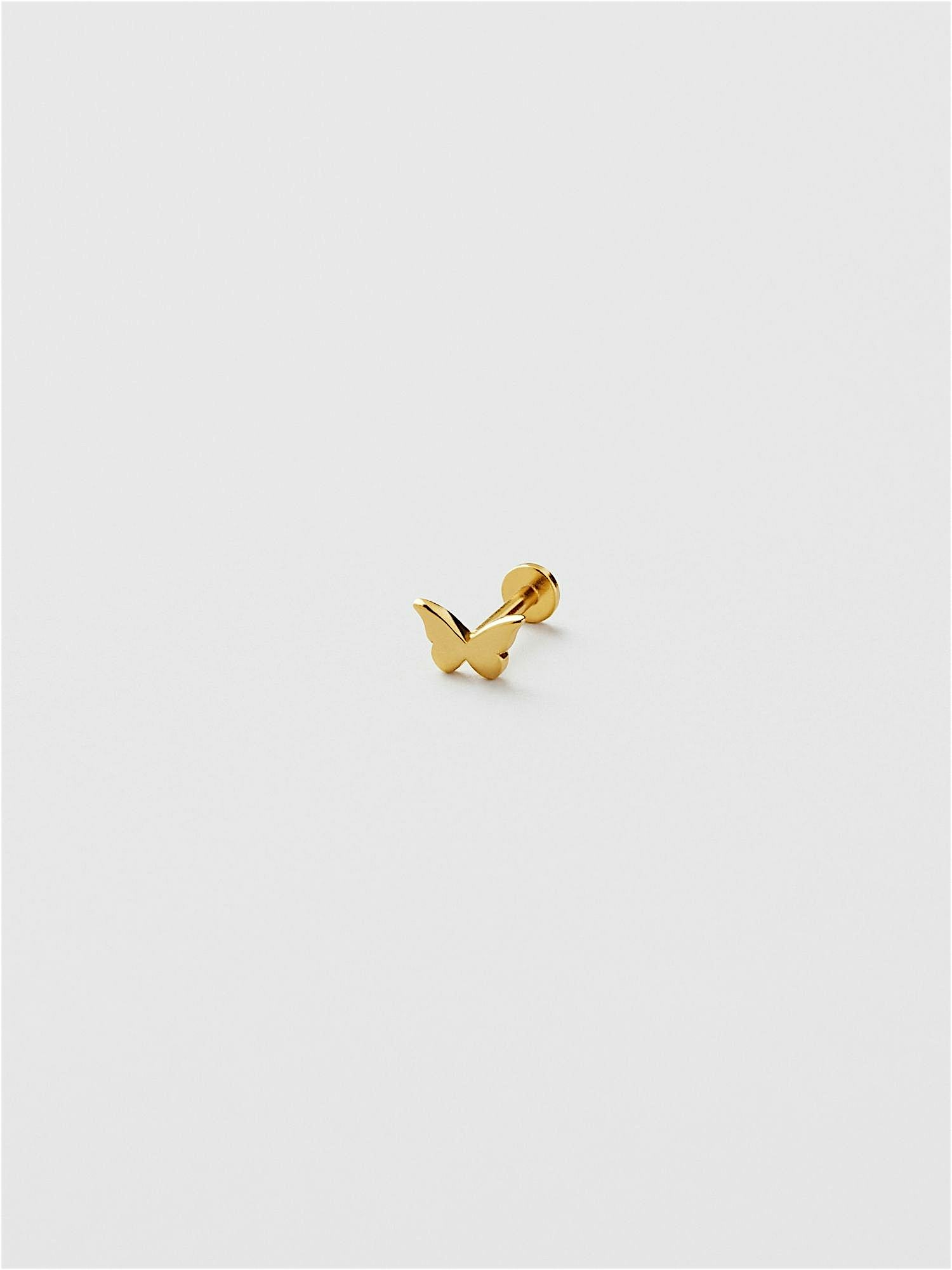 Piercing in the shape of a butterfly in genuine 925 sterling silver. The gold jewellery is plated with genuine 18K gold and has a core of genuine 925 sterling silver. This product is made from 100% recycled silver. The bar is made of genuine 925 sterling silver. Insert the back part of the piercing through the ear from behind and screw it on with the front part of the piercing.