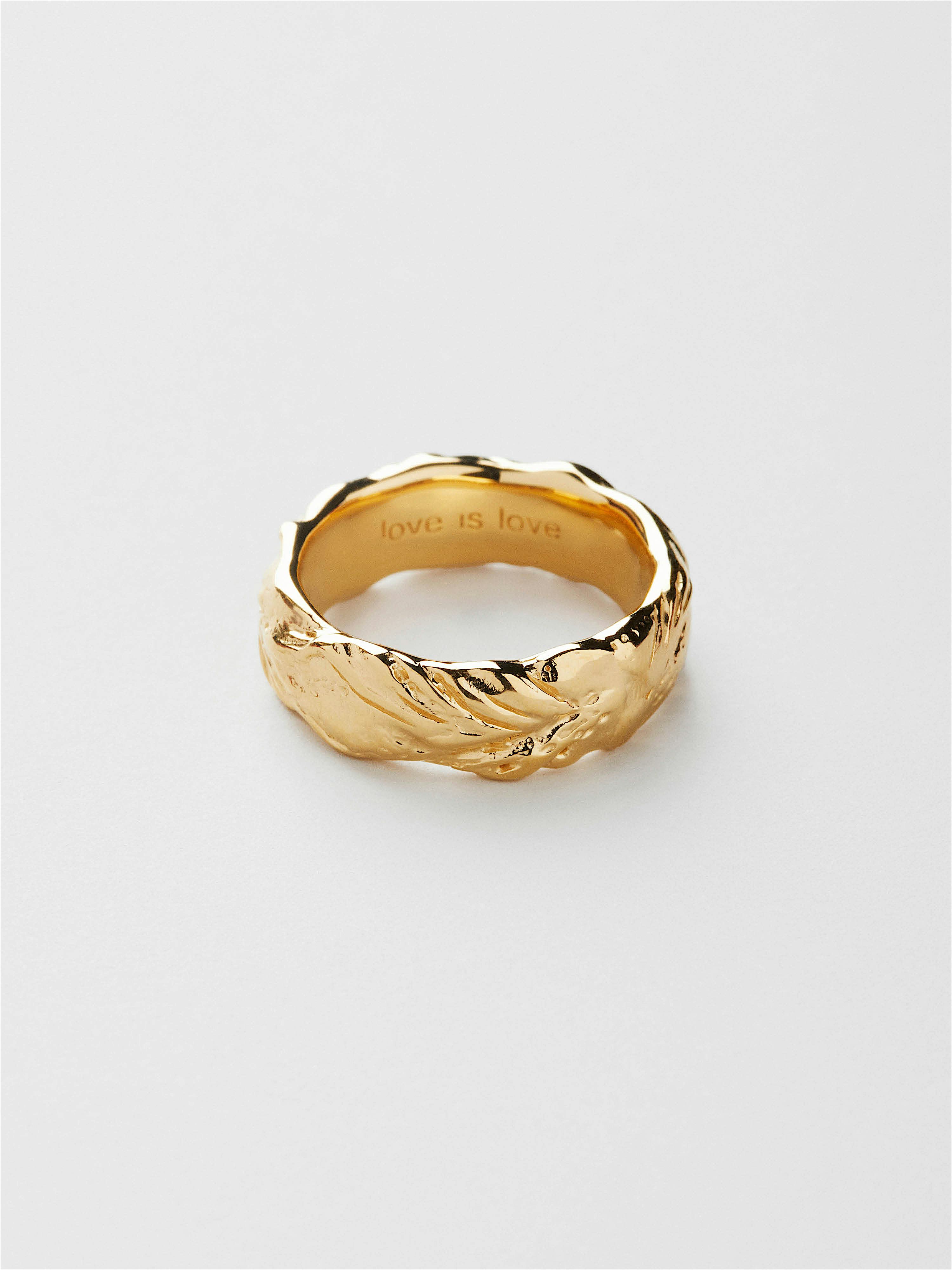 Ring in genuine 925 sterling silver. The words "love is love" are engraved. The gold ring is plated with genuine 24K gold and has a core of genuine 925 sterling silver. Today, more than 85% of our jewellery is made from recycled silver.
