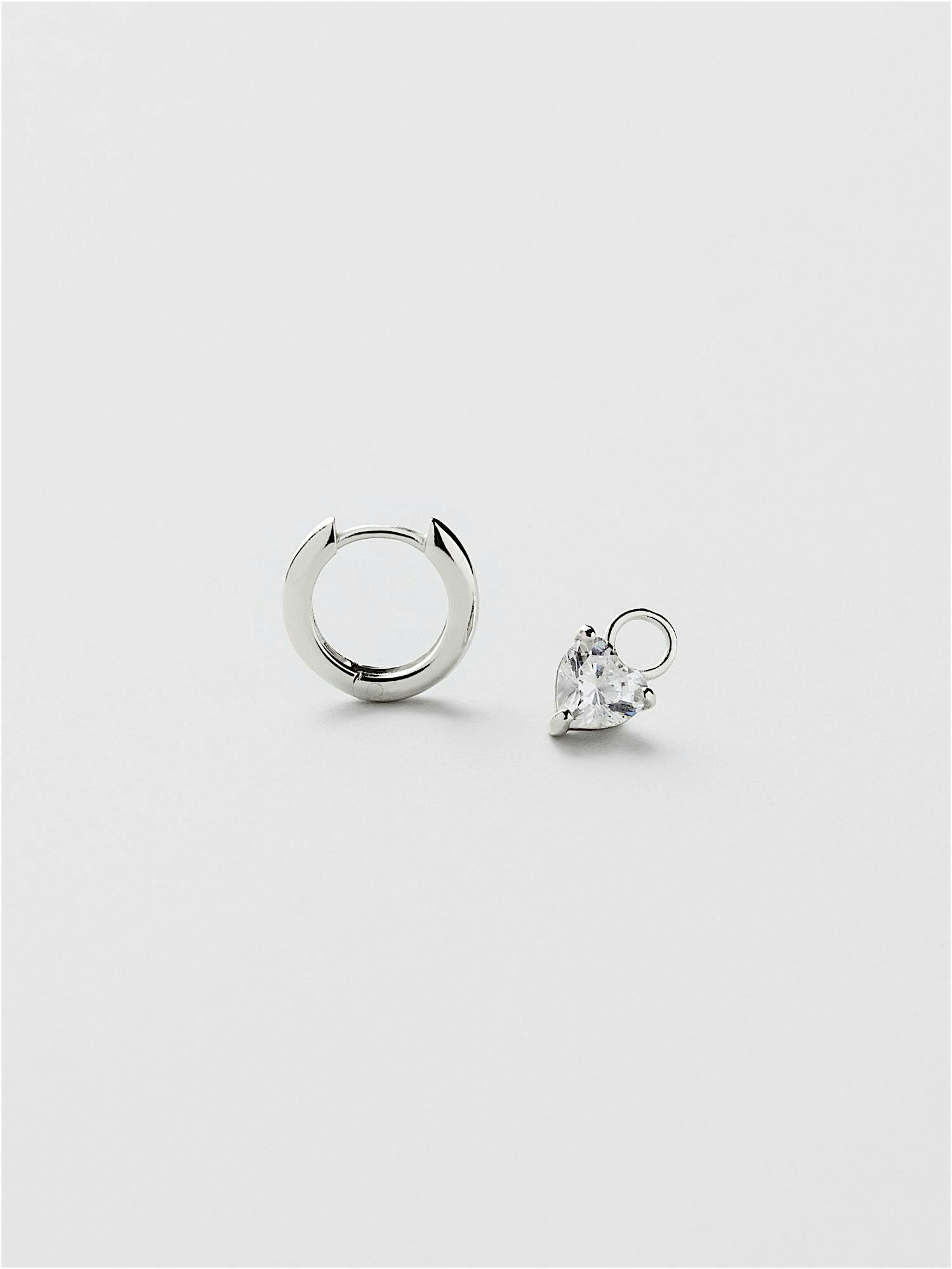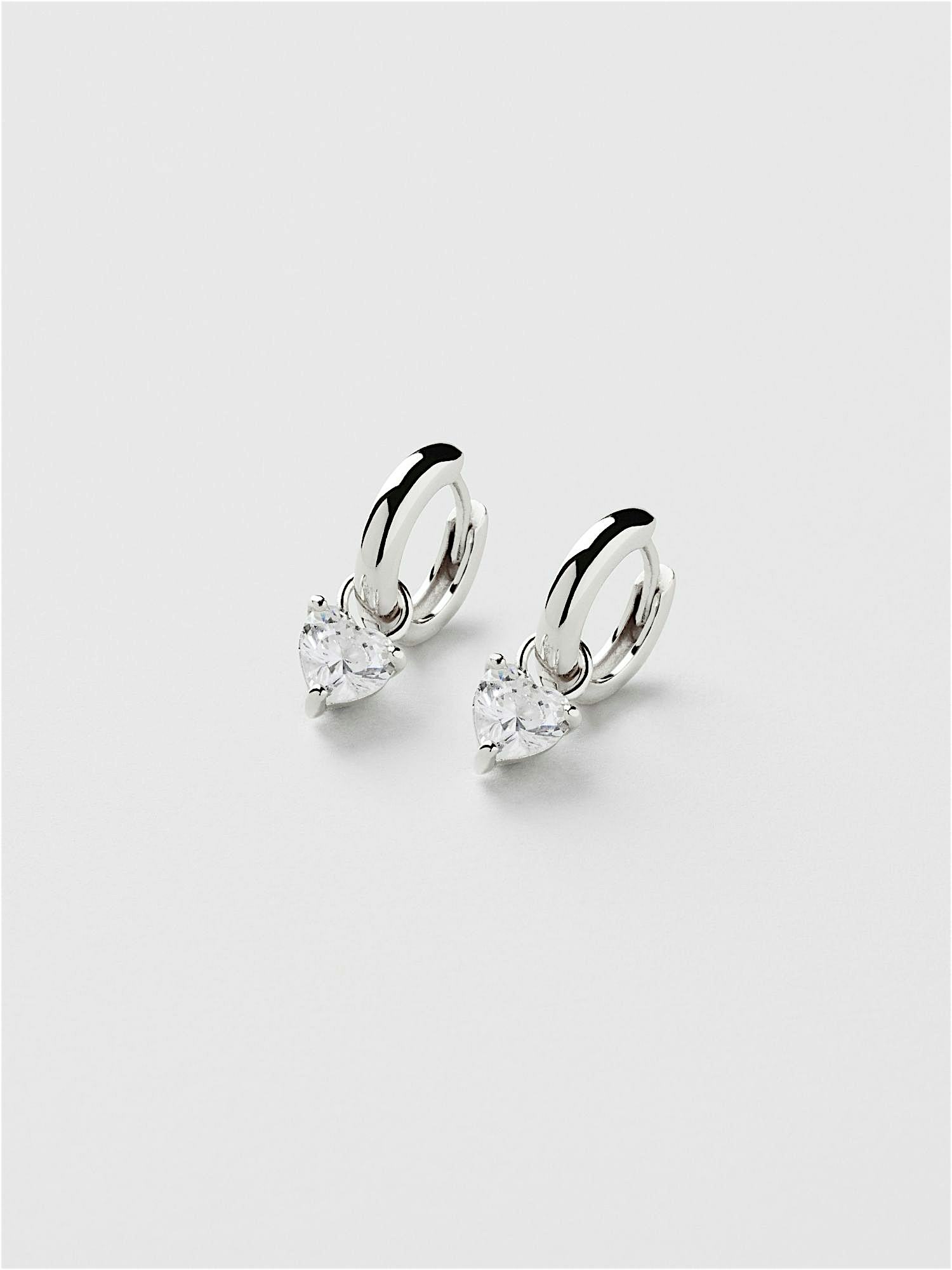 Hoop earrings in genuine 925 sterling silver, decorated with clear heart shaped Cubic Zirconia stones. The gold earrings are plated with genuine 18K gold and have a core of genuine 925 sterling silver. This product is made from 100% recycled silver.