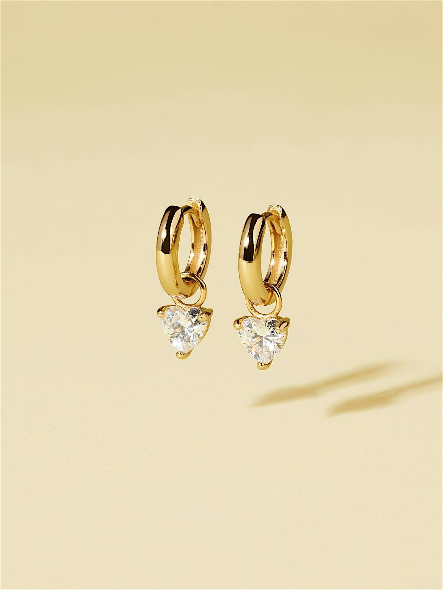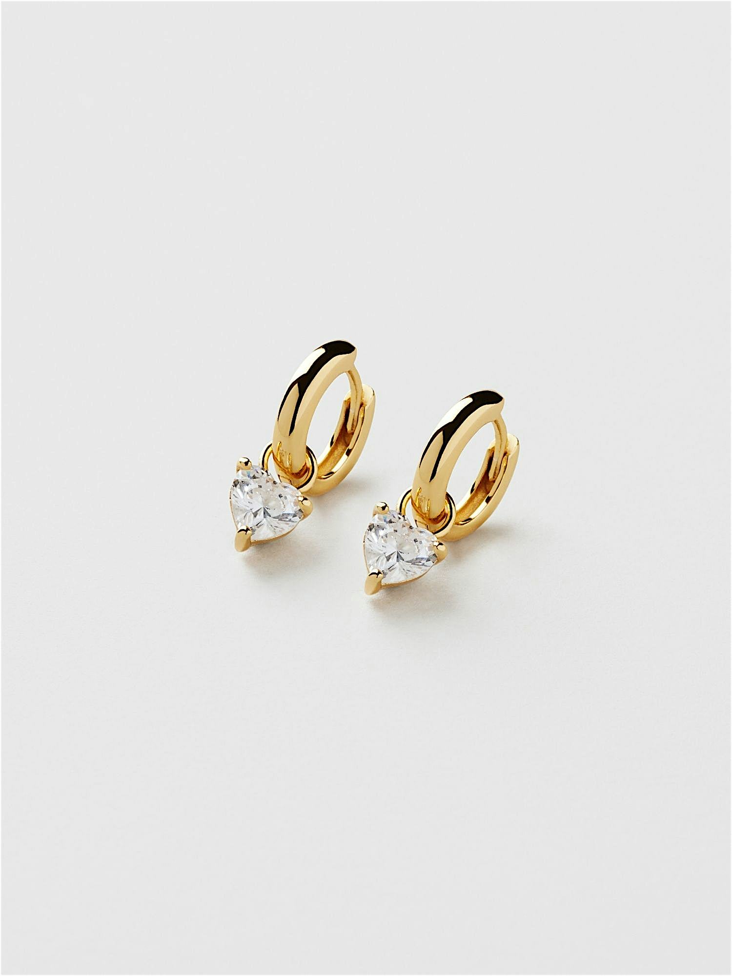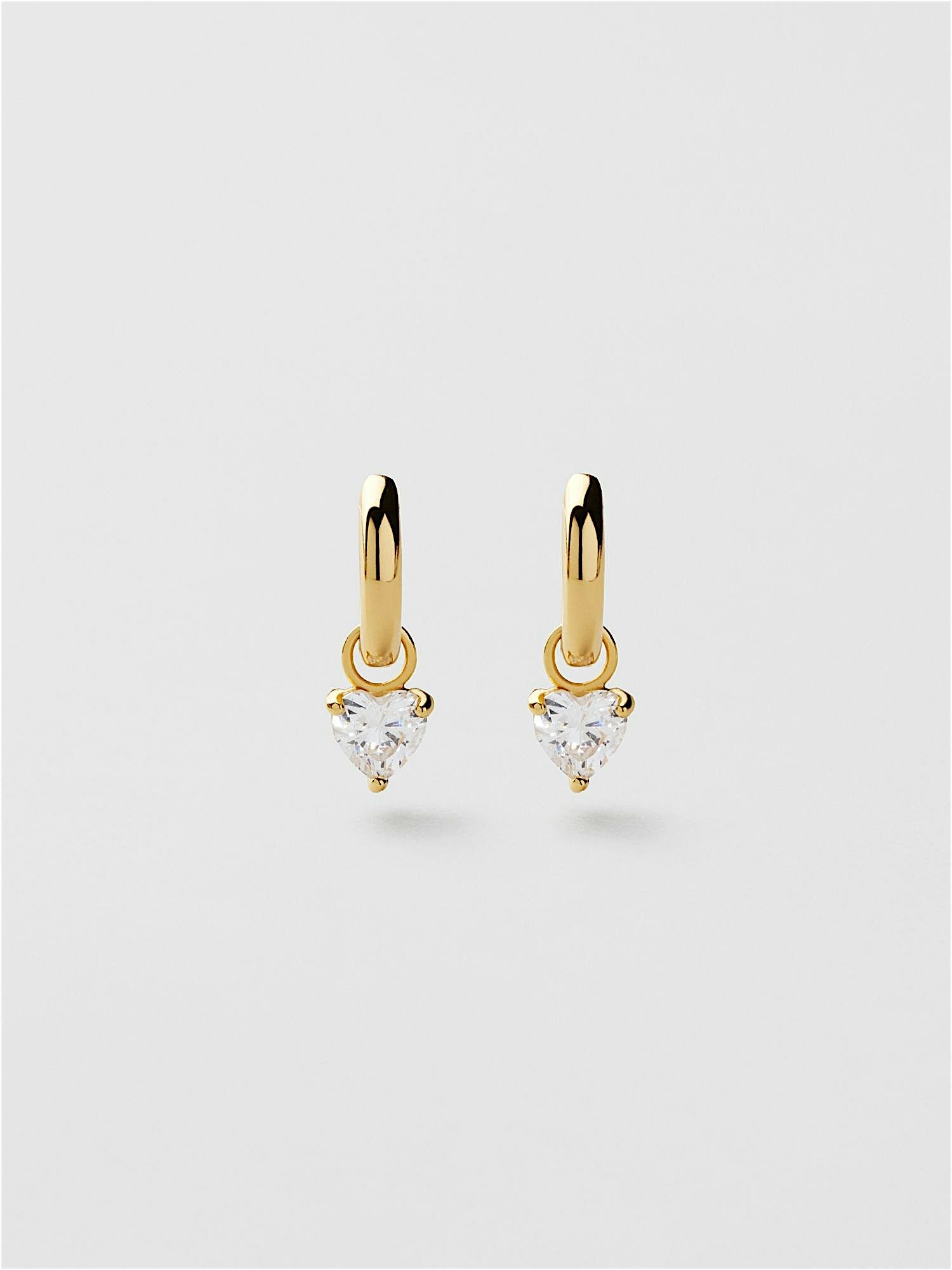 Hoop earrings in genuine 925 sterling silver, decorated with clear heart shaped Cubic Zirconia stones. The gold earrings are plated with genuine 18K gold and have a core of genuine 925 sterling silver. This product is made from 100% recycled silver.