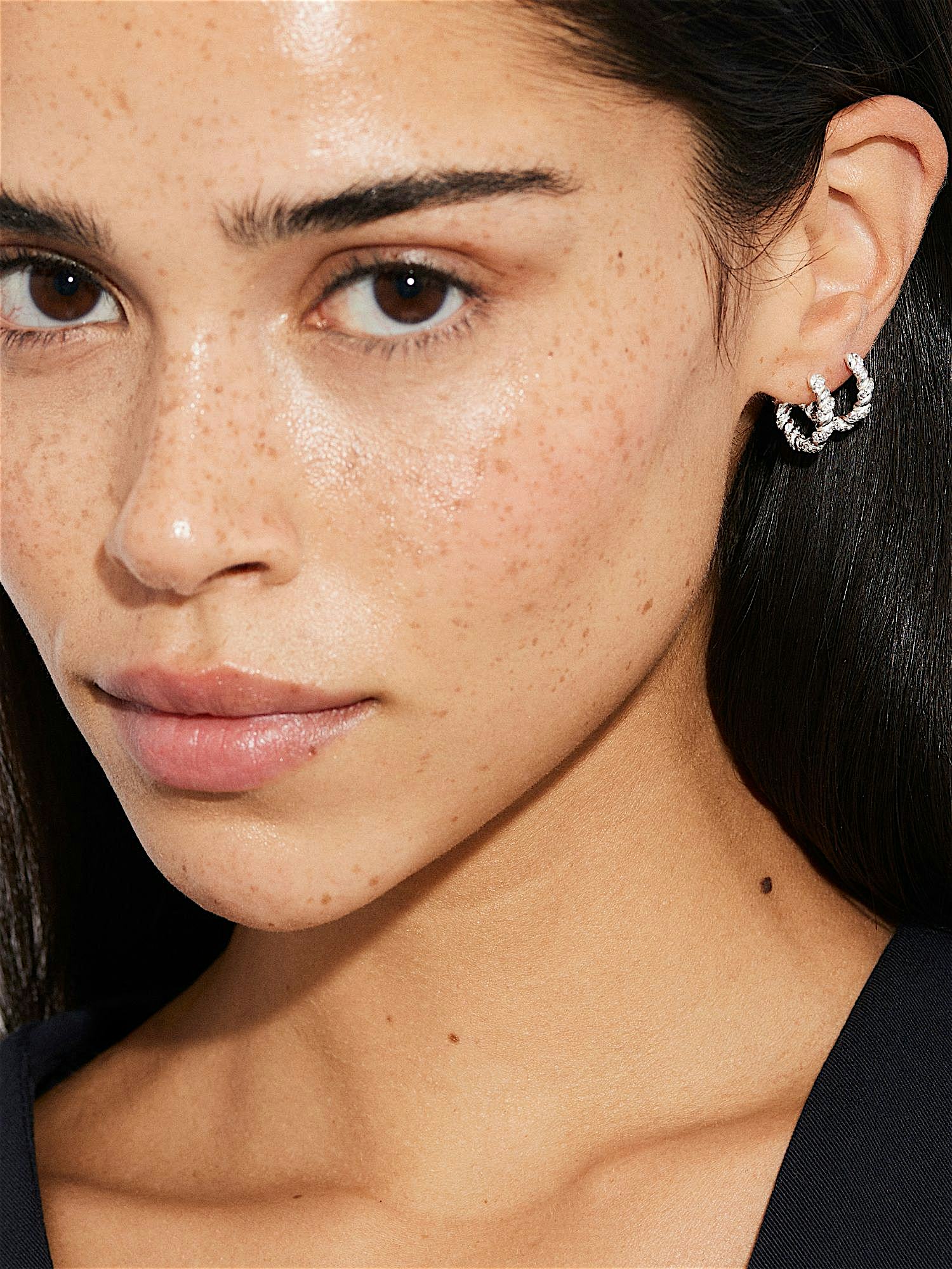 Twisted hoops in genuine 925 sterling silver decorated with clear cubic zirconia stones. The gold earrings are plated with genuine 24K gold and have a core of genuine 925 sterling silver. This product is made from 100% recycled silver.