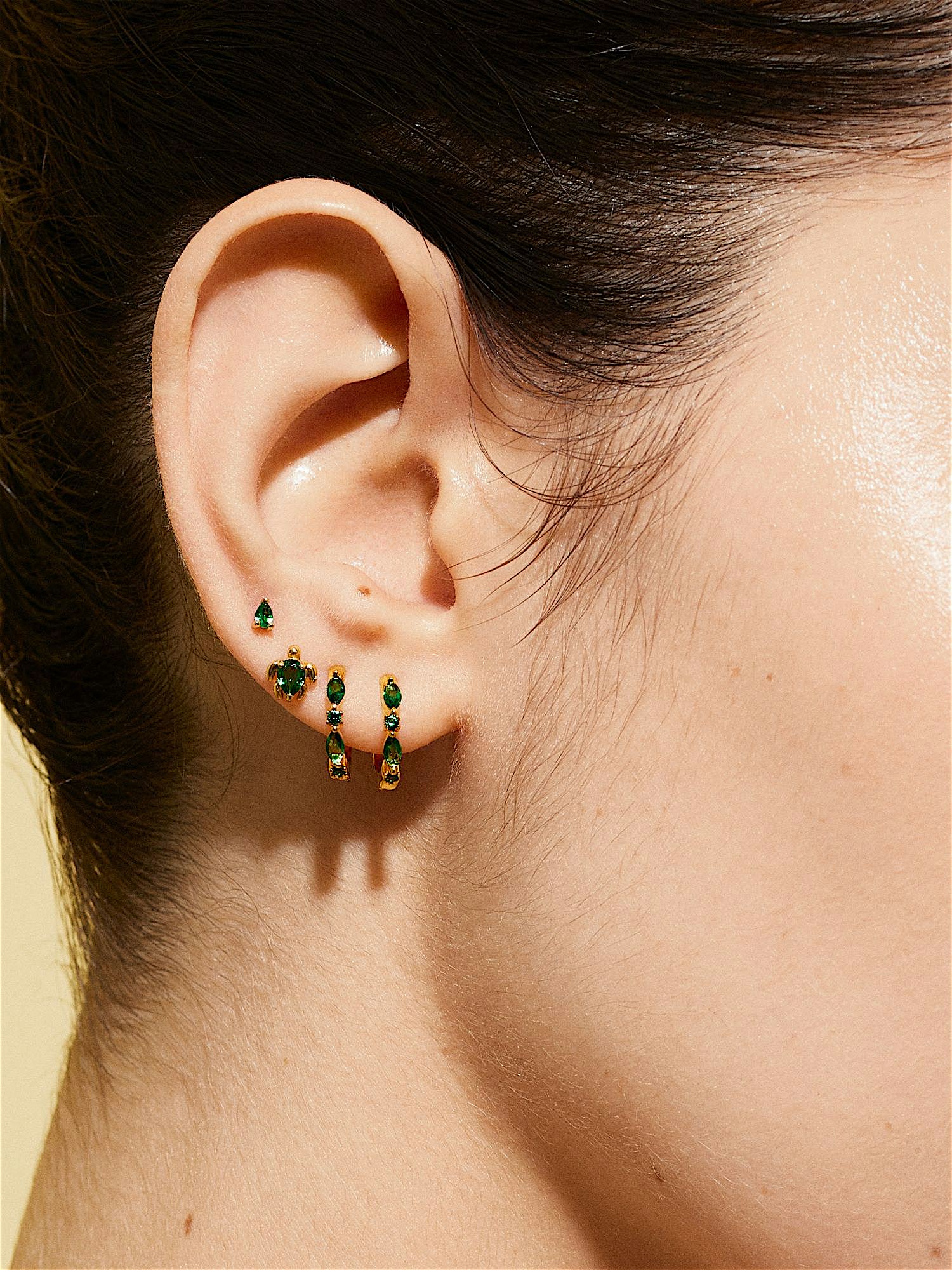 Piercing in genuine 925 sterling silver, decorated with a green drop shaped Cubic Zirconia stone. The gold jewellery is plated with genuine 18K gold and has a core of genuine 925 sterling silver. This product is made from 100% recycled silver. The bar is made of genuine 925 sterling silver. Insert the back part of the piercing through the ear from behind and screw it on with the front part of the piercing.