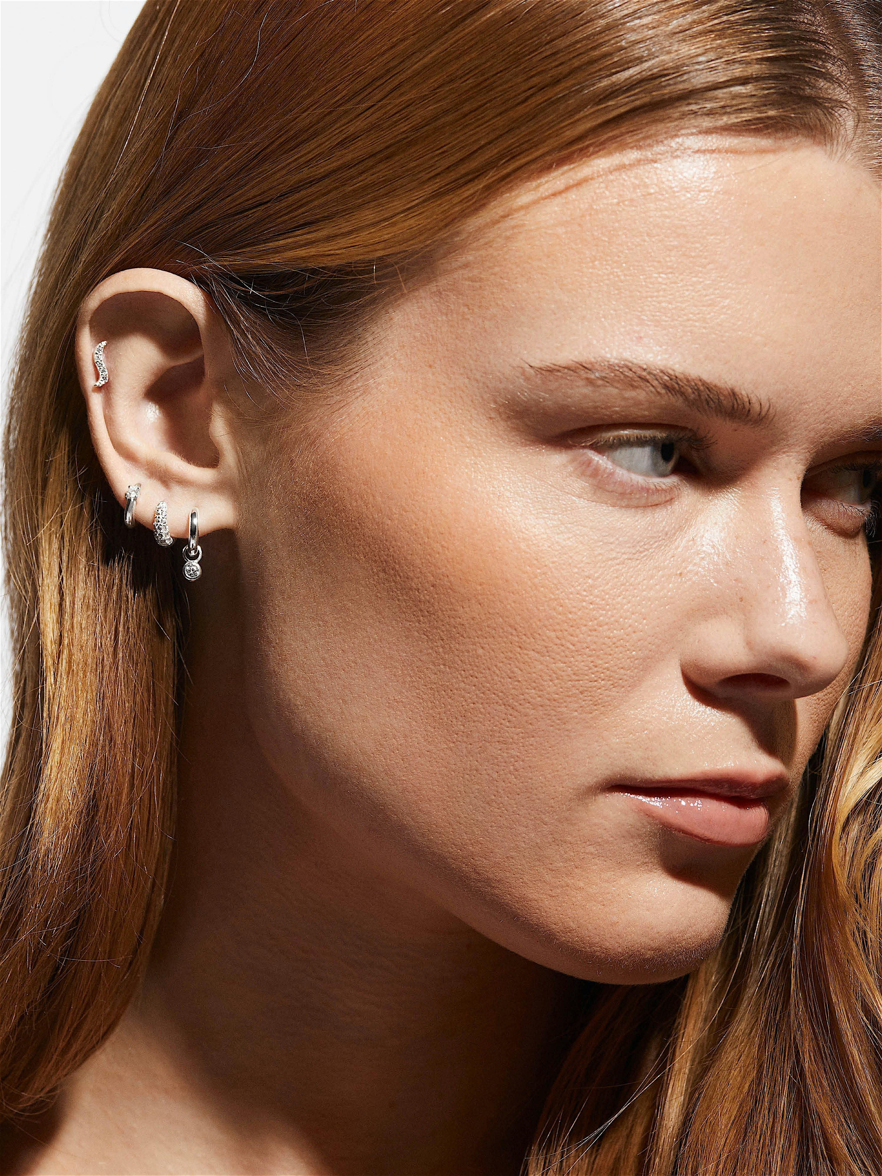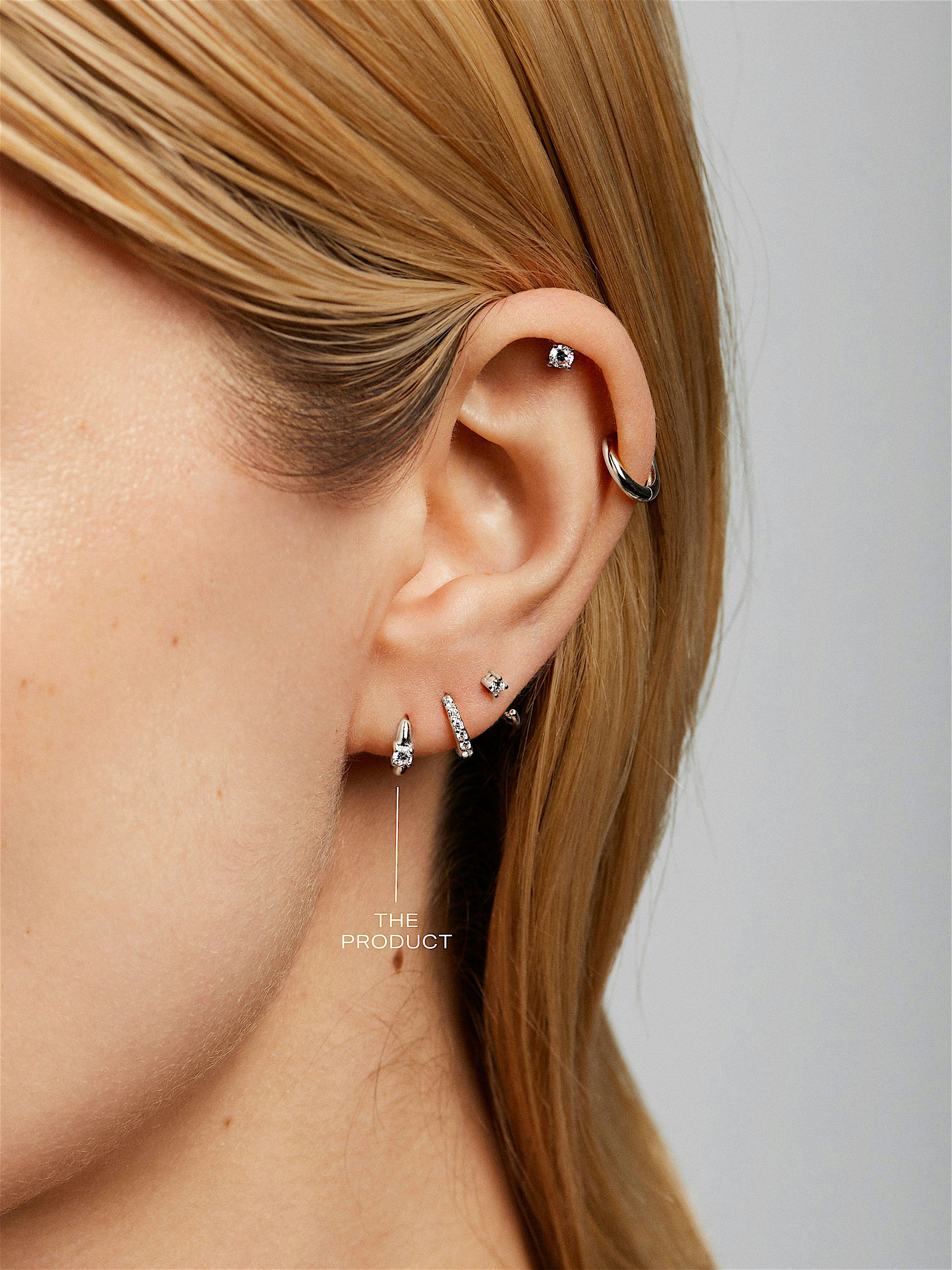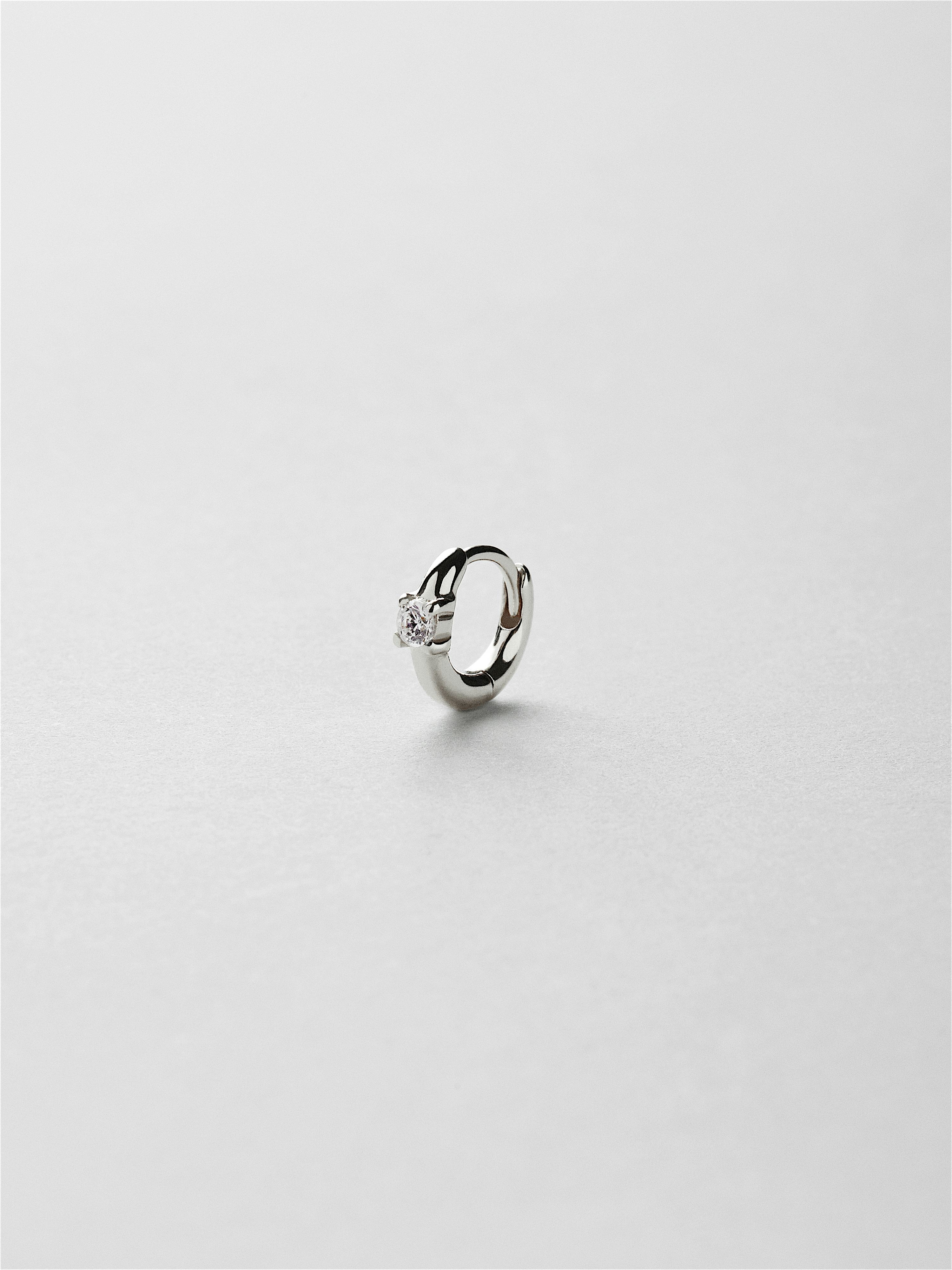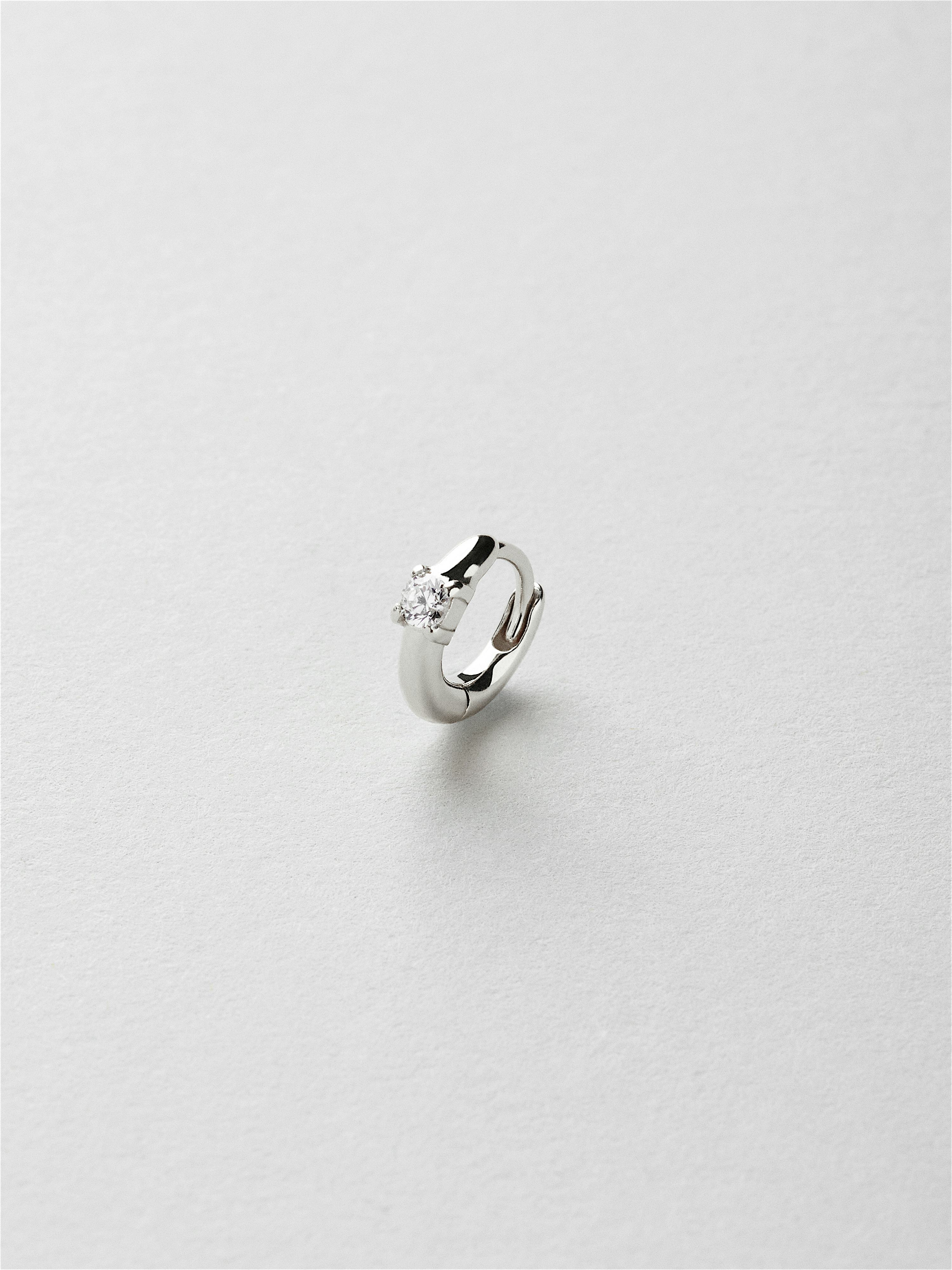 Huggie hoop in genuine 925 sterling silver with a clear Cubic Zirconia stone. The gold jewellery is plated with genuine 24K gold and has a core of genuine 925 sterling silver. This product is 100% recycled silver.