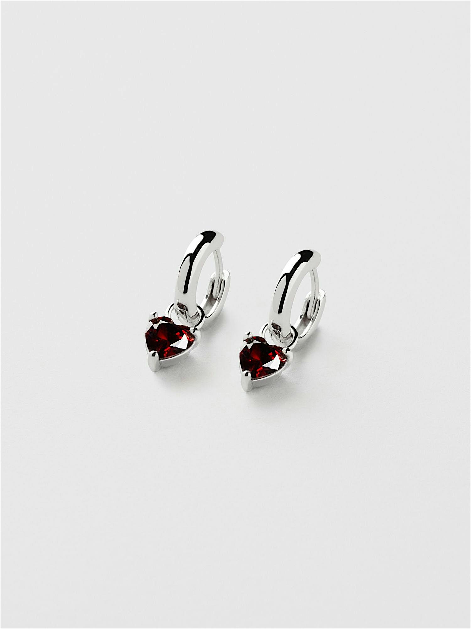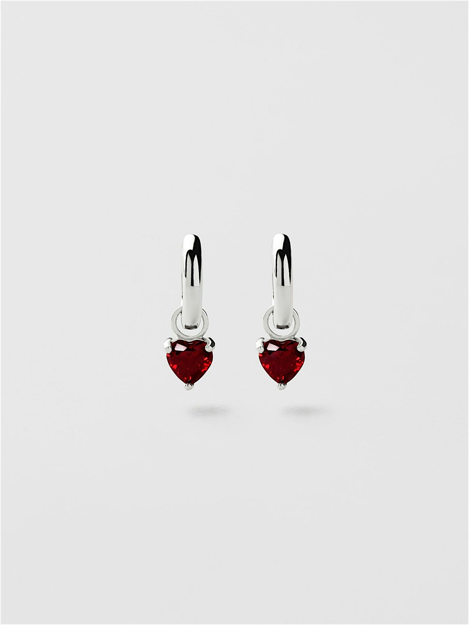 Hoop earrings in genuine 925 sterling silver, decorated with red heart shaped Cubic Zirconia stones. The gold earrings are plated with genuine 18K gold and have a core of genuine 925 sterling silver. This product is made from 100% recycled silver.