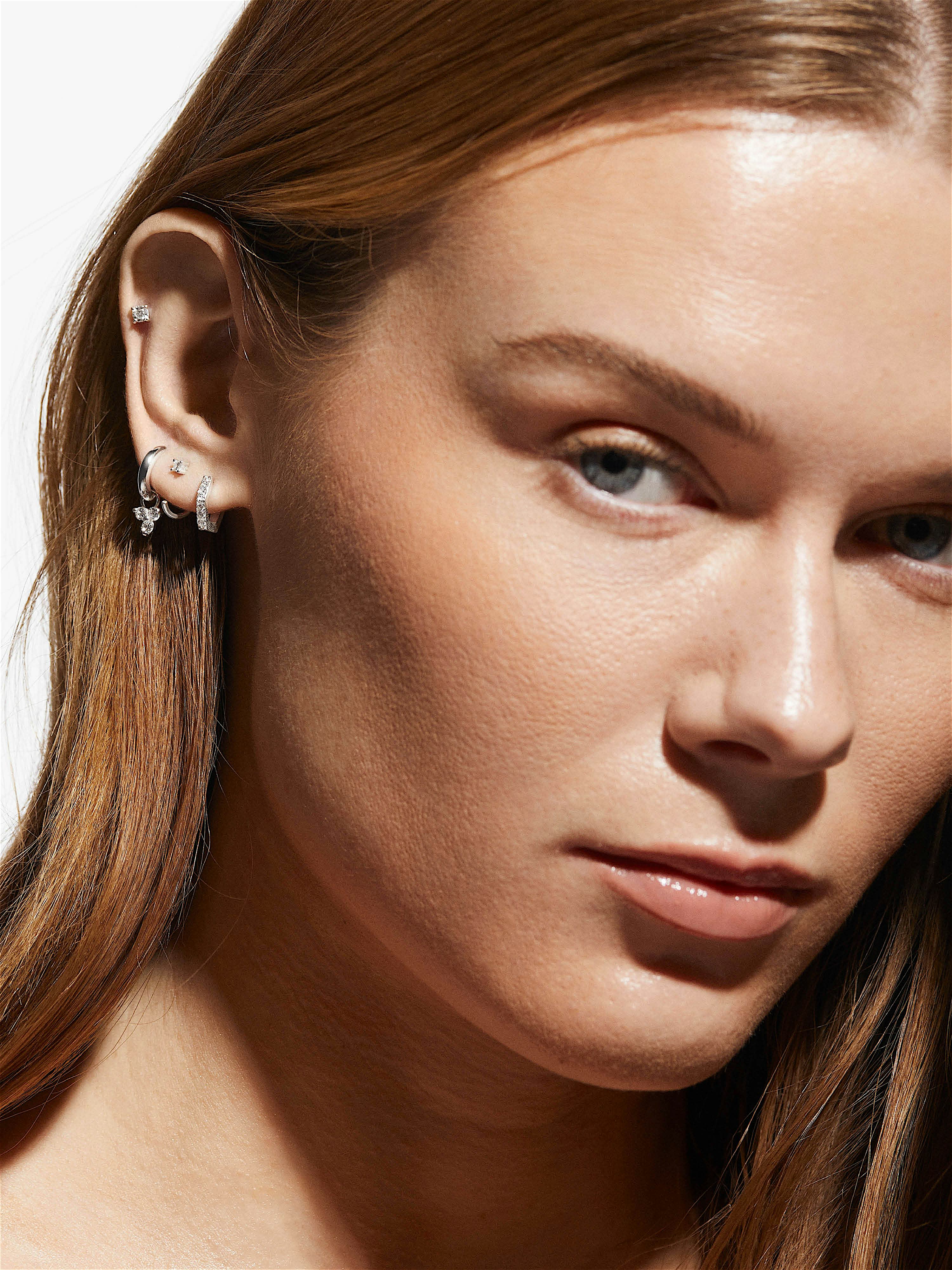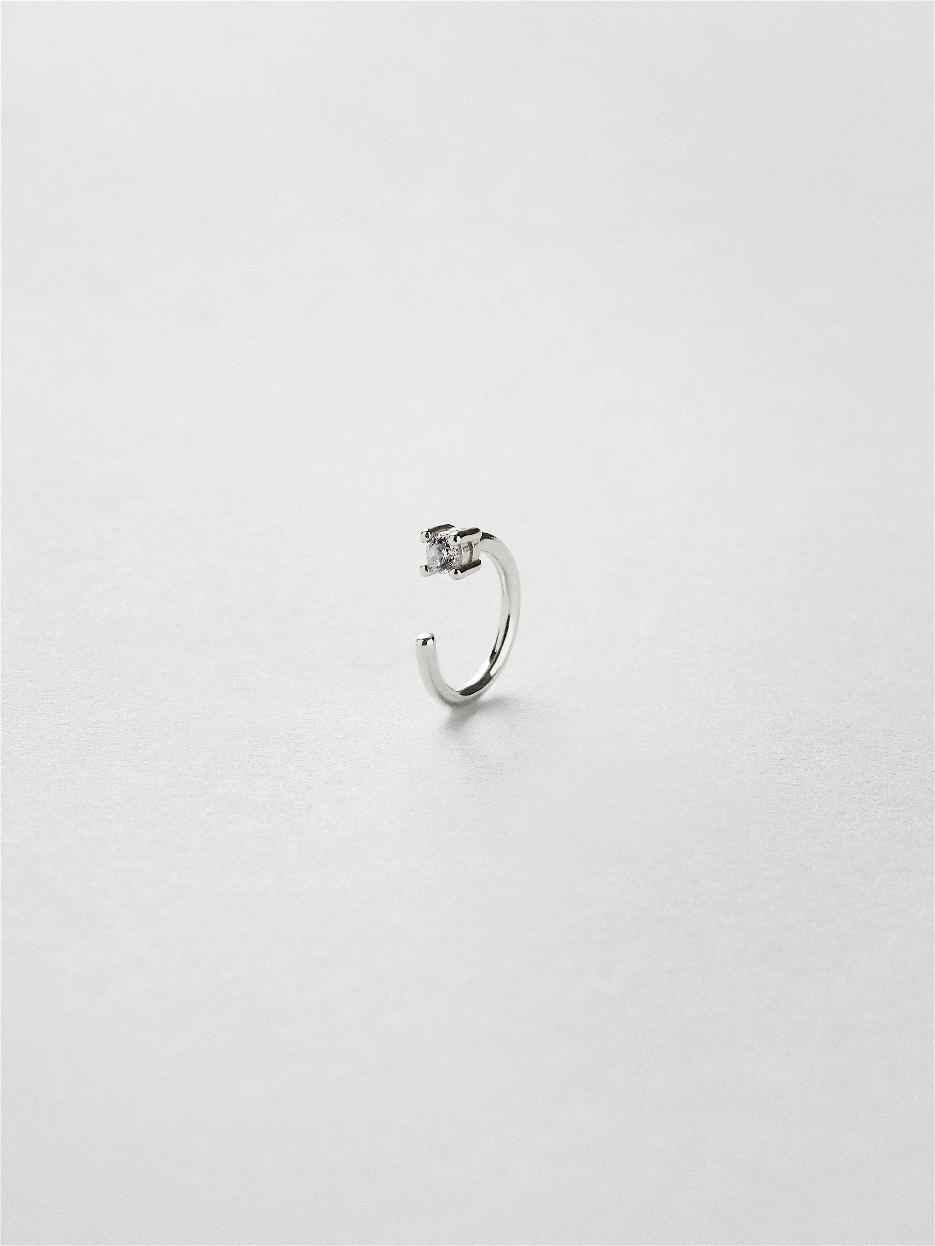 Open huggie hoop in genuine 925 sterling silver, decorated with a clear Cubic Zirconia stone. The gold earring is plated with genuine 24K gold and has a core of genuine 925 sterling silver. This product is made from 100% recycled silver.