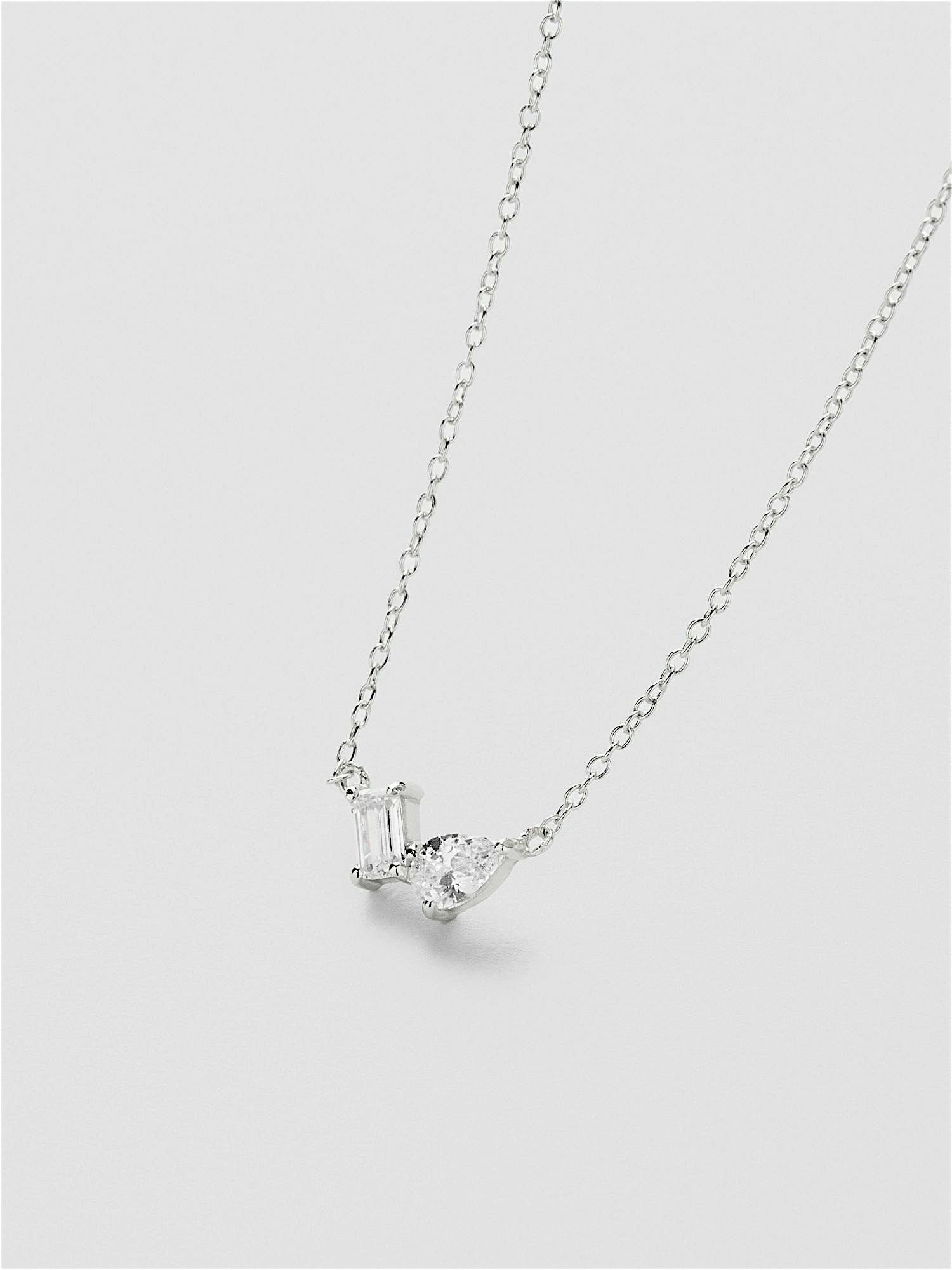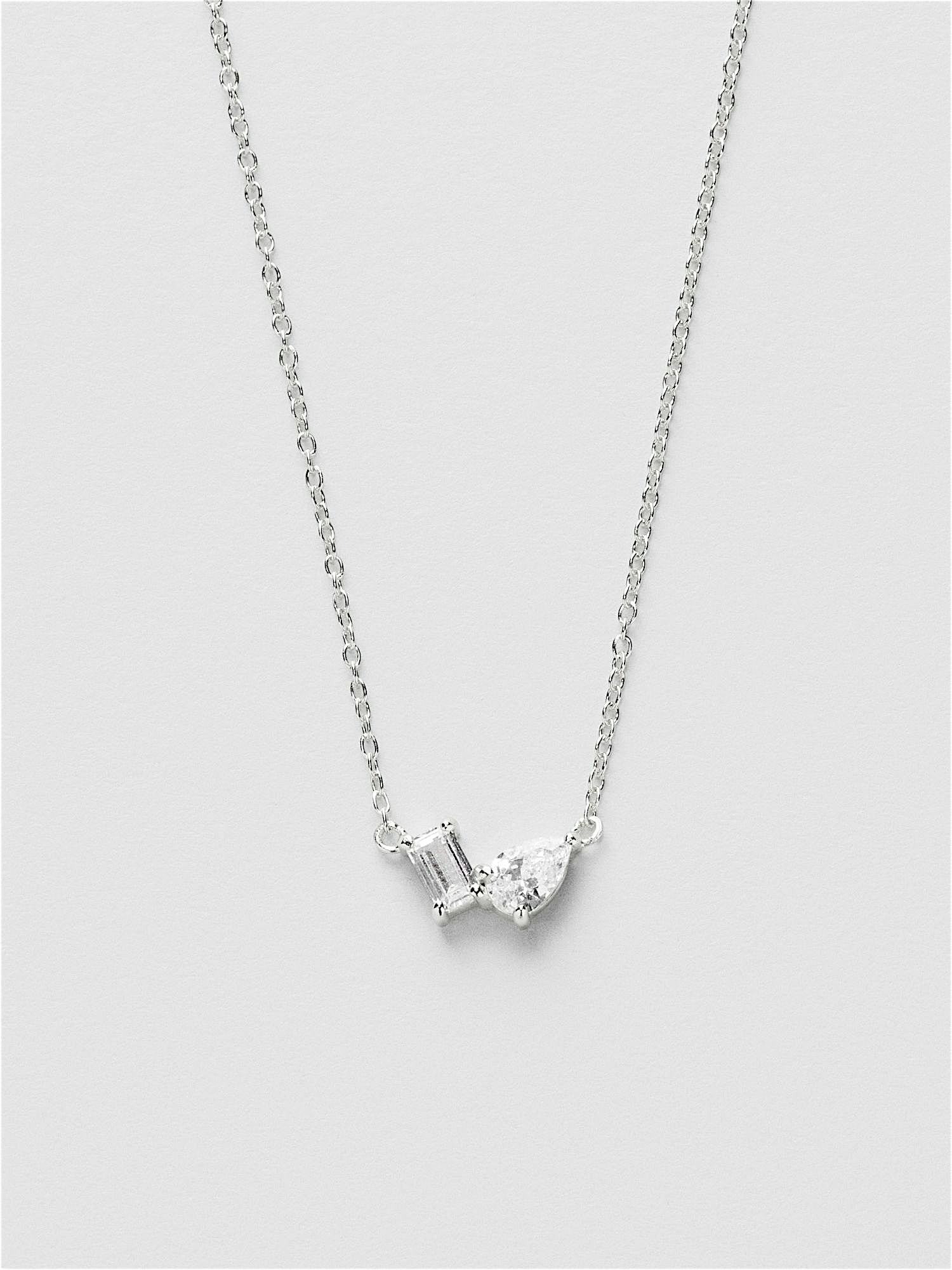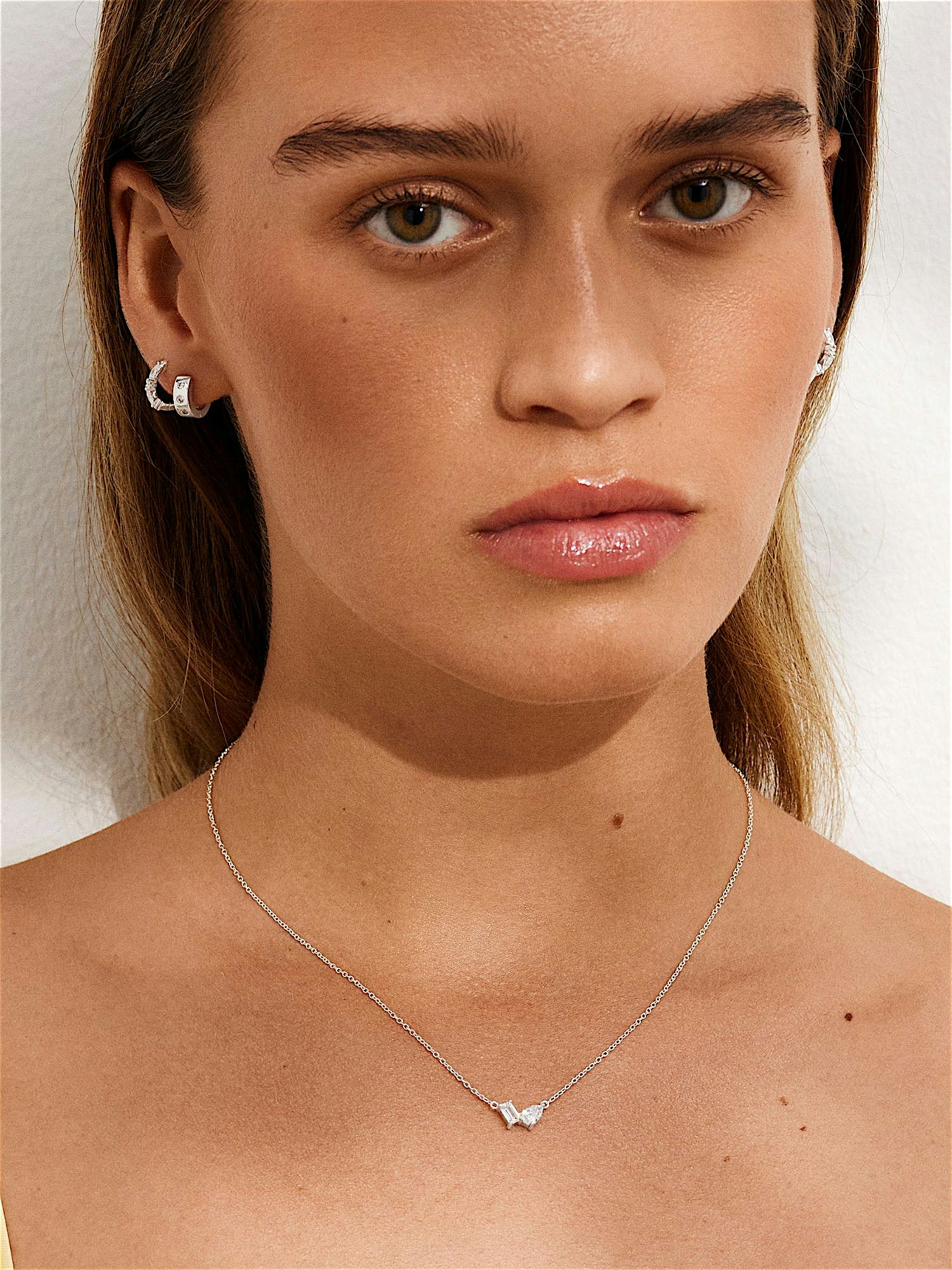 Necklace in genuine 925 sterling silver, decorated with two clear Cubic Zirconia stones. "Toi et Moi" means "You and Me" in French. The gold necklace is plated with genuine 18K gold and has a core of genuine 925 sterling silver. This product is made from 100% recycled silver.