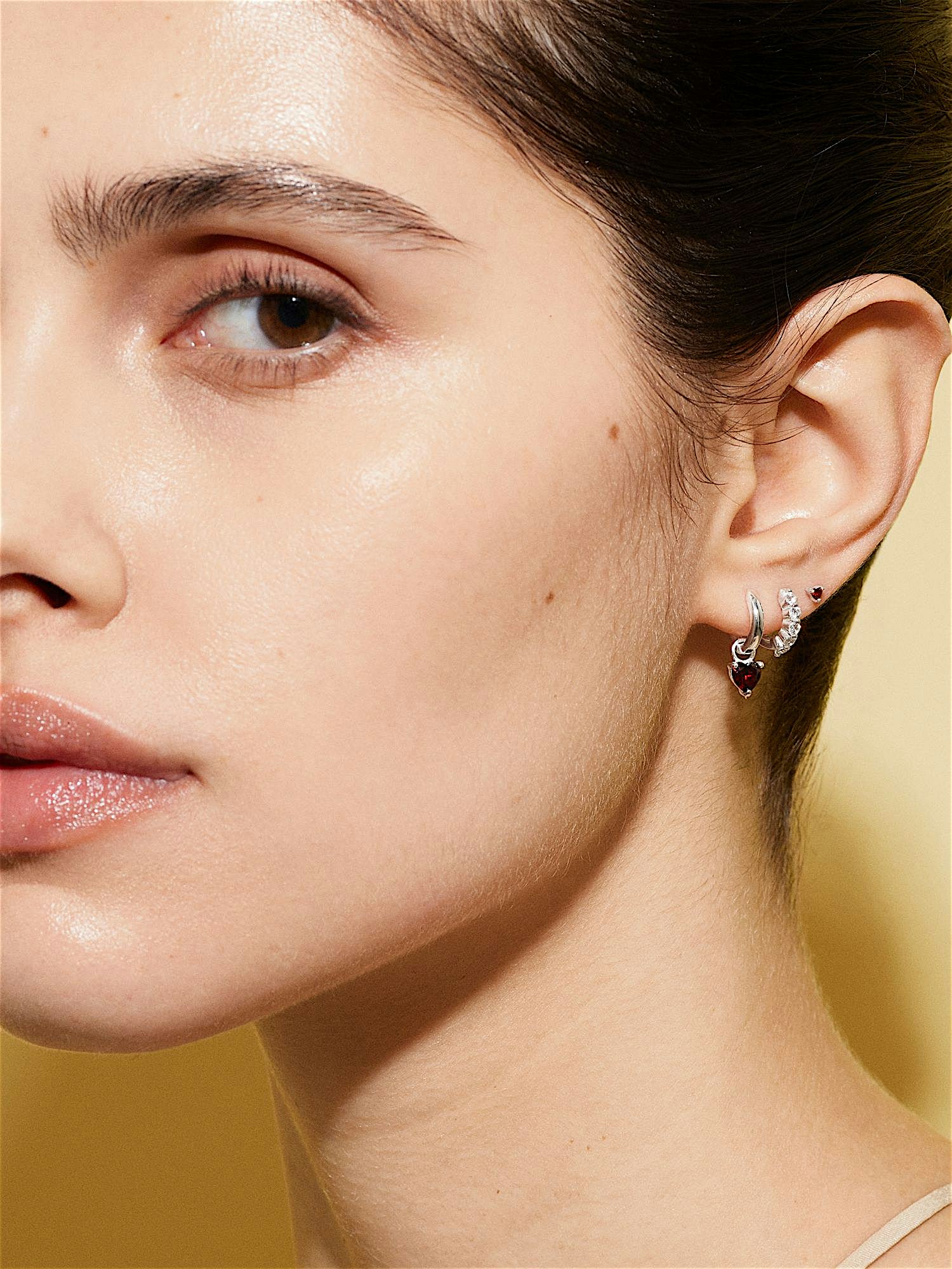Hoop earrings in genuine 925 sterling silver, decorated with red heart shaped Cubic Zirconia stones. The gold earrings are plated with genuine 18K gold and have a core of genuine 925 sterling silver. This product is made from 100% recycled silver.