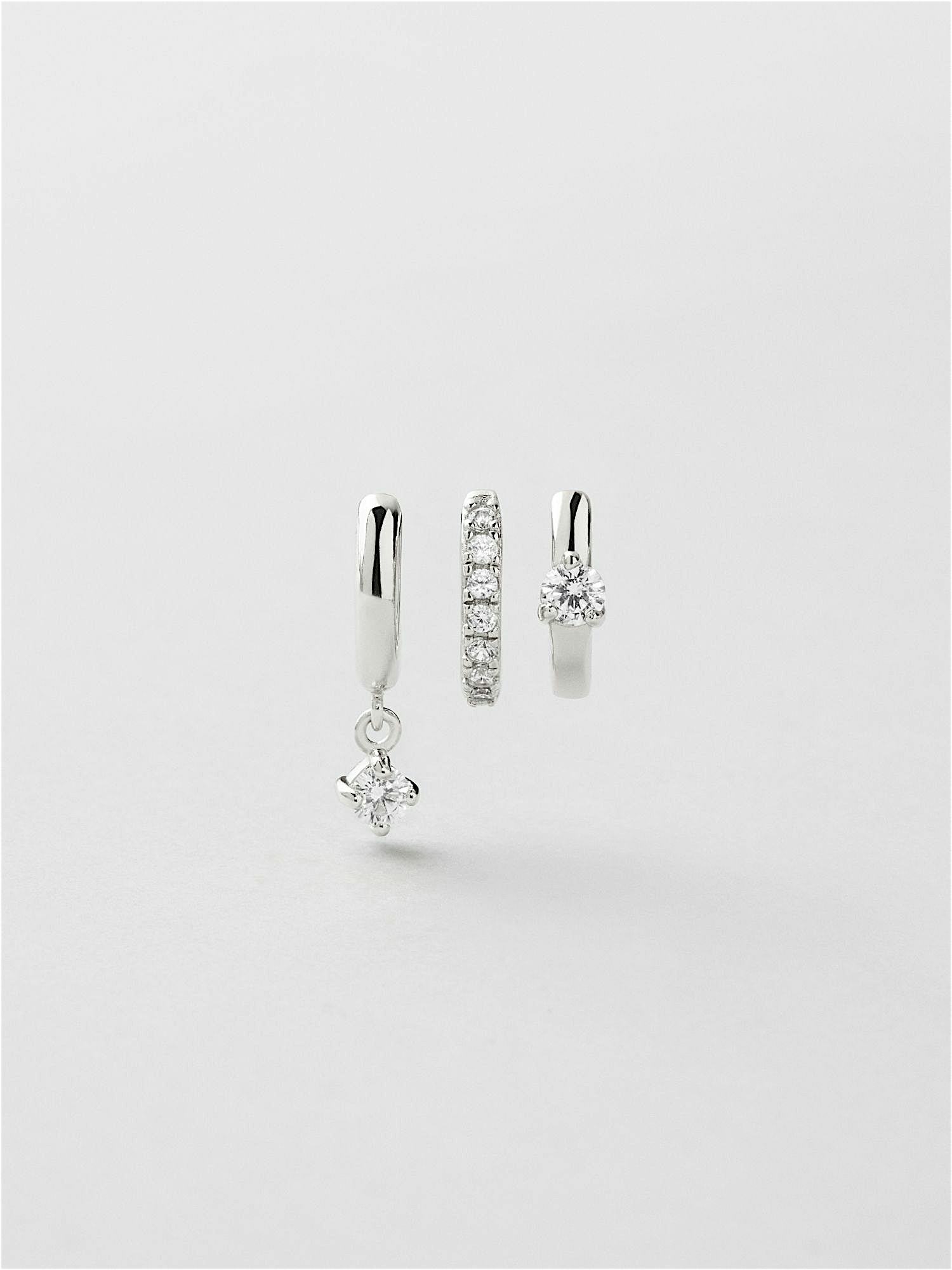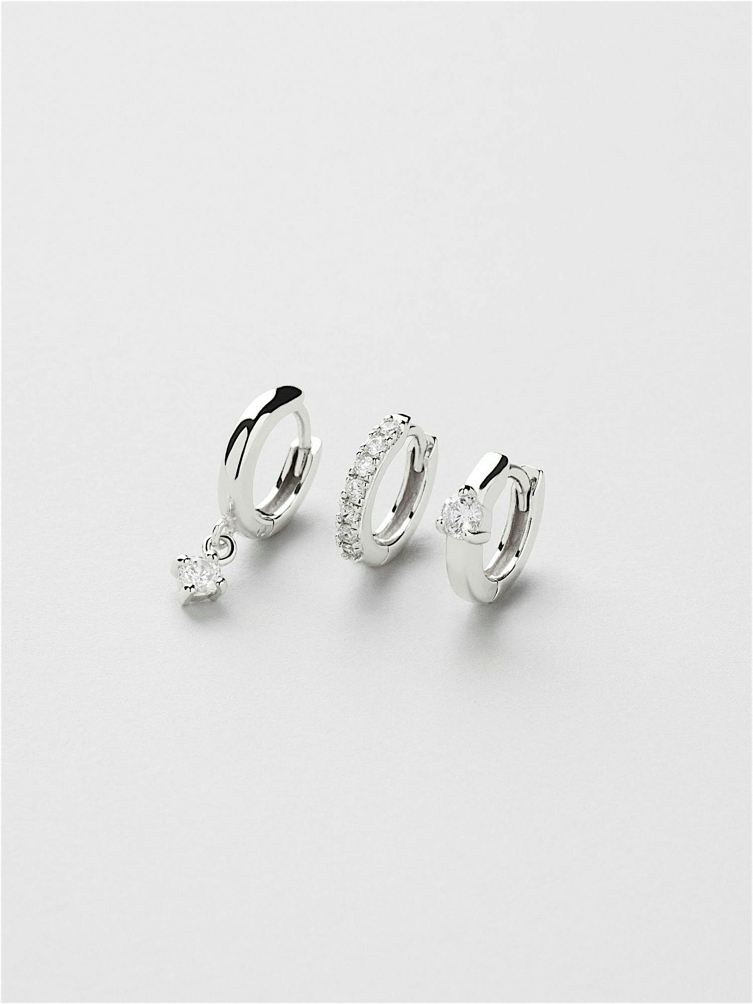3-pack single hoops in genuine 925 sterling silver, decorated with clear Cubic Zirconia stones. The gold earrings are plated with genuine 18 k gold and have a core of genuine 925 sterling silver. This product is made from 100% recycled silver.