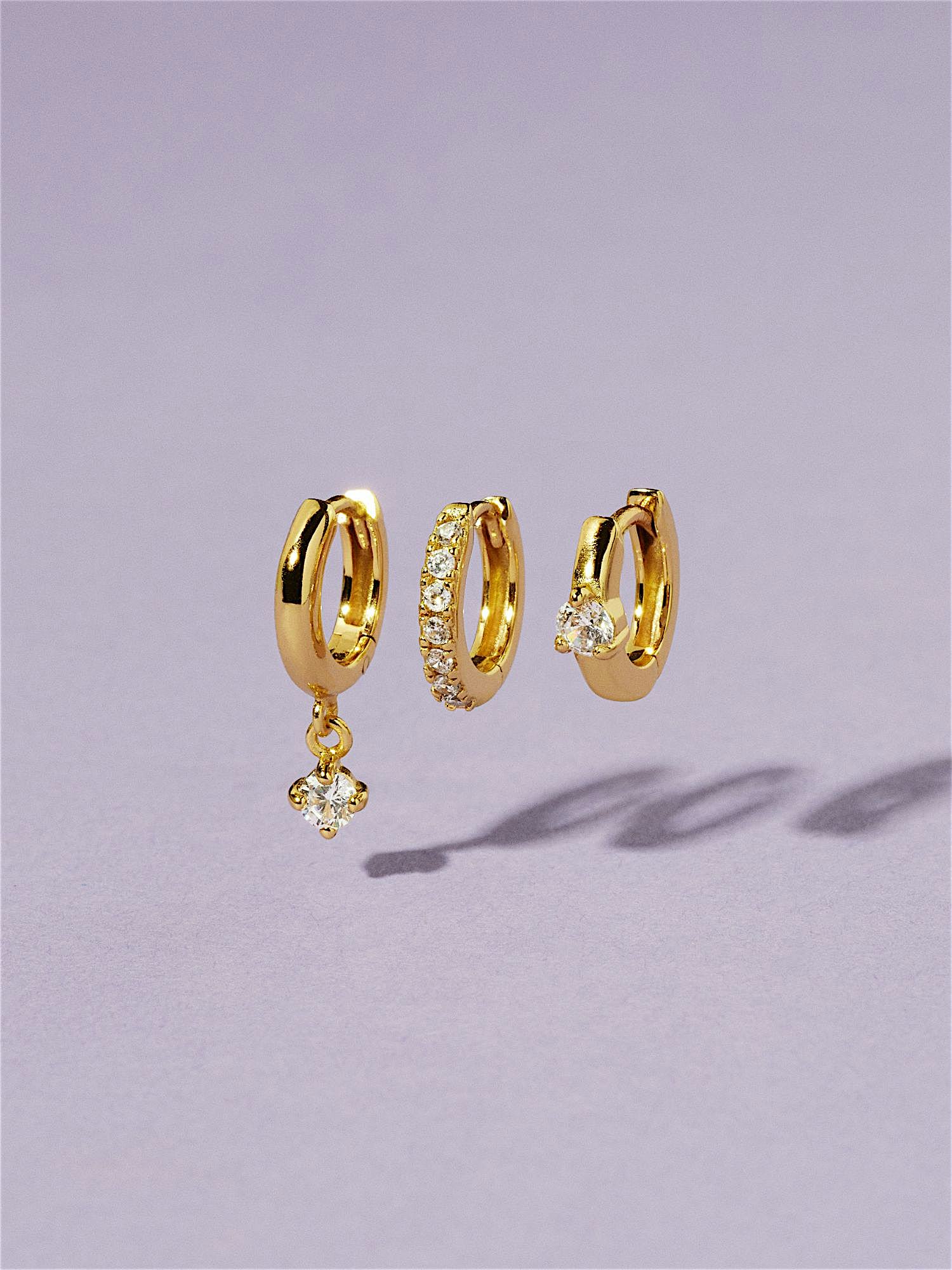 3-pack single hoops in genuine 925 sterling silver, decorated with clear Cubic Zirconia stones. The gold earrings are plated with genuine 18 k gold and have a core of genuine 925 sterling silver. This product is made from 100% recycled silver.