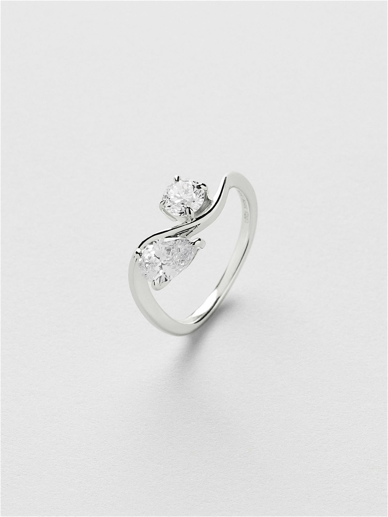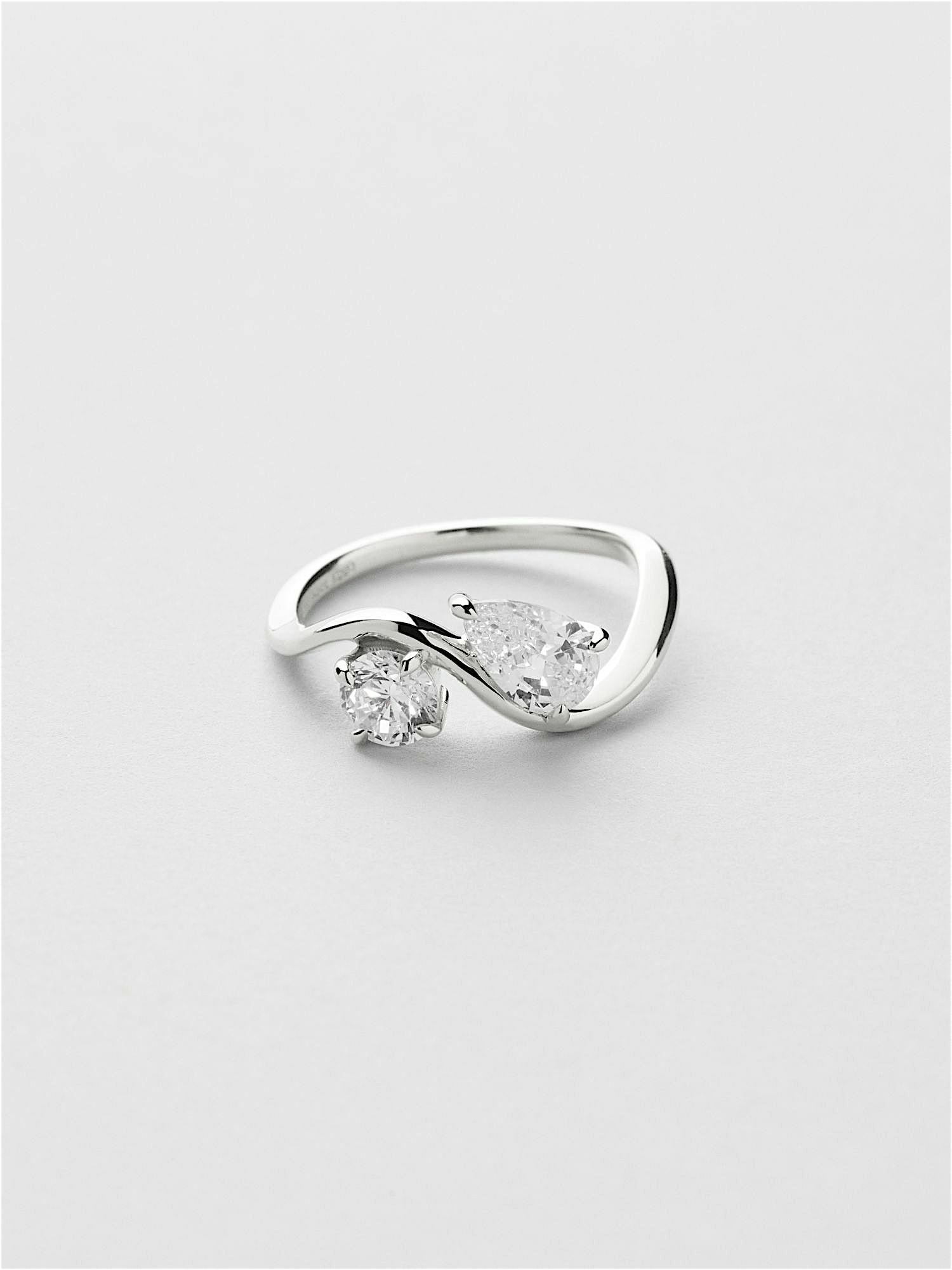 Ring in genuine 925 sterling silver, decorated with two clear Cubic Zirconia stones in different shapes. The gold ring is plated with genuine 24K gold and has a core of genuine 925 sterling silver. This product is made from 100% recycled silver.