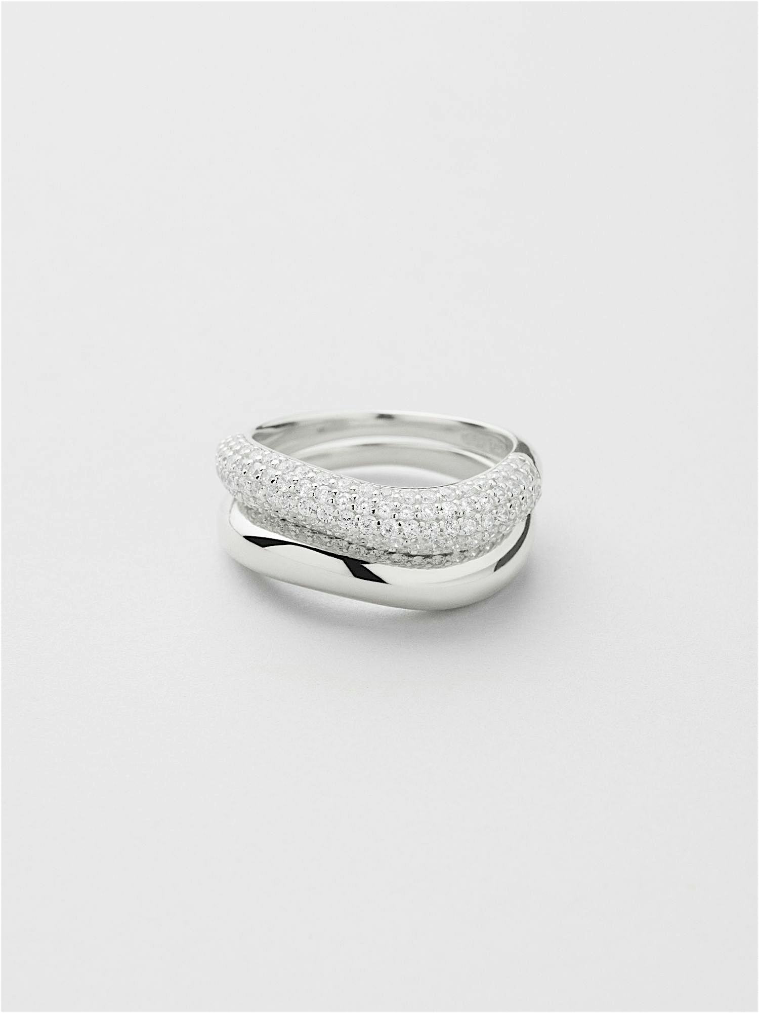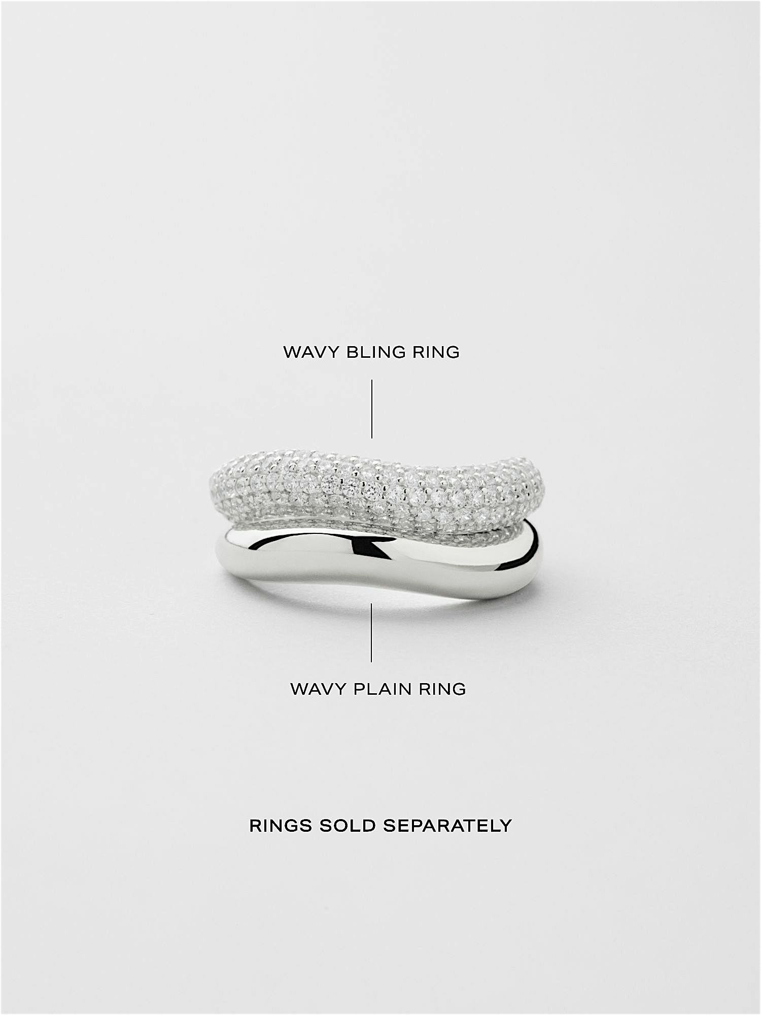 Wavy ring in genuine 925 sterling silver, adorned with clear Cubic Zirconia stones. The gold ring is plated with genuine 24K gold and has a core of genuine 925 sterling silver. This product is made from 100% recycled silver.