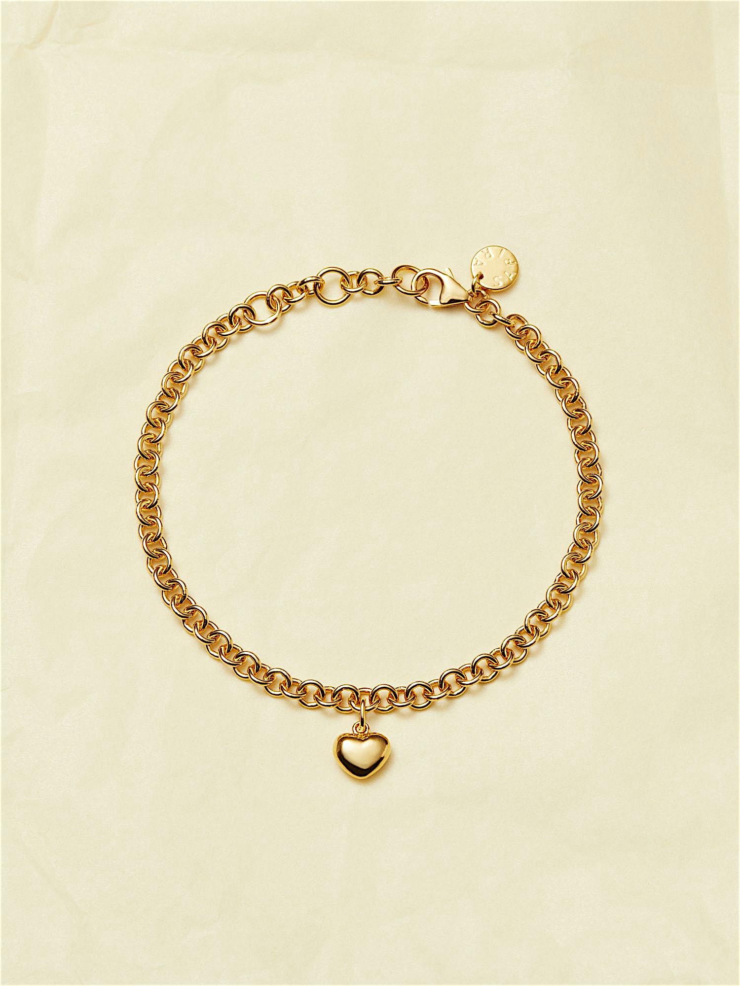 Bracelet with a rolo chain and a puffy heart in genuine 925 sterling silver. The gold bracelet is plated with genuine 24K gold and has a core of genuine 925 sterling silver. This product is made from 100% recycled silver.
