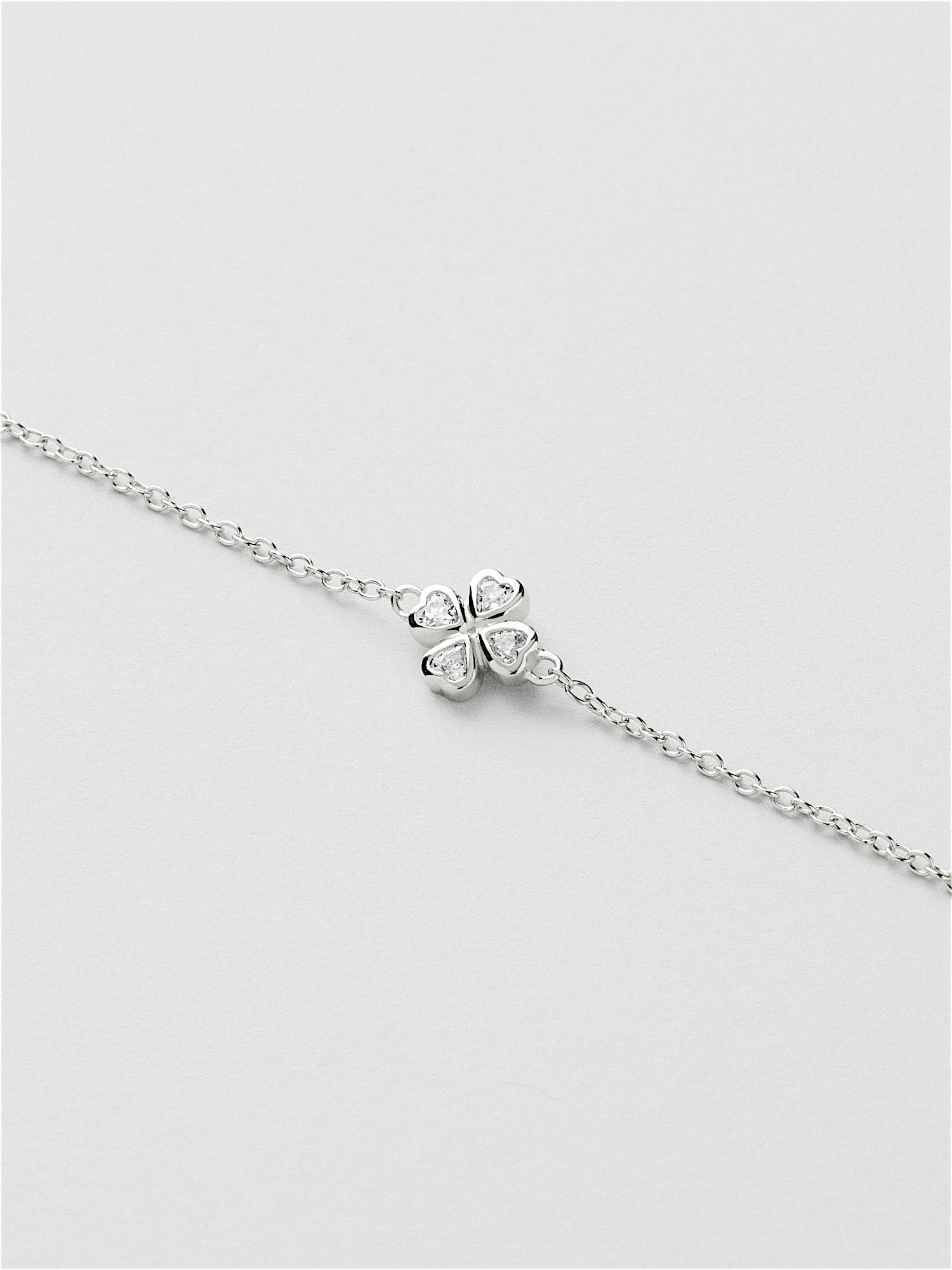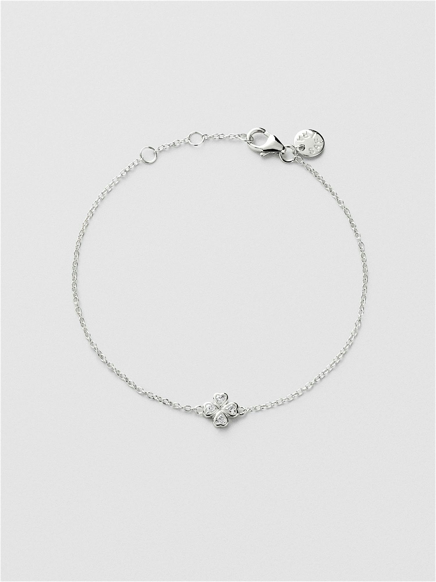 Armbånd i ekte 925 sterling sølv, dekorert med klare Cubic Zirconia-stener i en bezelinnfatning formet som en firkløver. Gullarmbåndet er belagt med ekte 18K gull og har en kjerne av ekte 925 sterling sølv. Dette produktet er laget av 100 % resirkulert sølv.