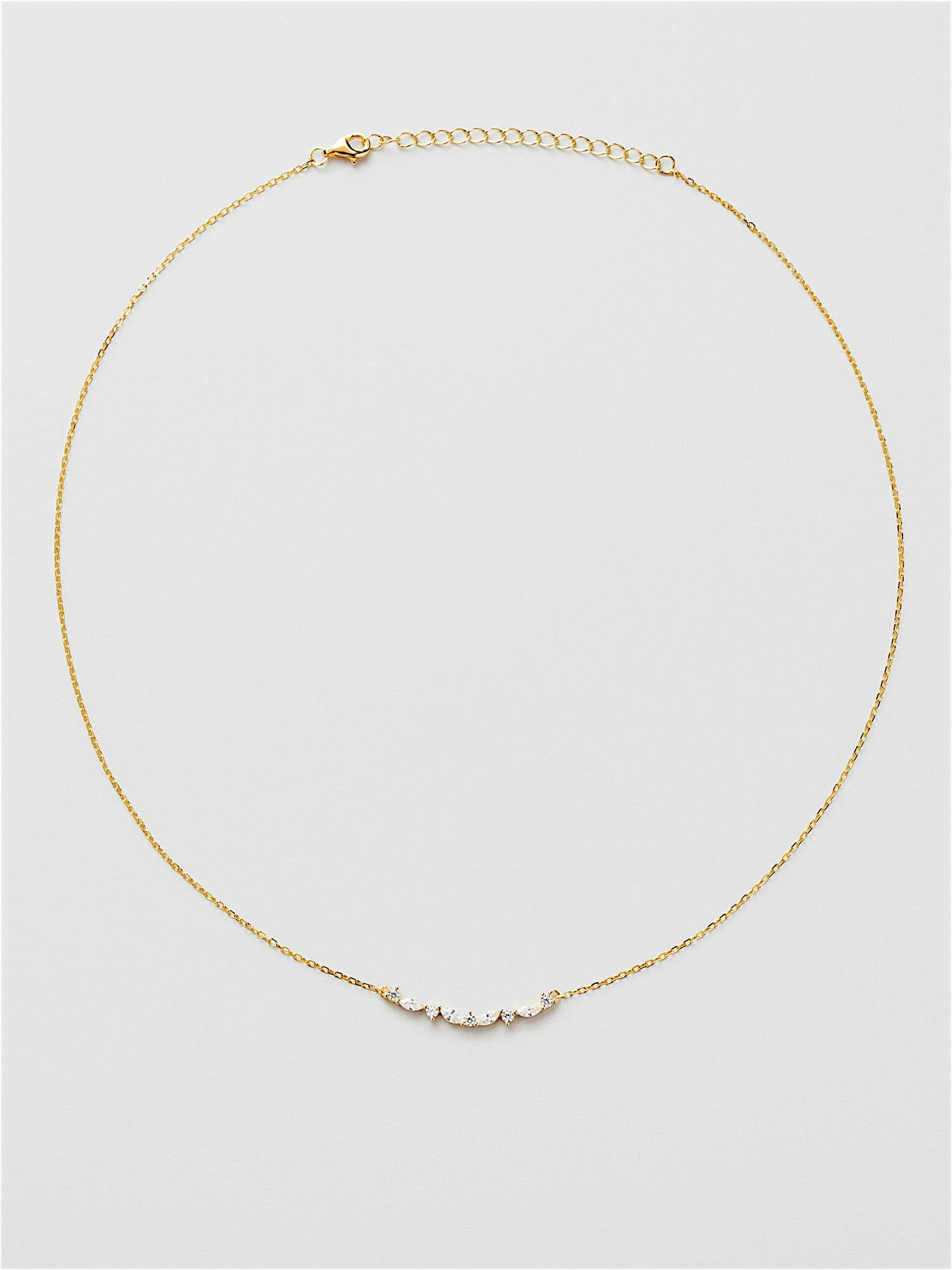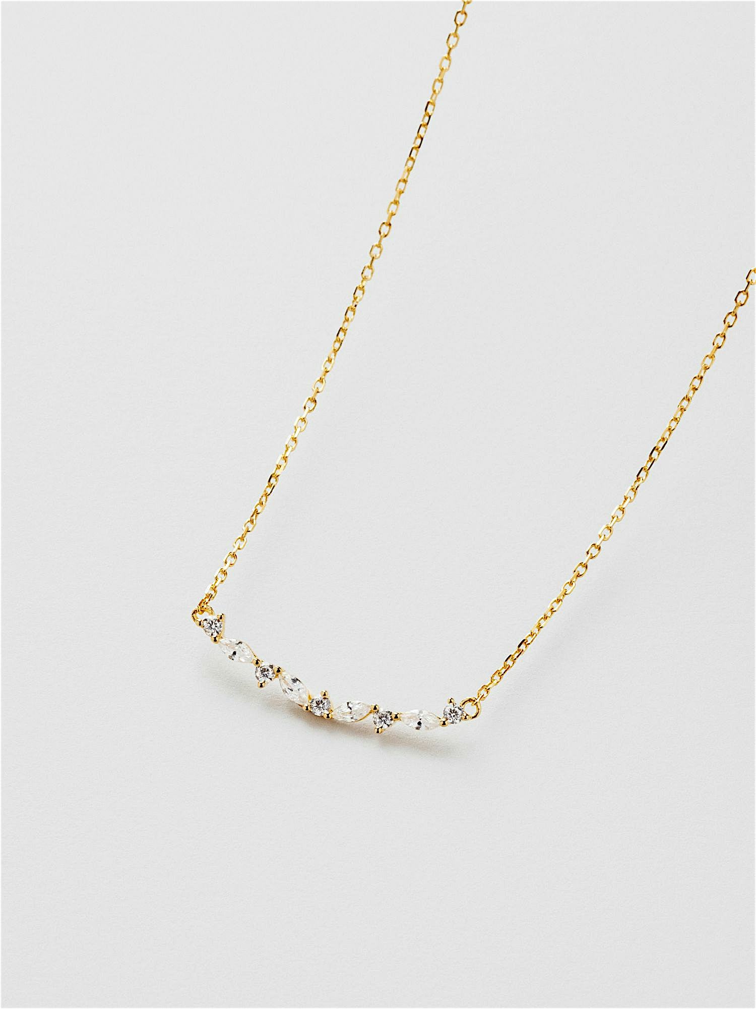 Halskjede i ekte 925 sterling sølv, dekorert med klare Cubic Zirconia-stener. Gullhalskjedet er belagt med ekte 18 k gull og har en kjerne av ekte 925 sterling sølv. Dette produktet er laget av 100 % resirkulert sølv.