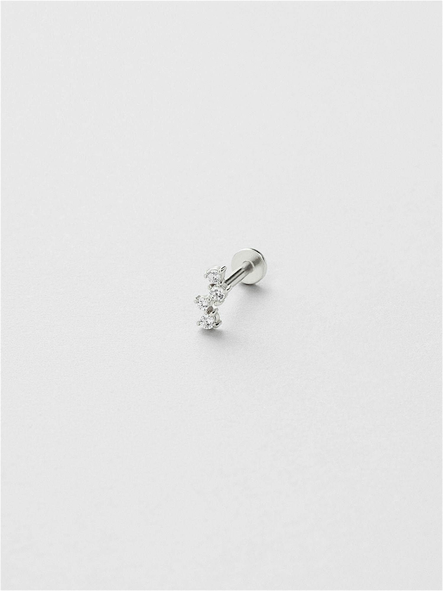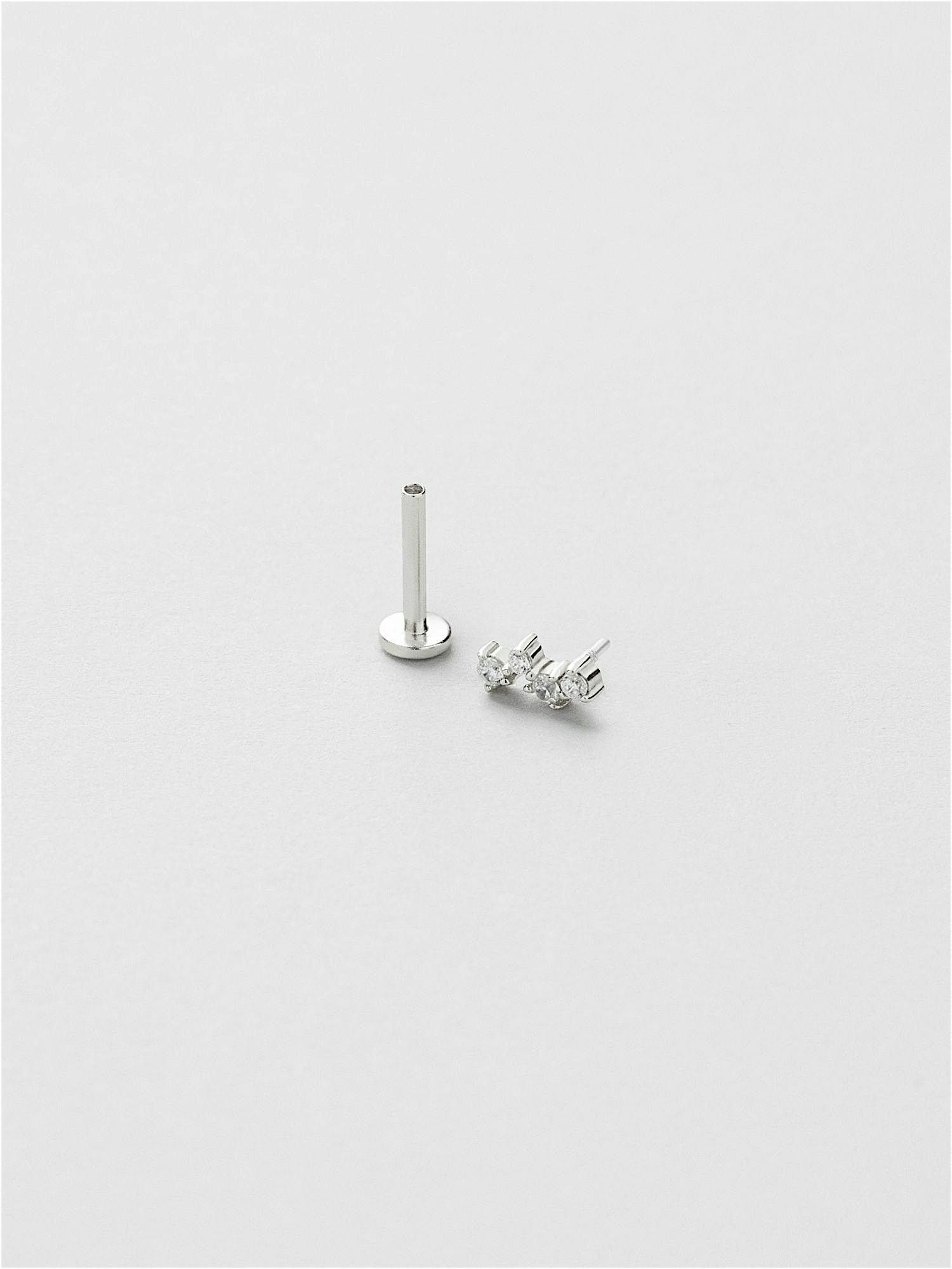 Piercing i äkta 925 sterling silver, dekorerade med klara Cubic Zirconia stenar. Guldsmycket är förgyllt med äkta 18K guld och har en kärna av äkta 925 sterling silver. Staven är tillverkad av äkta 925 sterling silver. Denna produkt är tillverkad av 100% återvunnet silver. Placera piercingens bakre del genom örat bakifrån och skruva fast med piercingens främre del.
