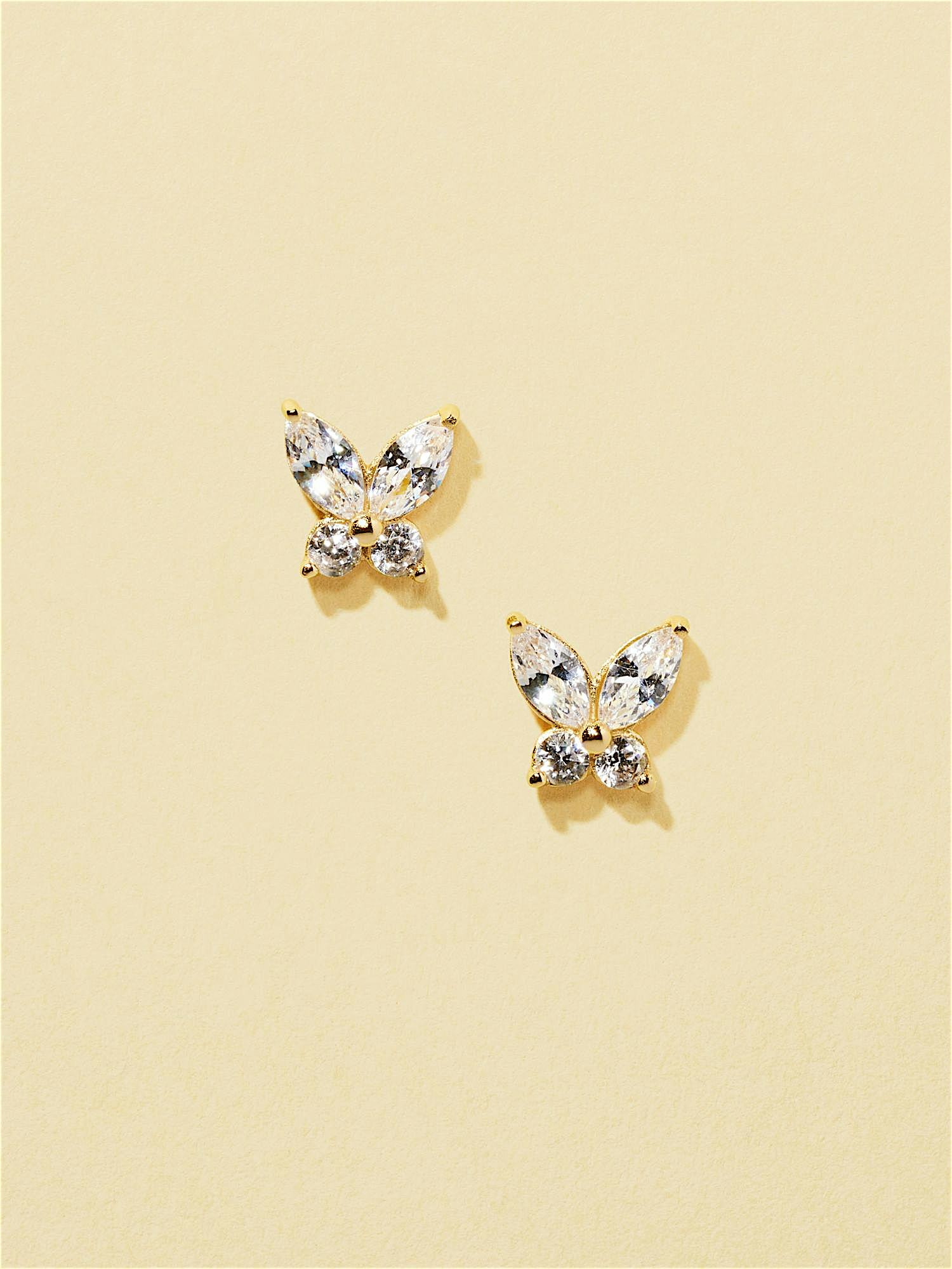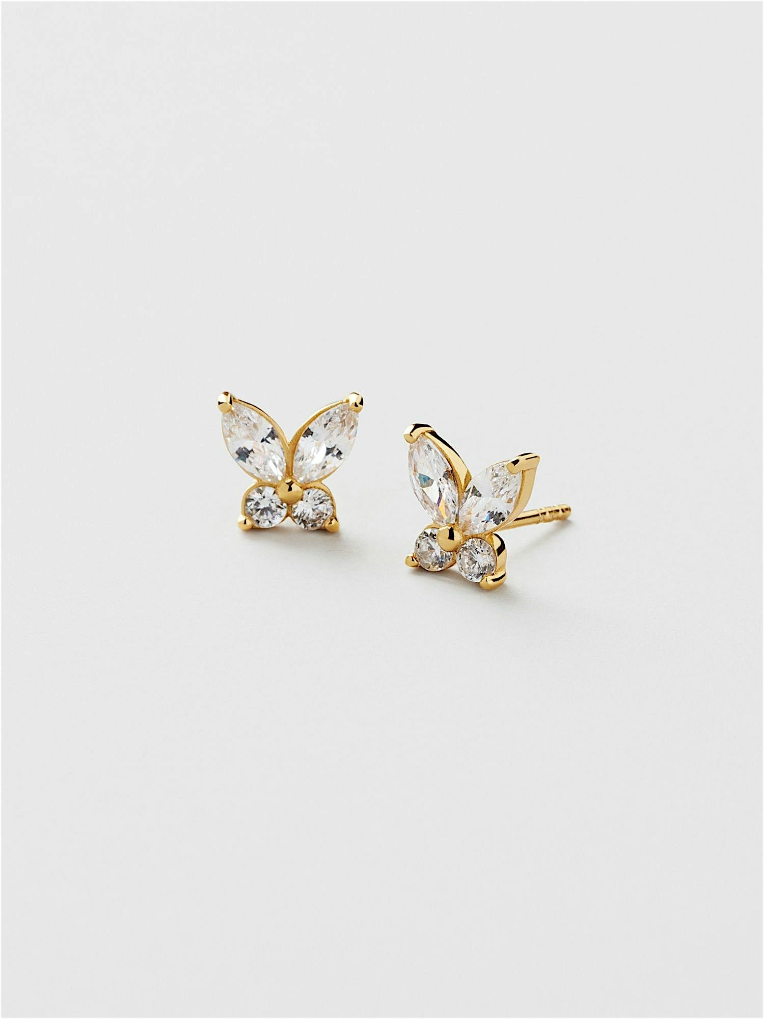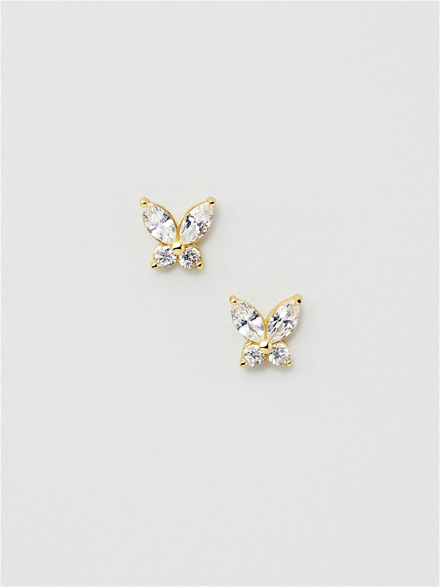Studs i form av en fjäril i äkta 925 sterling silver, prydda med klara Cubic Zirconia stenar. Guldörhängena är förgyllda med äkta 18K guld och har en kärna av äkta 925 sterling silver. Denna produkt är tillverkad av 100% återvunnet silver.