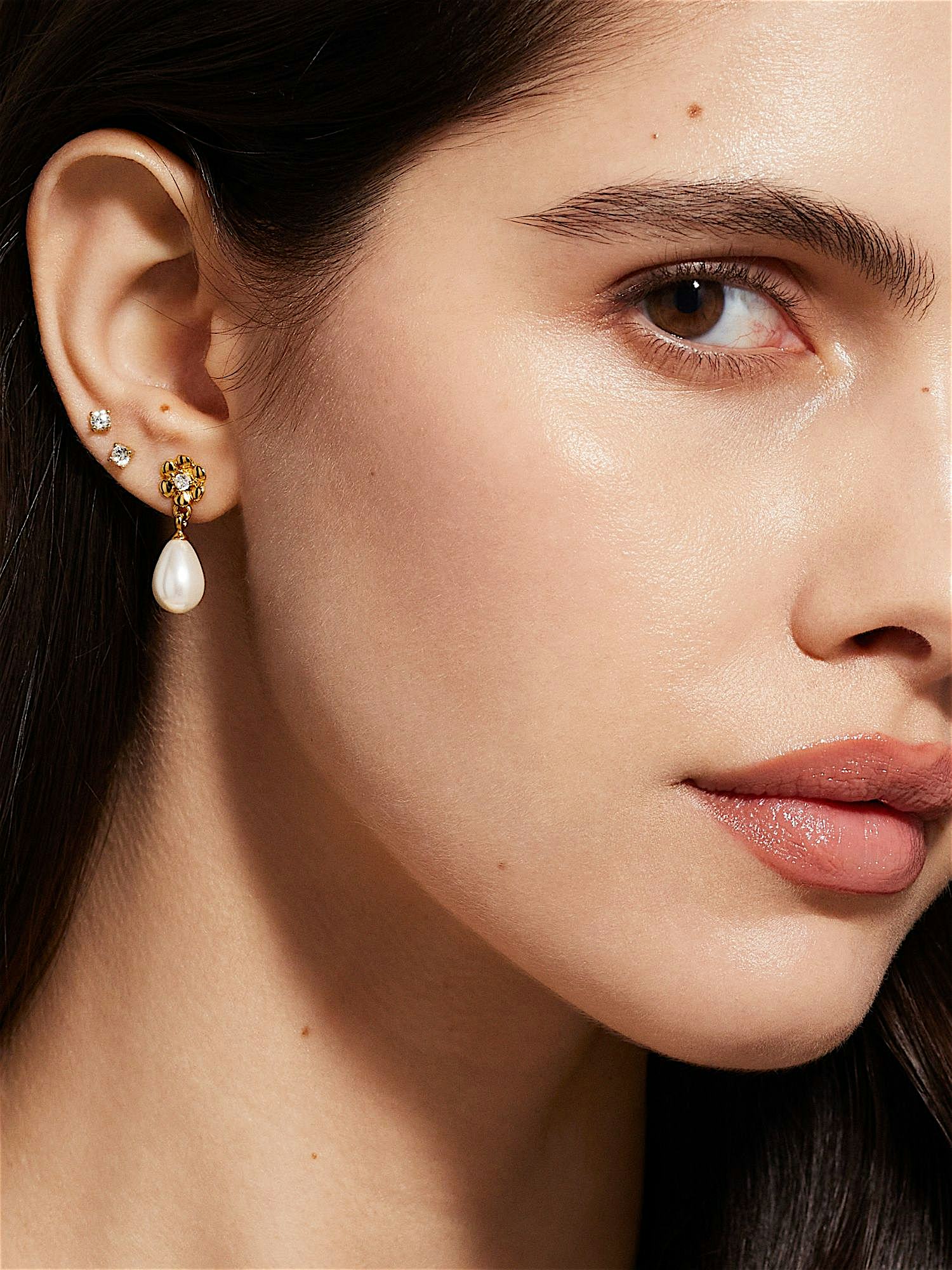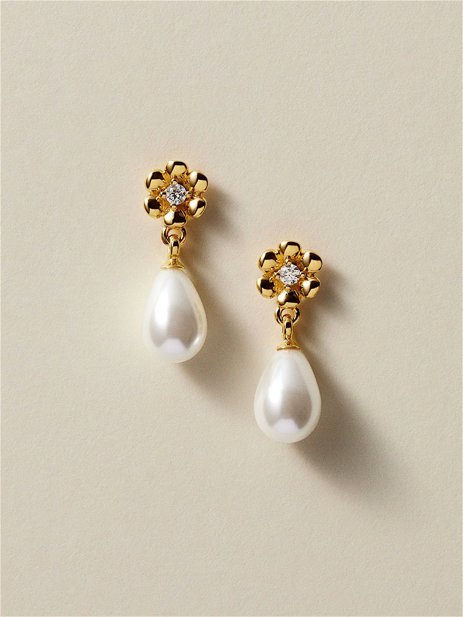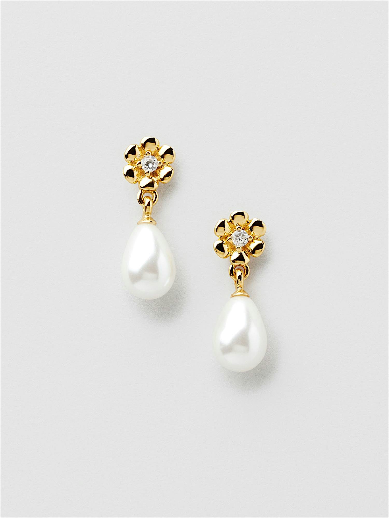 Blomörhängen i äkta 925 sterling silver, dekorerade med sötvattenspärlor och klara Cubic Zirconia stenar. Guldörhängena är förgyllda med äkta 24K guld och har en kärna av äkta 925 sterling silver. Denna produkt är tillverkad av 100% återvunnet silver.