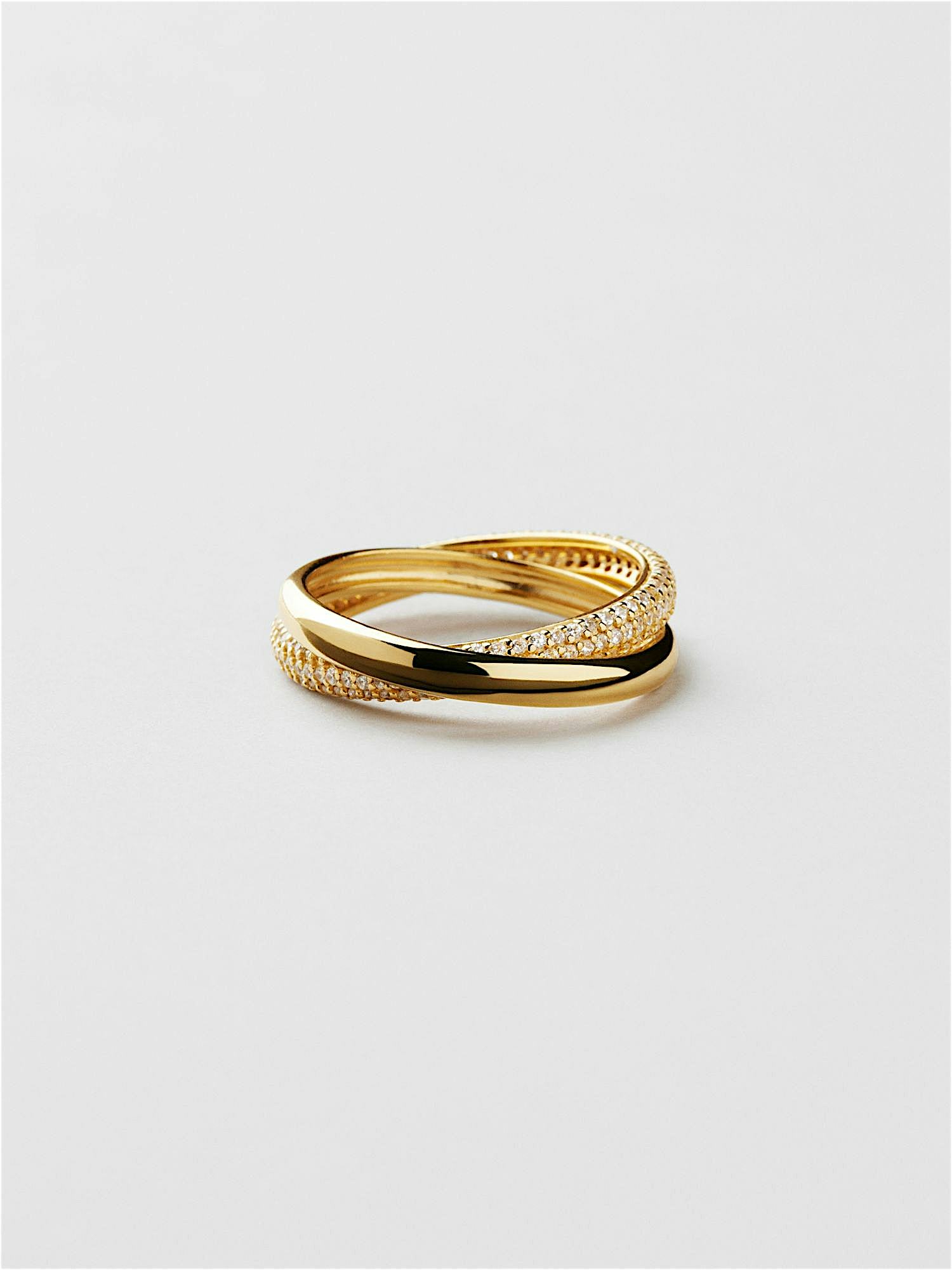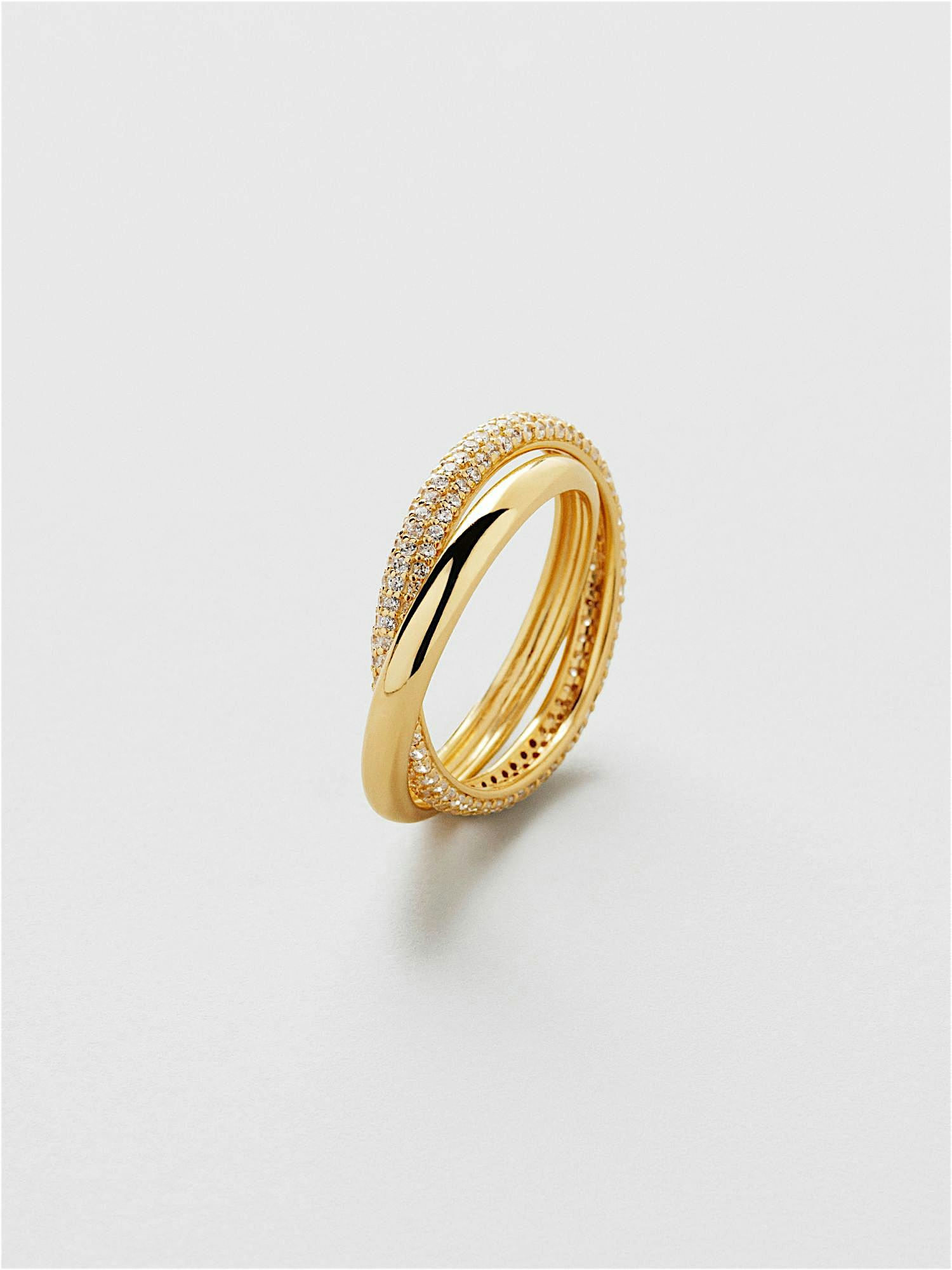 Två sammanlänkade ringar i äkta 925 sterling silver - en graverbar och en dekorerad med klara Cubic Zirconia stenar. Guldringarna är förgyllda med äkta 24K guld och har en kärna av äkta 925 sterling silver. Denna produkt är tillverkad av 100% återvunnet silver.