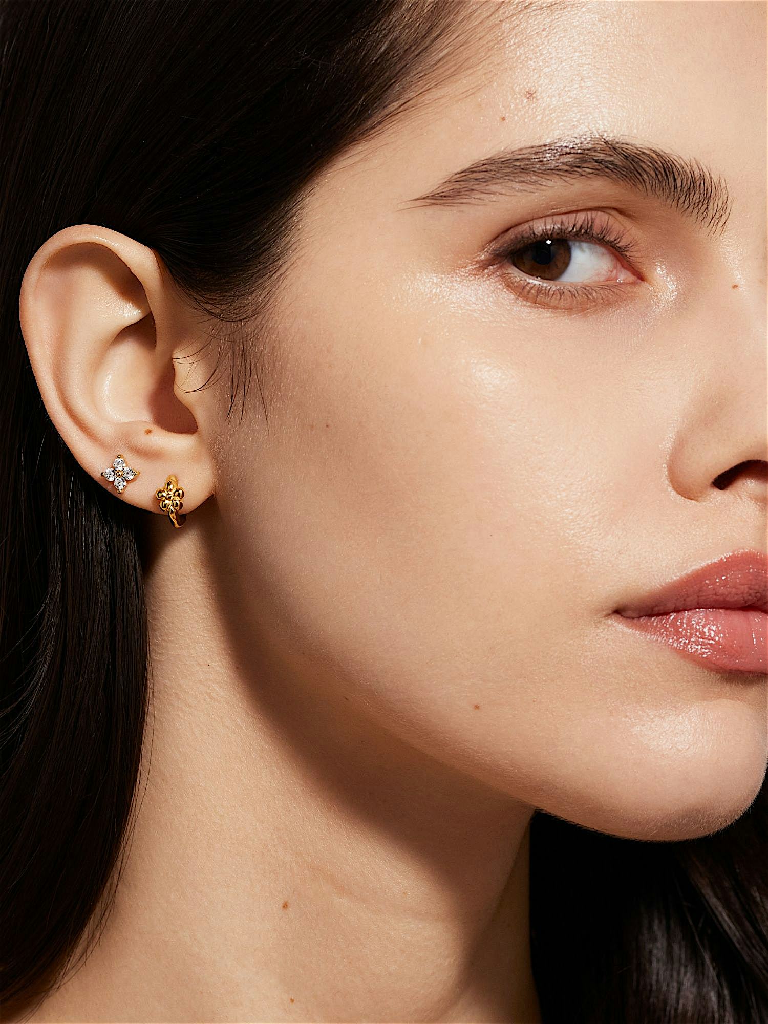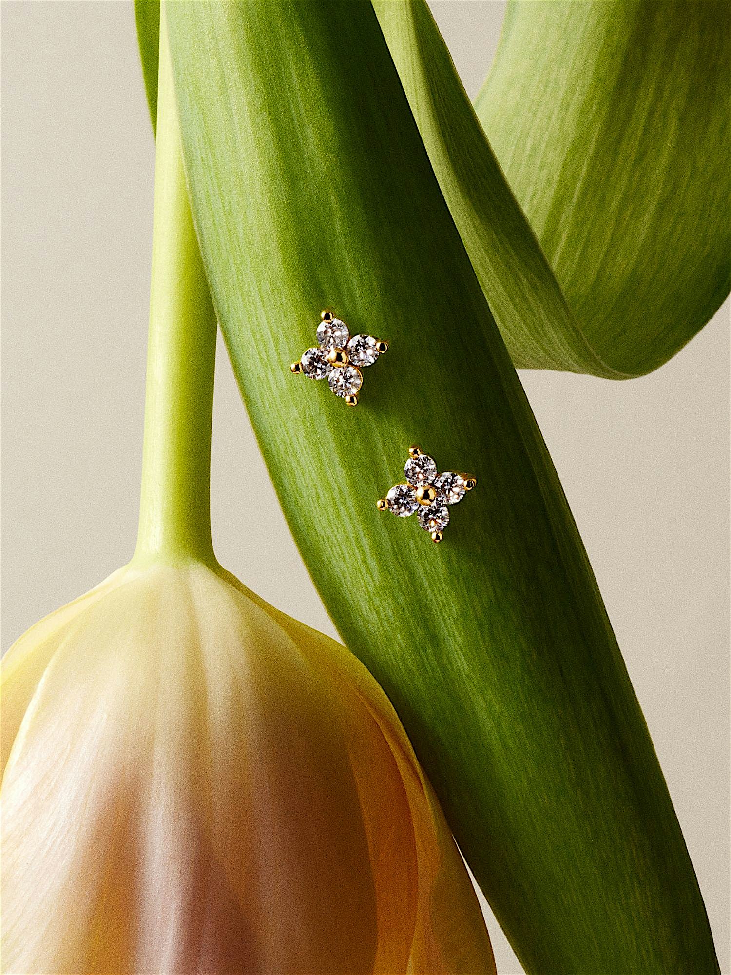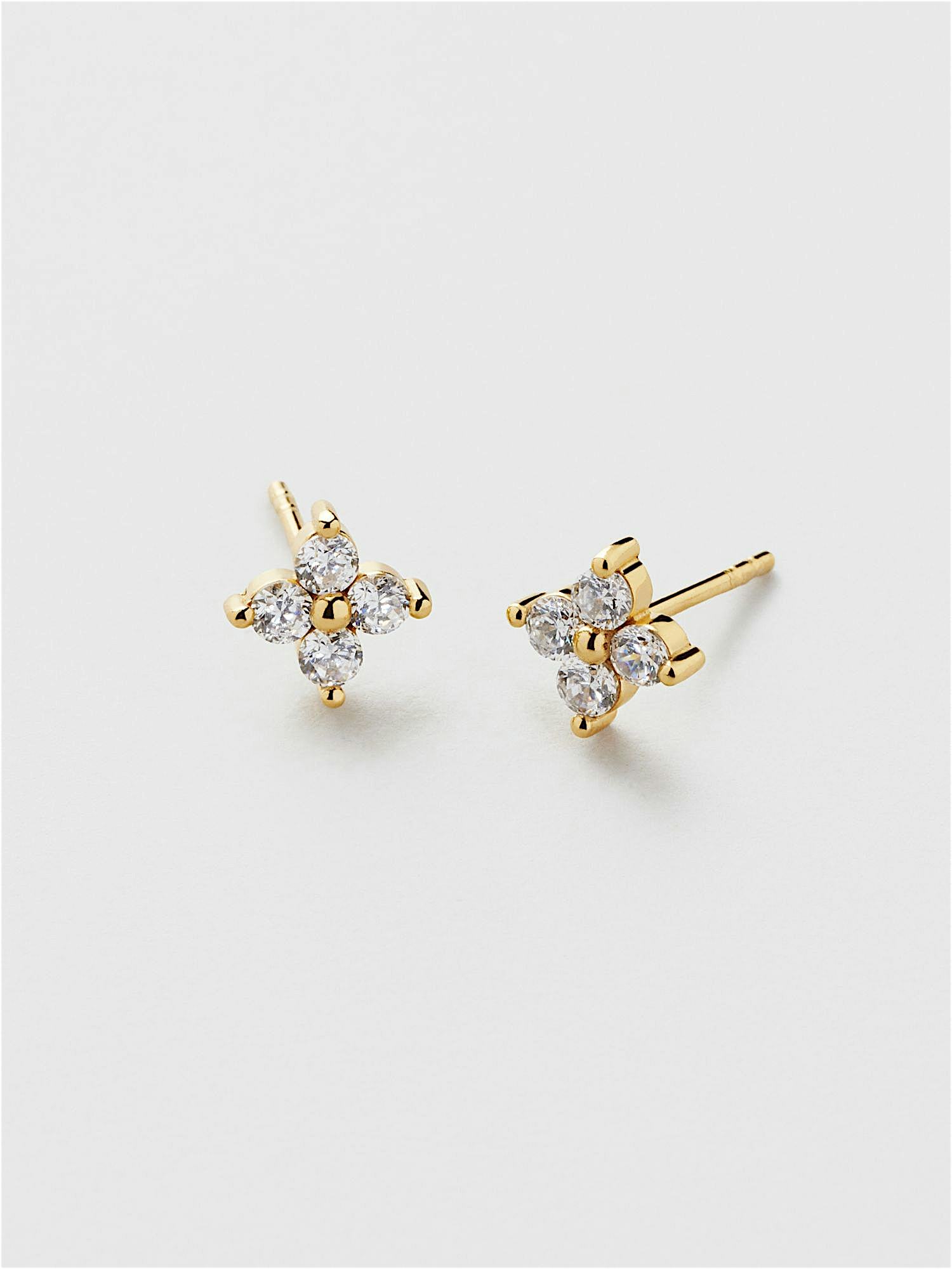 Studs örhängen i äkta 925 sterling silver, prydda med klara Cubic Zirconia stenar. Guldörhängena är förgyllda med äkta 24K guld och har en kärna av äkta 925 sterling silver. Denna produkt är tillverkad av 100% återvunnet silver.