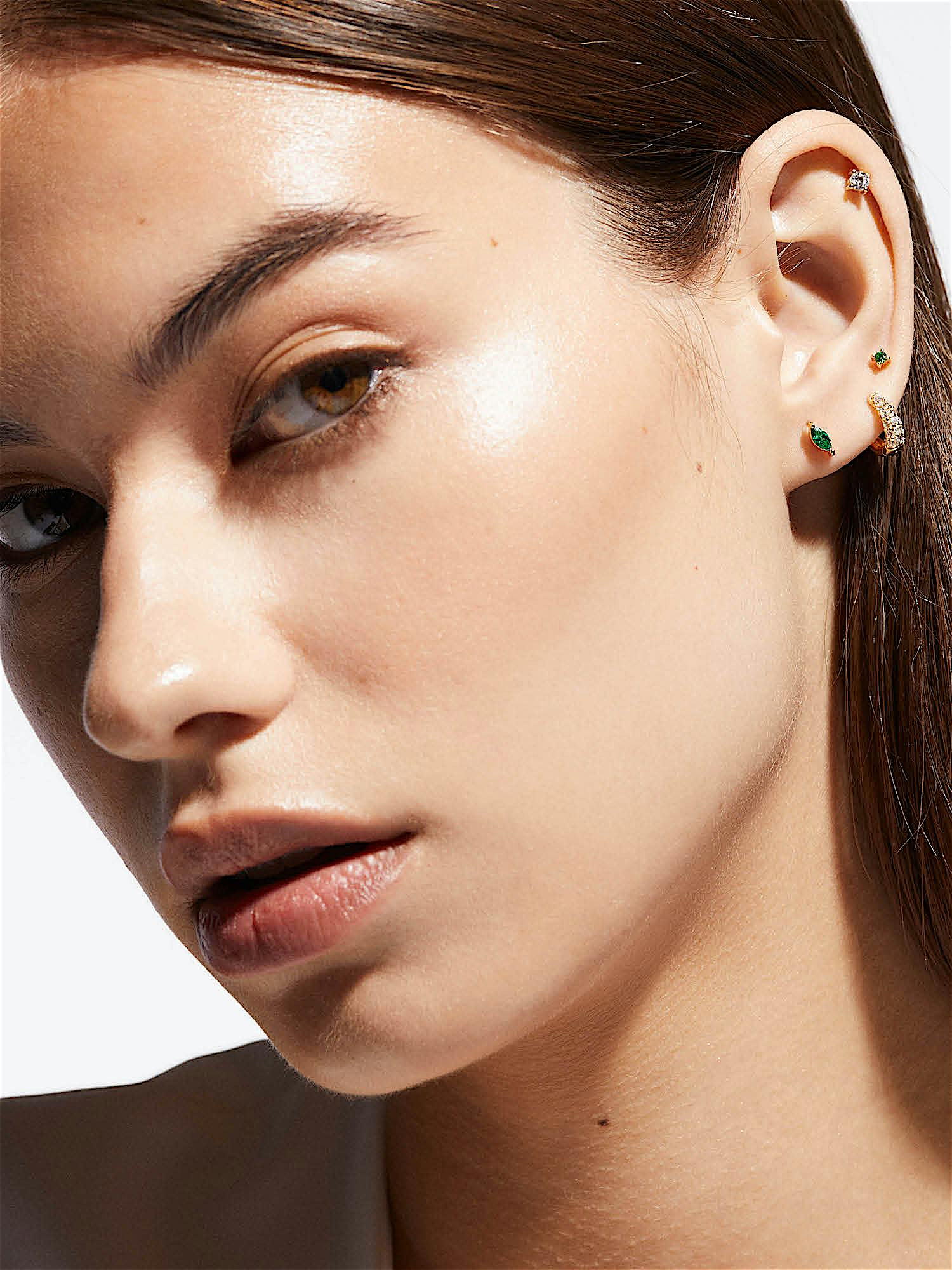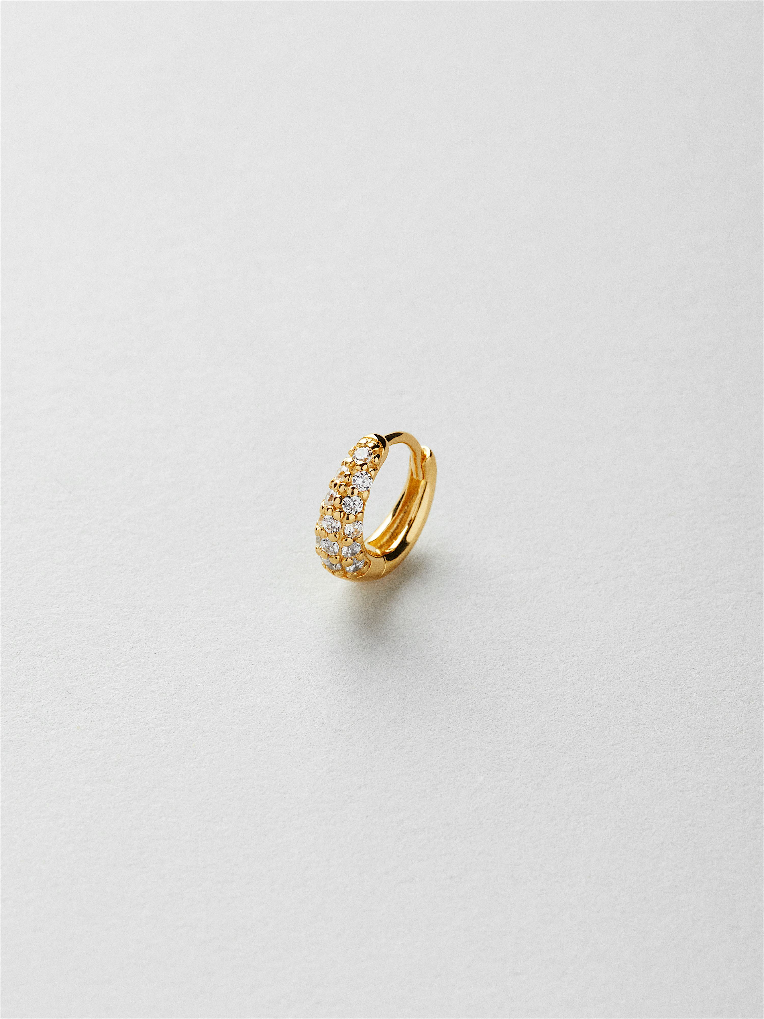Huggie hoop i äkta 925 sterling silver, prydd med klara Cubic Zirconia stenar. Guldsmycket är förgyllt med äkta 24K guld och har en kärna av 925 sterling silver. Denna produkt är tillverkad av 100% återvunnet silver.