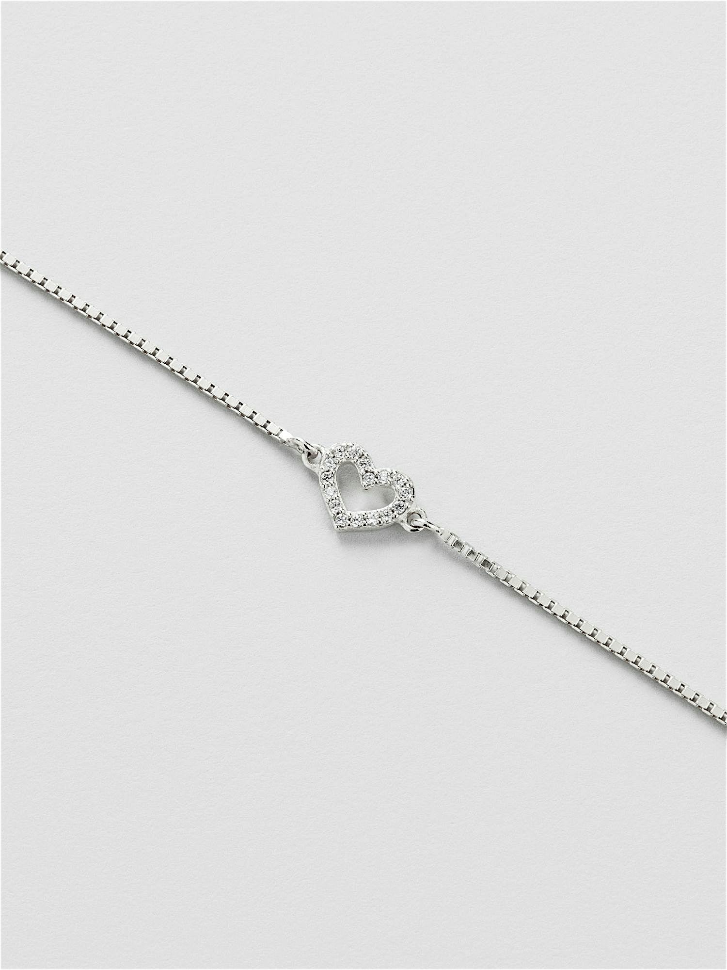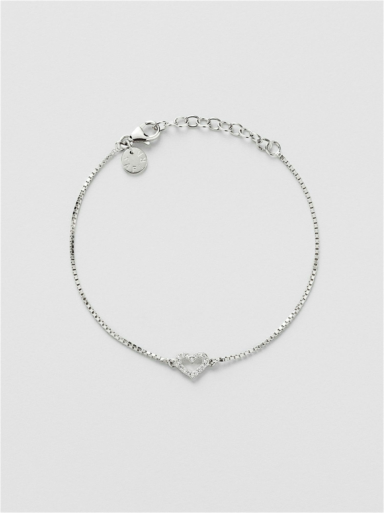 Hjärtarmband med boxkedja i äkta 925 sterling silver. Hjärtat är dekorerat med klara Cubic Zirconia stenar i pavéfattning. Guldarmbandet är förgyllt med äkta 24K guld och har en kärna av äkta 925 sterling silver. Denna produkt är tillverkad av 100% återvunnet silver.