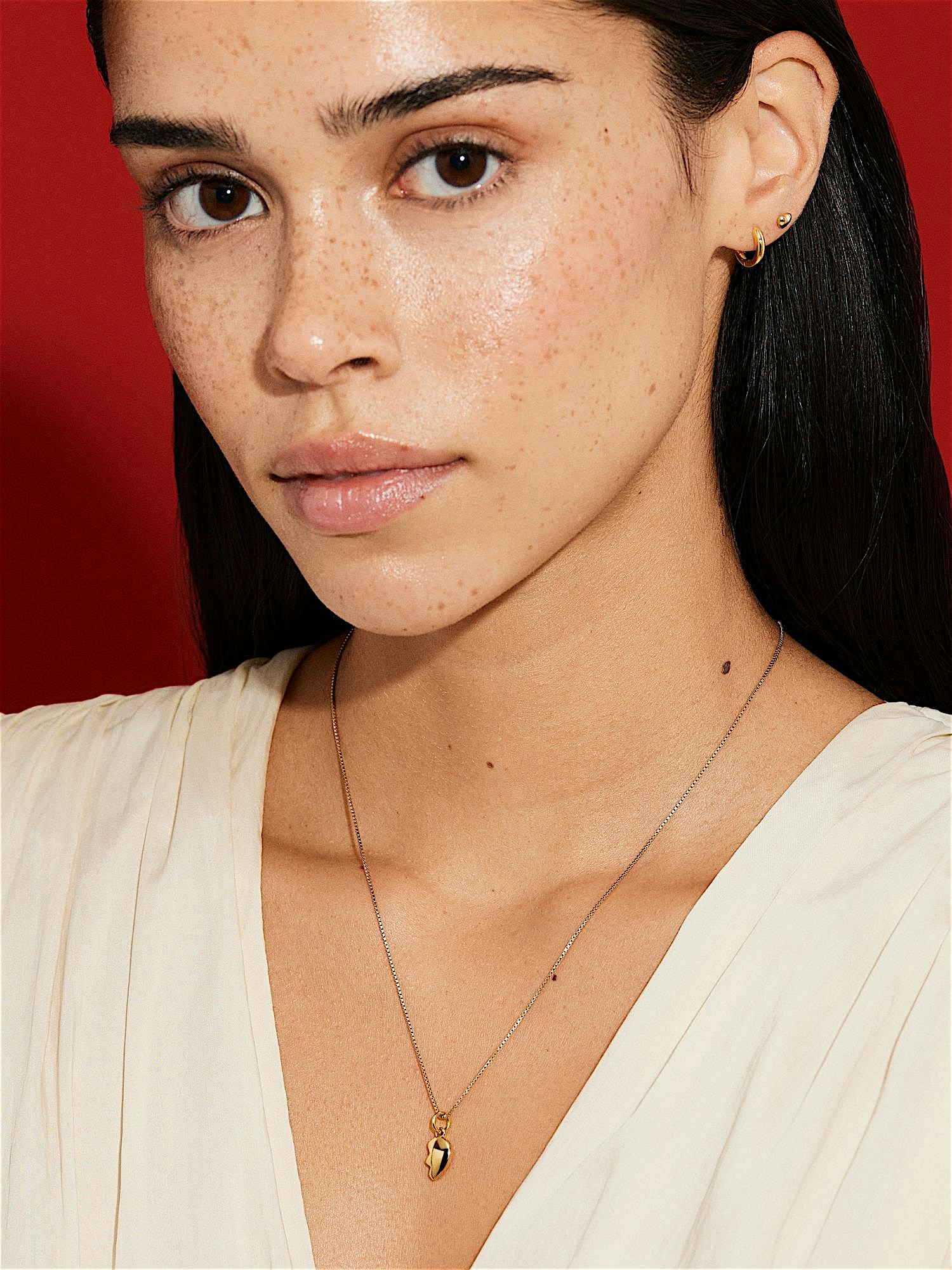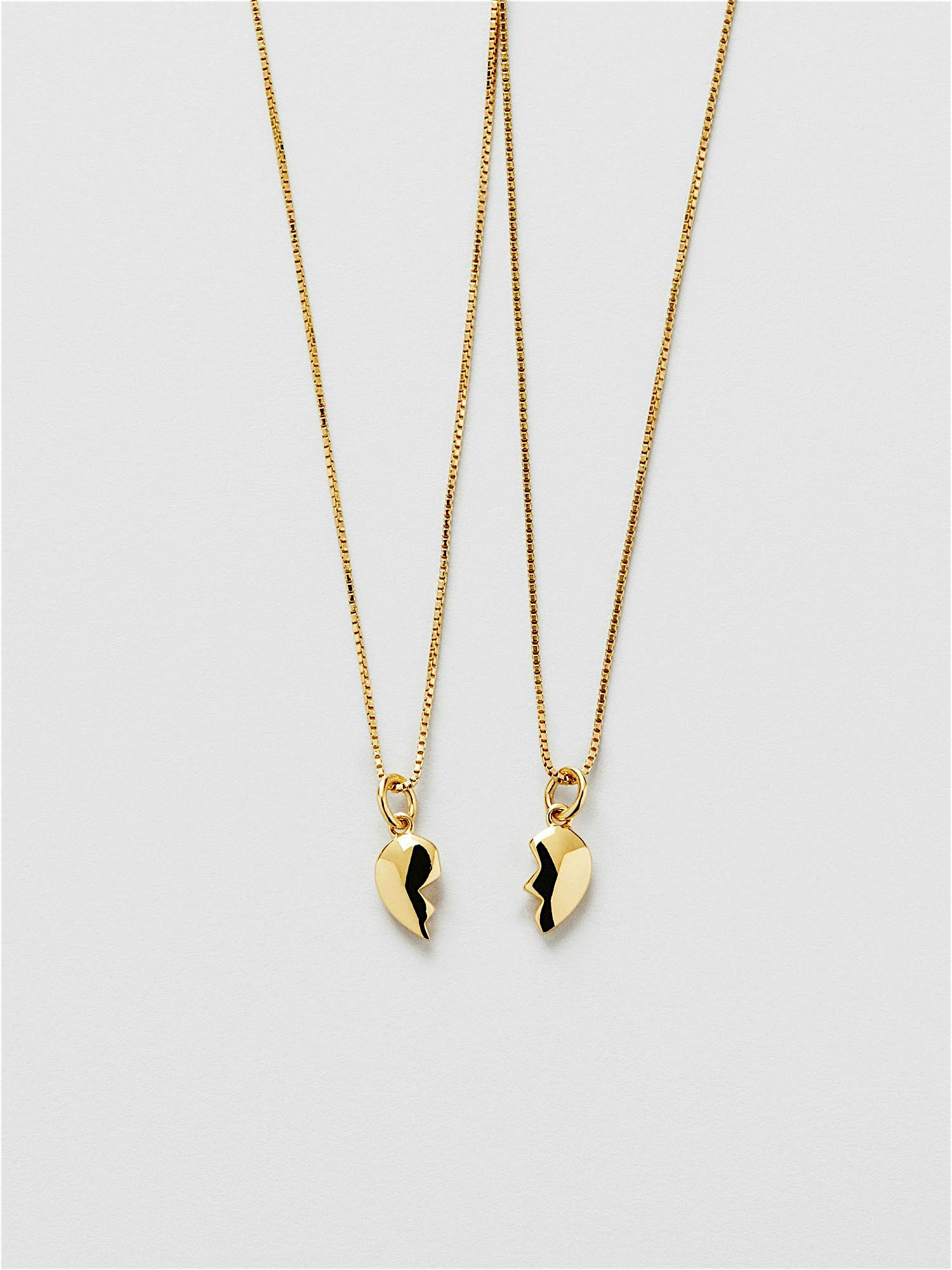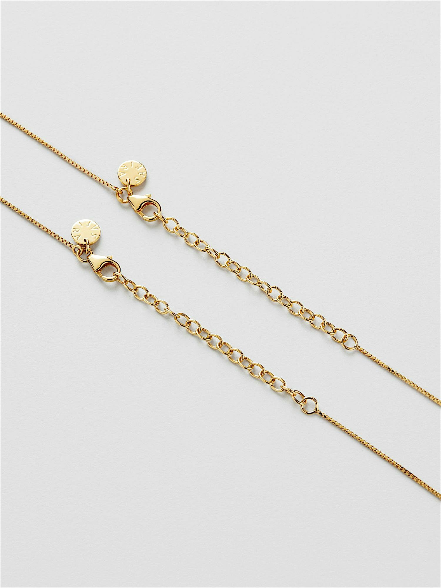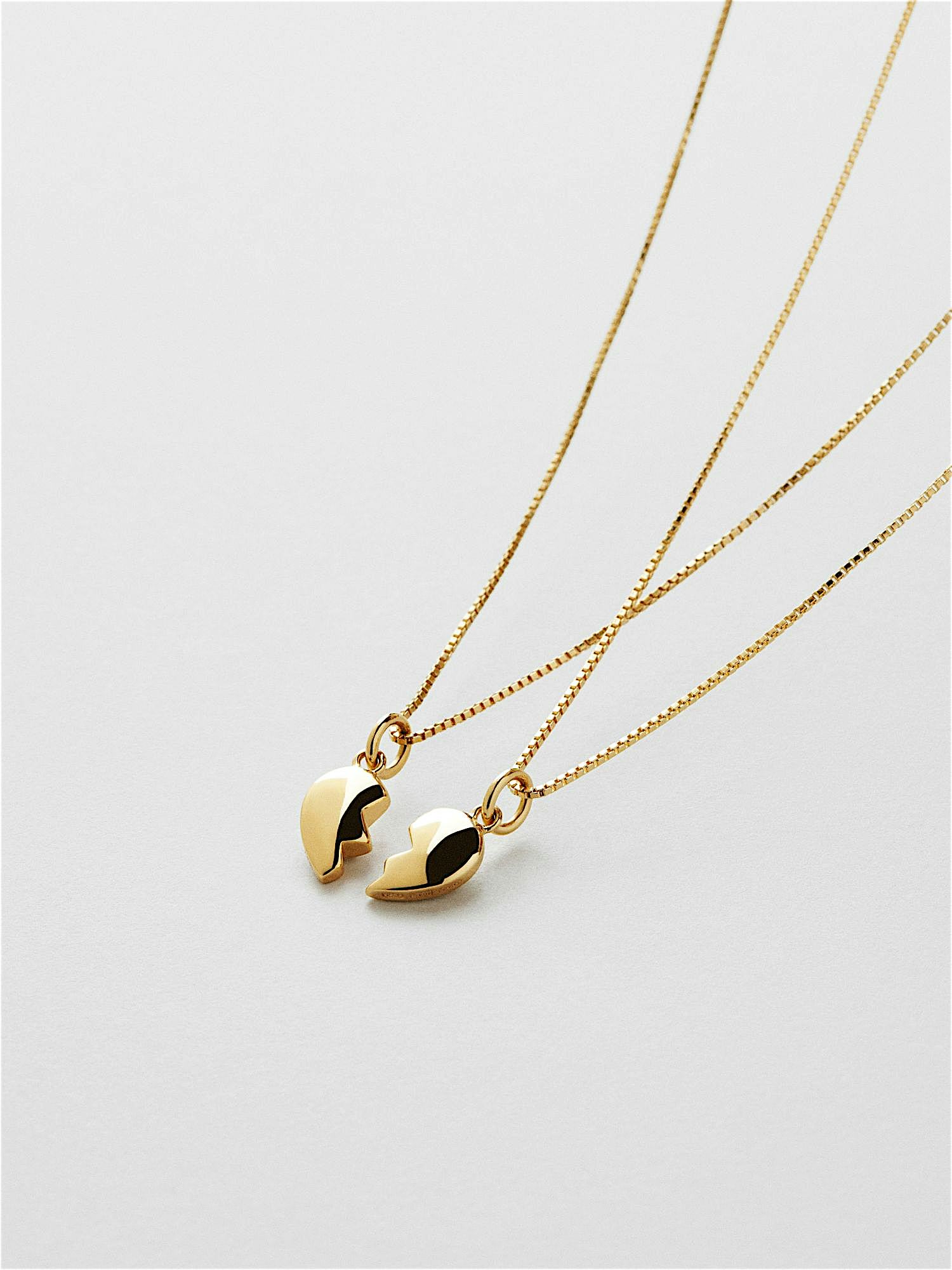 Två halsband med boxkedja och ett tudelat puffigt hjärta i äkta 925 sterling silver. Guldhalsbanden är förgyllda med äkta 24K guld och har en kärna av äkta 925 sterling silver. Denna produkt är tillverkad av 100% återvunnet silver.