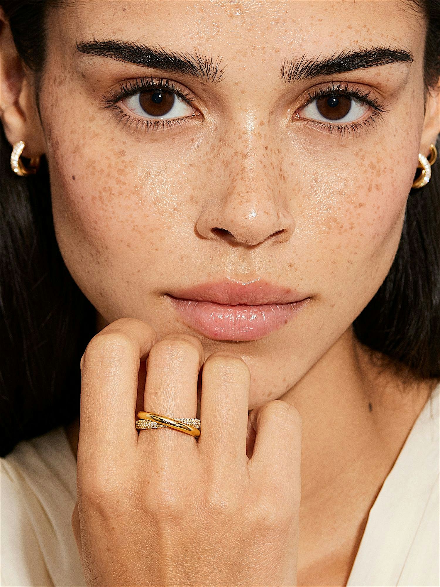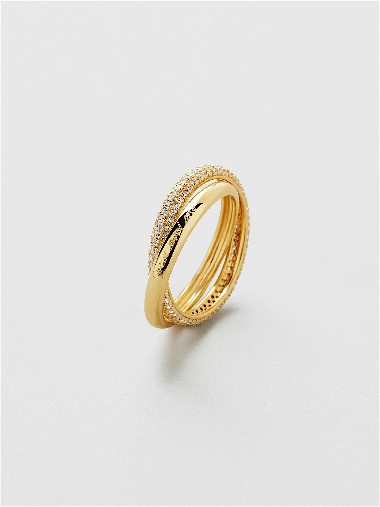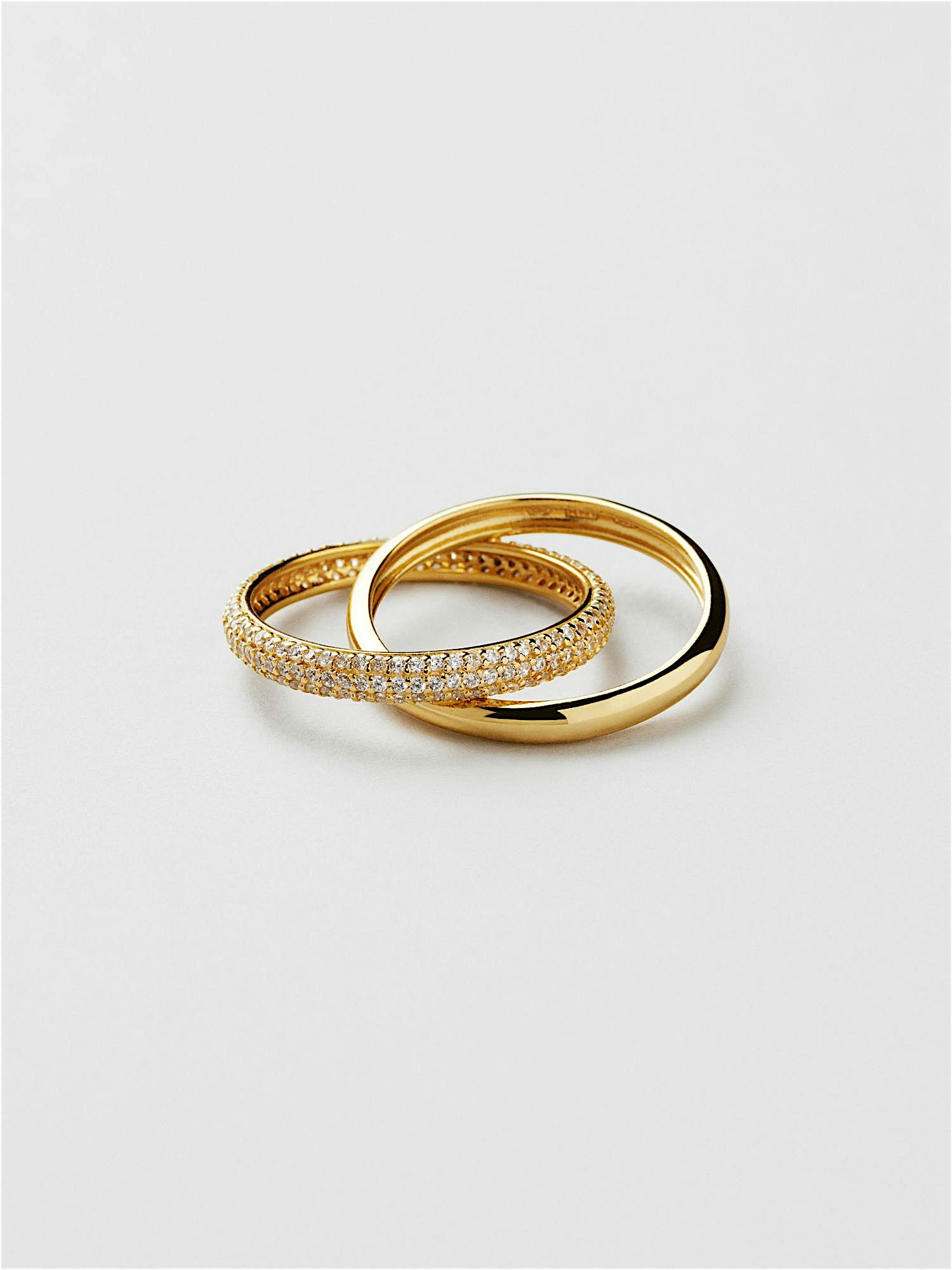 Two interlinked rings in genuine 925 sterling silver – one engravable and one decorated with clear Cubic Zirconia stones. The gold rings are plated with genuine 24K gold and have a core of genuine 925 sterling silver. This product is made from 100% recycled silver.
