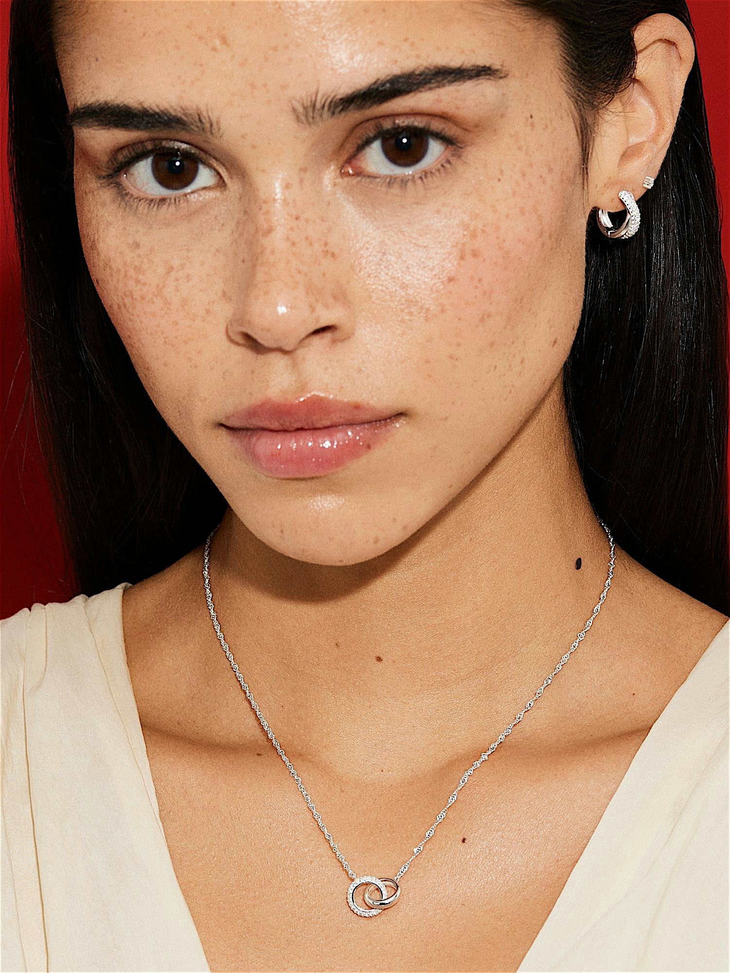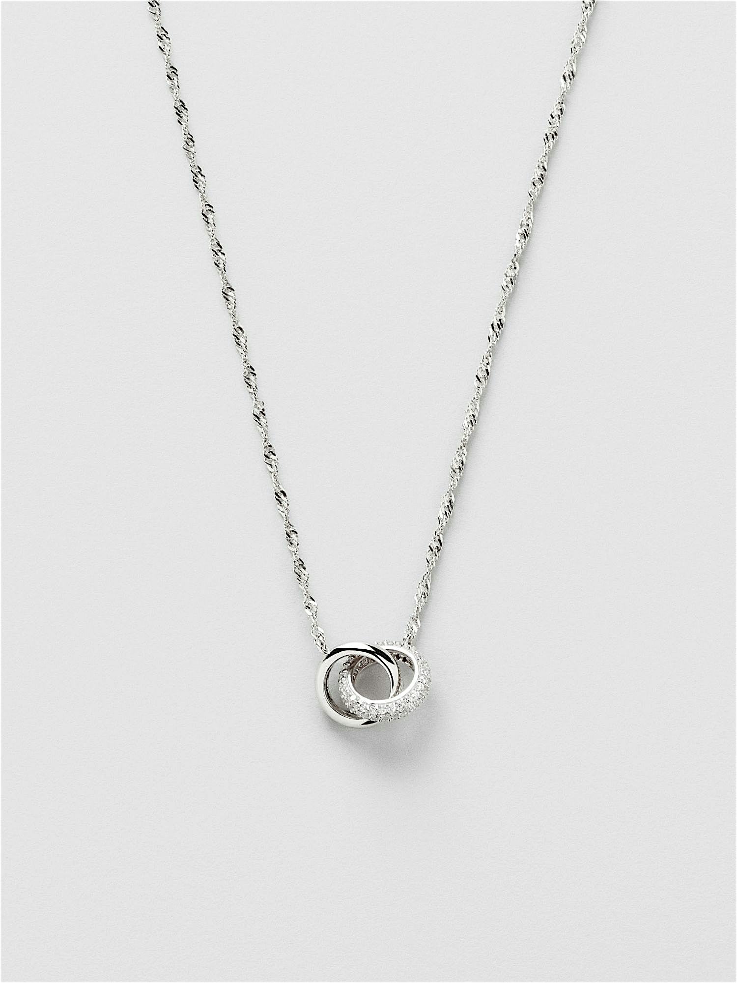 Necklace with a Singapore chain and two interlinked rings in genuine 925 sterling silver – one with a high polish finish and one with clear Cubic Zirconia stones. The gold necklace is plated with genuine 24K gold and has a core of genuine 925 sterling silver. This product is made from 100% recycled silver.