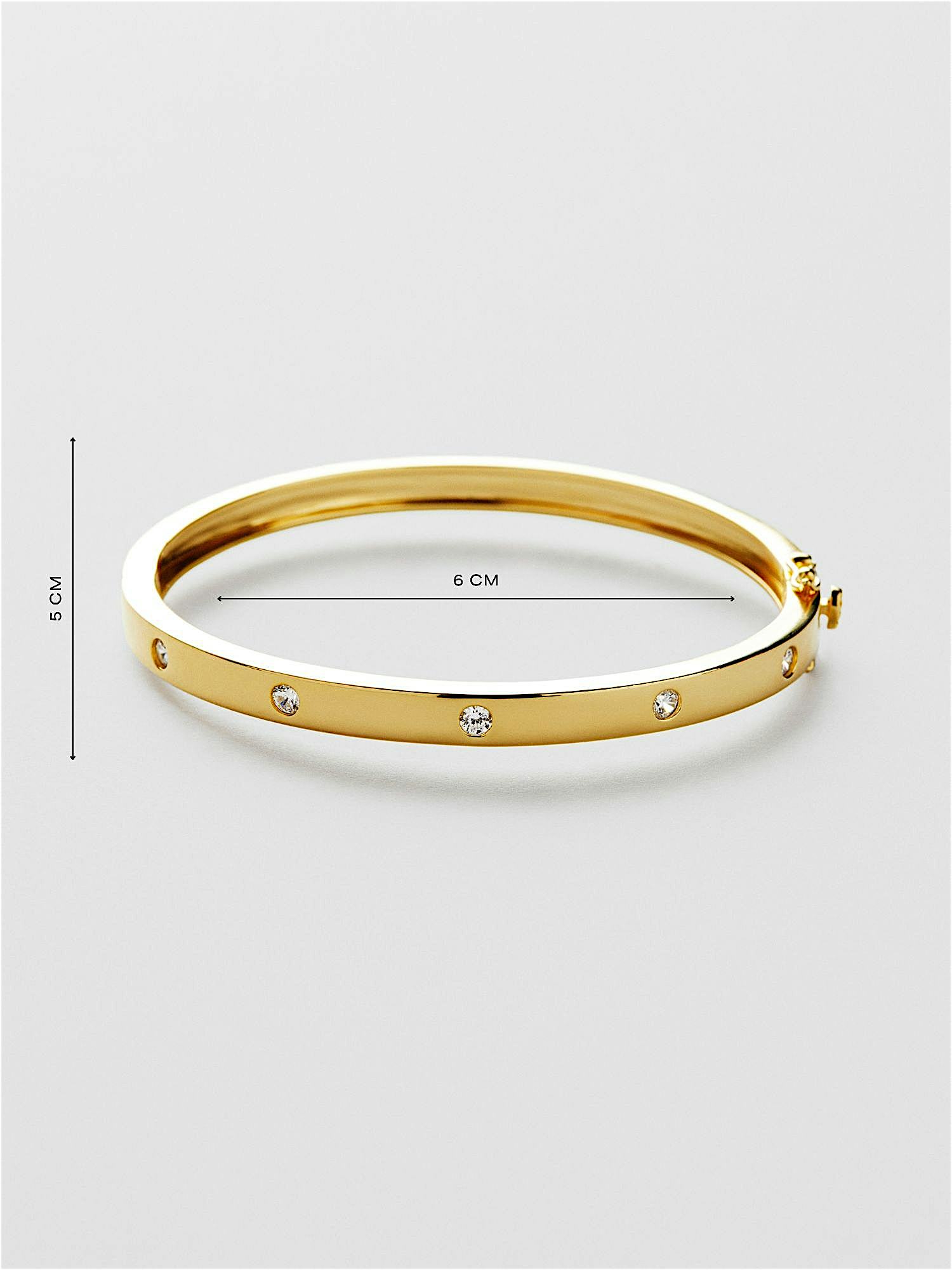 Classic bangle bracelet adorned with clear Cubic Zirconia stones in genuine 925 sterling silver. The gold bracelet is plated with genuine 18K gold and has a core of 925 sterling silver. This product is made from 100% recycled silver.