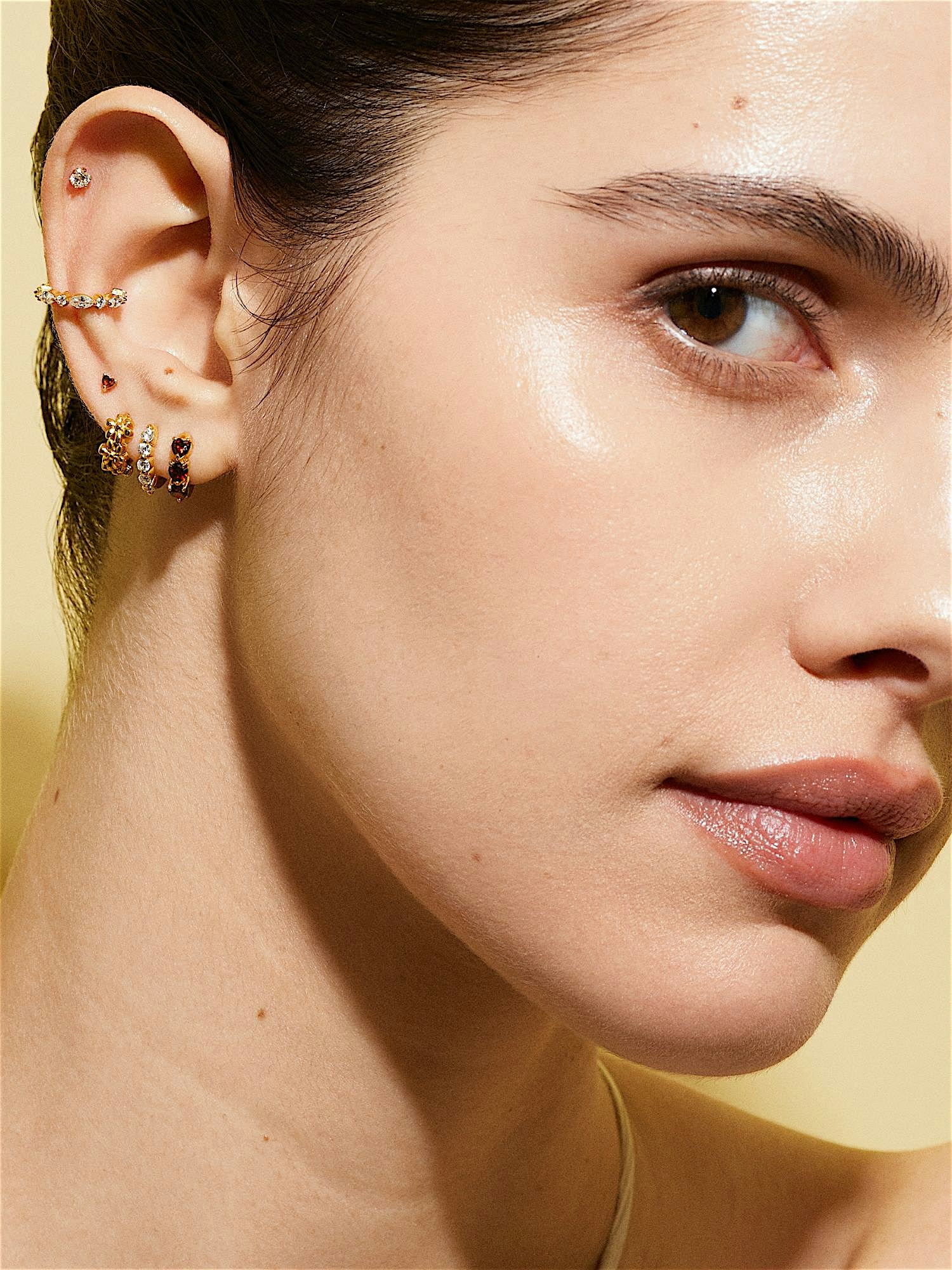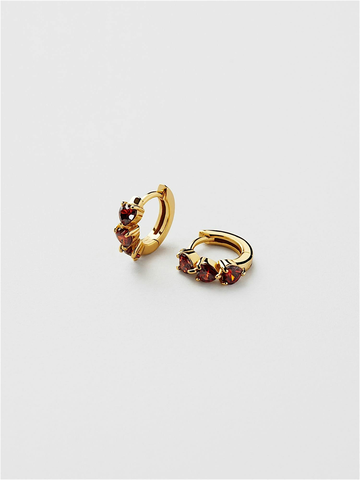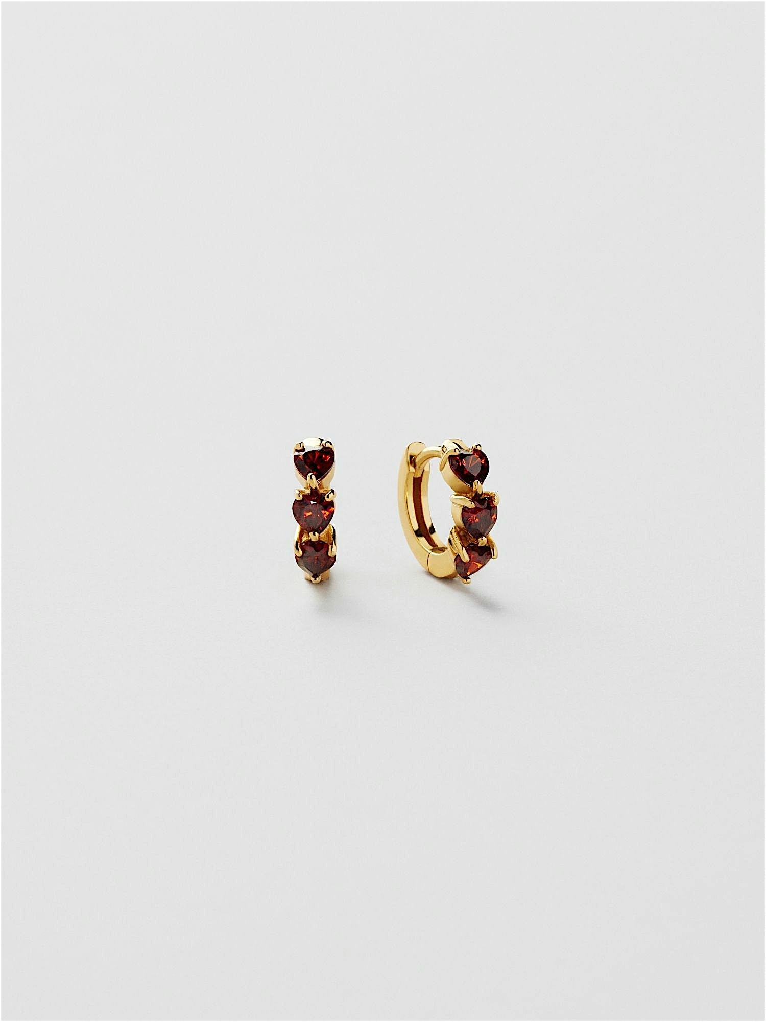 Huggie hoops in genuine 925 sterling silver, decorated with red heart-shaped Cubic Zirconia stones. The gold earrings are plated with genuine 18K gold and have a core of genuine 925 sterling silver. This product is made from 100% recycled silver.
